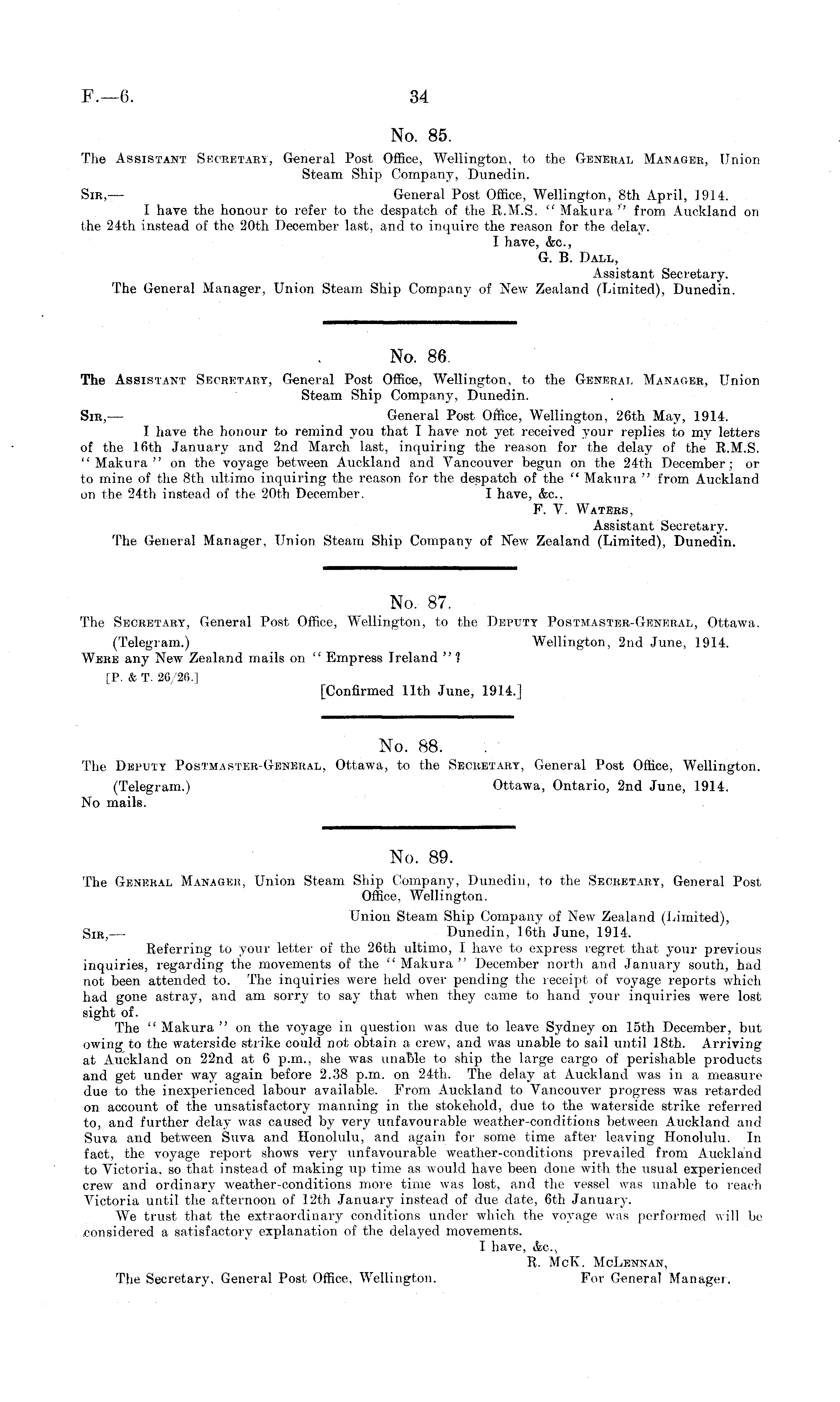No. 86. The Assistant Secretary, General Post Office, Wellington, to the General Manager, Union Steam Ship Company, Dunedin. Sir,— General Post Office, Wellington, 26th May, 1914. I have the honour to remind you that I have not yet received your replies to my letters of the 16th January and 2nd March last, inquiring the reason for the delay of the R.M.S. "Makura" on the voyage between Auckland and Vancouver begun on the 24th December; or to mine of the Bth ultimo inquiring the reason for the despatch of the " Makura " from Auckland on the 24th instead of the 20th December. I have, &c. F. V. Waters, Assistant Secretary. The General Manager, Union Steam Ship Company of New Zealand (Limited), Dunedin.