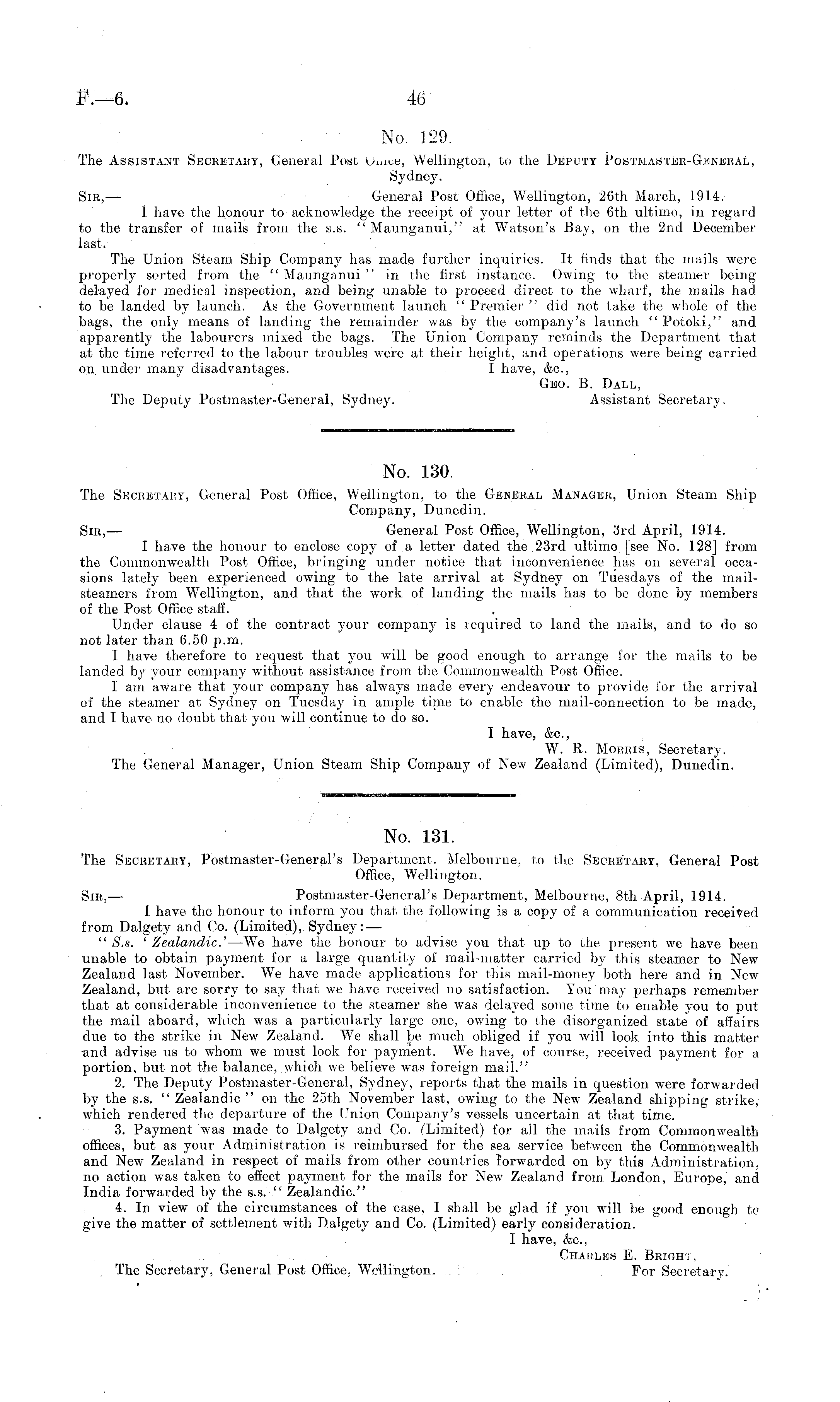 No. 131. The Secretary, Postmaster-General's Department. Melbourne, to the Secretary, General Post Office, Wellington. Sir, — Postmaster-General's Department, Melbourne, Bth April, 1914. 1 have the honour to inform you that the following is a copy of a communication received from Dalgety and Co. (Limited), Sydney: — " S.s. ' Zealandic' —We have the honour to advise you that up to the present we have been unable to obtain payment for a large quantity of mail-matter carried by this steamer to New Zealand last November. We have made applications for this mail-money both here and in New Zealand, but are sorry to say that we have received no satisfaction. You may perhaps remember that at considerable inconvenience to the steamer she was delayed some time to enable you to put the mail aboard, which was a particularly large one, owing to the disorganized state of affairs due to the strike in New Zealand. We shall be much obliged if you will look into this matter and advise us to whom we must look for payment. We have, of course, received payment for a portion, but not the balance, which we believe was foreign mail." 2. The Deputy Postmaster-General, Sydney, reports that the mails in question were forwarded by the s.s. " Zealandic " on the 25th November last, owing to the New Zealand shipping strike, which rendered the departure of the Union Company's vessels uncertain at that time. 3. Payment was made to Dalgety and Co. (Limited) for all the mails from Commonwealth offices, but as your Administration is reimbursed for the sea service between the Commonwealth and New Zealand in respect of mails from other countries forwarded on by this Administration, no action was taken to effect payment for the mails for New Zealand from London, Europe, and India forwarded by the s.s. " Zealandic." 4. In view of the circumstances of the case, I shall be glad if you will be good enough tc give the matter of settlement with Dalgety and Co. (Limited) early consideration. I have, &c, . Charles E. Bright, The Secretary, General Post Office, Wellington. For Secretary.