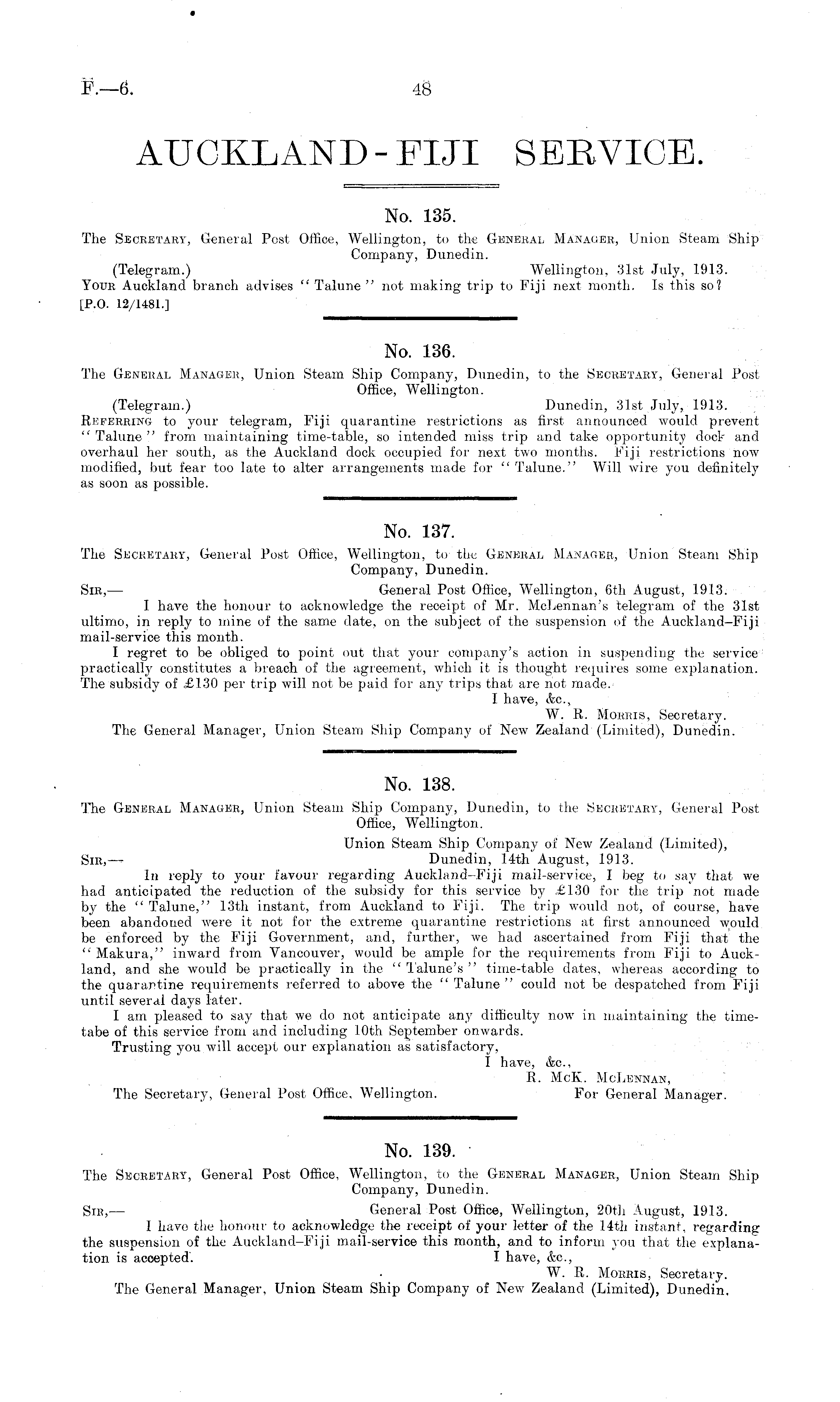 No. 139. The Secretary, General Post Office, Wellington, to the General Manager, Union Steam Ship Company, Dunedin. Sir, — General Post Office, Wellington, 20th August, 1913. I have the honour to acknowledge the receipt of your letter of the 14th instant, regarding the suspension of the Auckland-Fiji mail-service this month, and to inform you that the explanation is accepted. I have, &c, W. R. Morris, Secretary. The General Manager, Union Steam Ship Company of New Zealand (Limited), Dunedin,