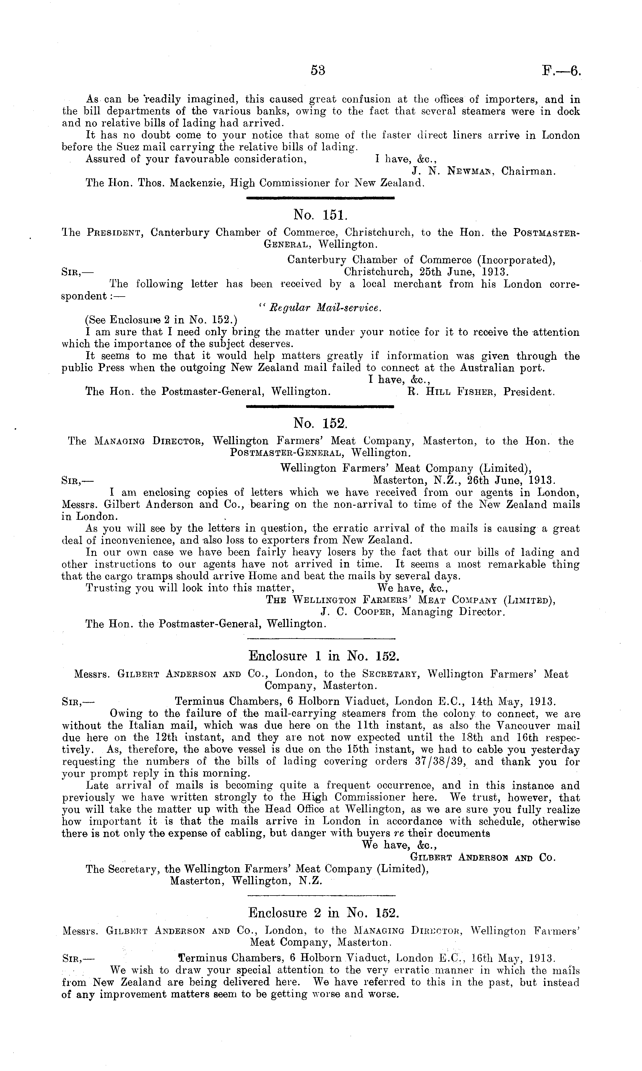No. 152. The Managing Director, Wellington Farmers' Meat Company, Masterton, to the Hon. the Postmaster-General, Wellington. Wellington Farmers' Meat Company (Limited), Sir,— Masterton, N.Z., 26th June, 1913. I am enclosing copies of letters which we have received from our agents in London, Messrs. Gilbert Anderson and Co., bearing on the non-arrival to time of the New Zealand mails in London. As you will see by the letters in question, the erratic arrival of the mails is causing a great deal of inconvenience, and also loss to exporters from New Zealand. In our own case we have been fairly heavy losers by the fact that our bills of lading and other instructions to our agents have not arrived in time. It seems a most remarkable thing that the cargo tramps should arrive Home and beat the mails by several days. Trusting you will look into this matter, We have, &c, The Wellington Farmers' Meat Company (Limited), J. C. Cooper, Managing Director. The Hon. the Postmaster-General, Wellington.