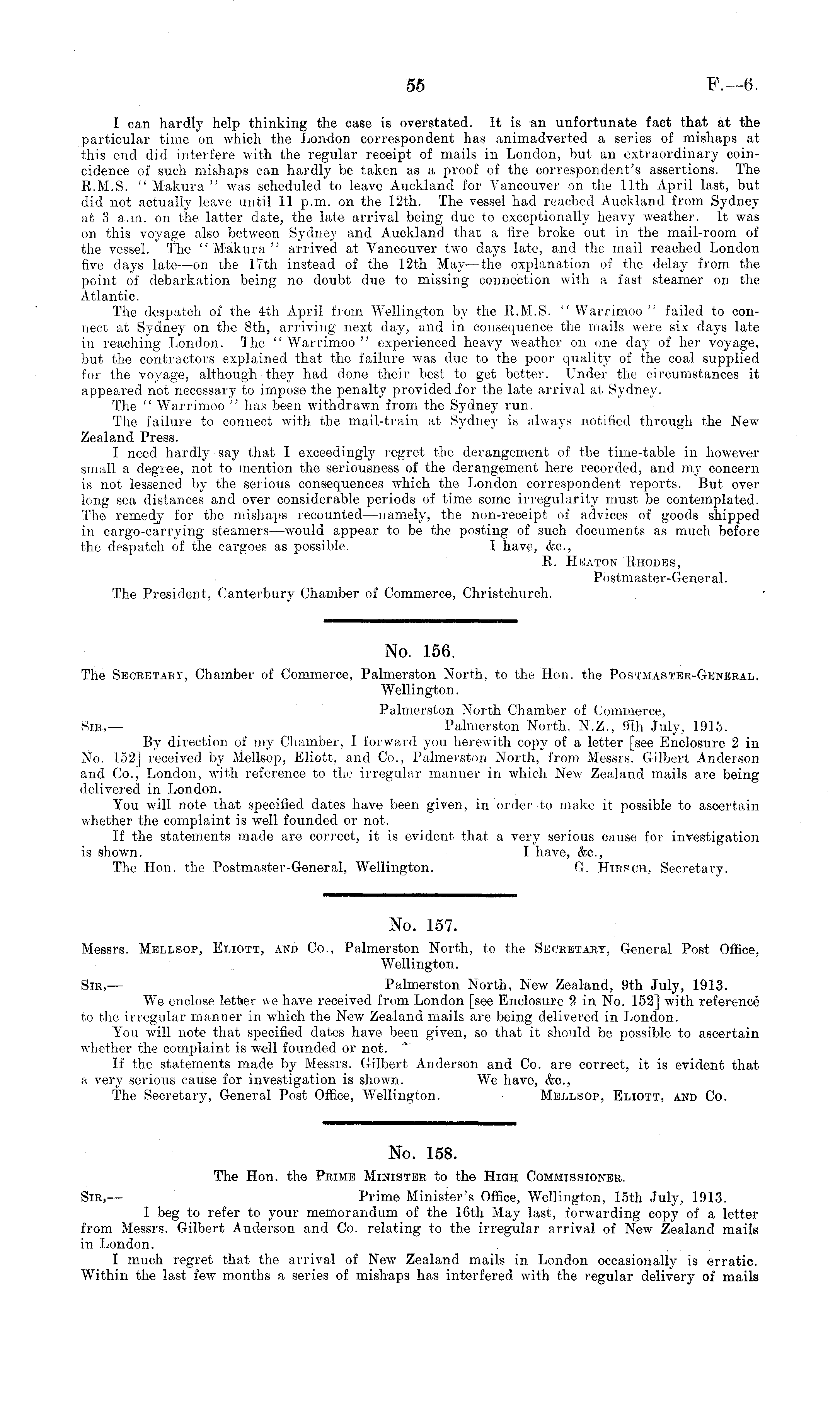 No. 157. Messrs. Mellsop, Eliott, and Co., Palmerston North, to the Secbetary, General Post Office, Wellington. Sm, — Palmerston North, New Zealand, 9th July, 1913. We enclose lether we have received from London [see Enclosure 3 in No. 152] with reference to the irregular manner in which the Now Zealand mails are being delivered in London. You will note that specified dates have been given, so that it should be possible to ascertain whether the complaint is well founded or not. If the statements made by Messrs. Gilbert Anderson and Co. are correct, it is evident that a very serious cause for investigation is shown. We have, &c, The Secretary, General Post Office, Wellington. MeJjLSOp, Eliott, and Co.