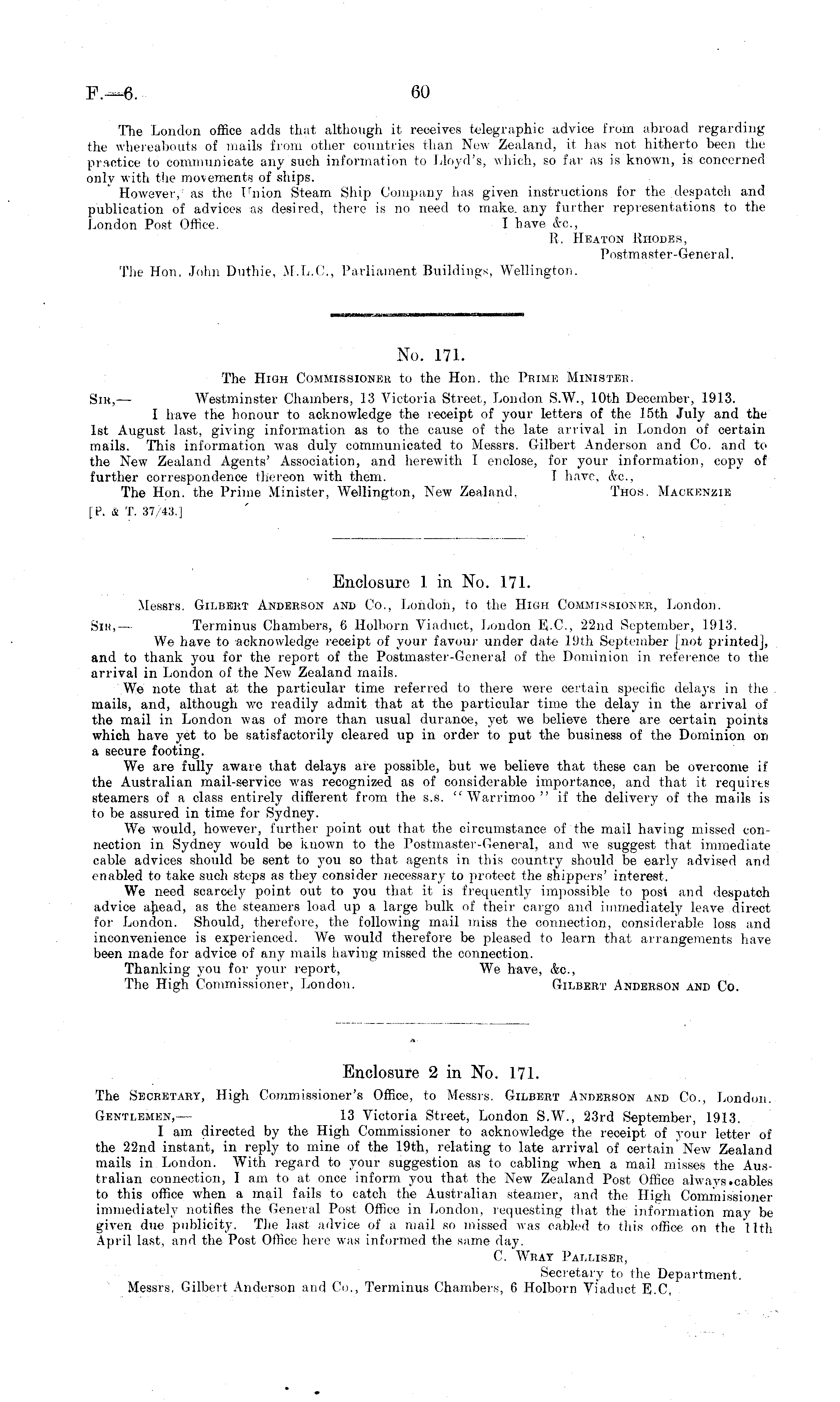 No. 171. The High Commissioneu to the Hon. the Pbime .Ministee. Sik, — AVestminster Chambers, 13 Victoria Street, London S.W., 10th December, 1913. I have the honour to acknowledge the receipt of your letters of the 15th July and the Ist August last, giving information as to the cause of the late arrival in London of certain mails. This information was duly communicated to Messrs. Gilbert Anderson and Co. and to the New Zealand Agents' Association, and herewith 1 enclose, for your information, copy of further correspondence thereon with them. I have, &c, The Hon. the Prime Minister, Wellington, New Zealand, Thos. Mackenzie [P. & T. 37/43.]