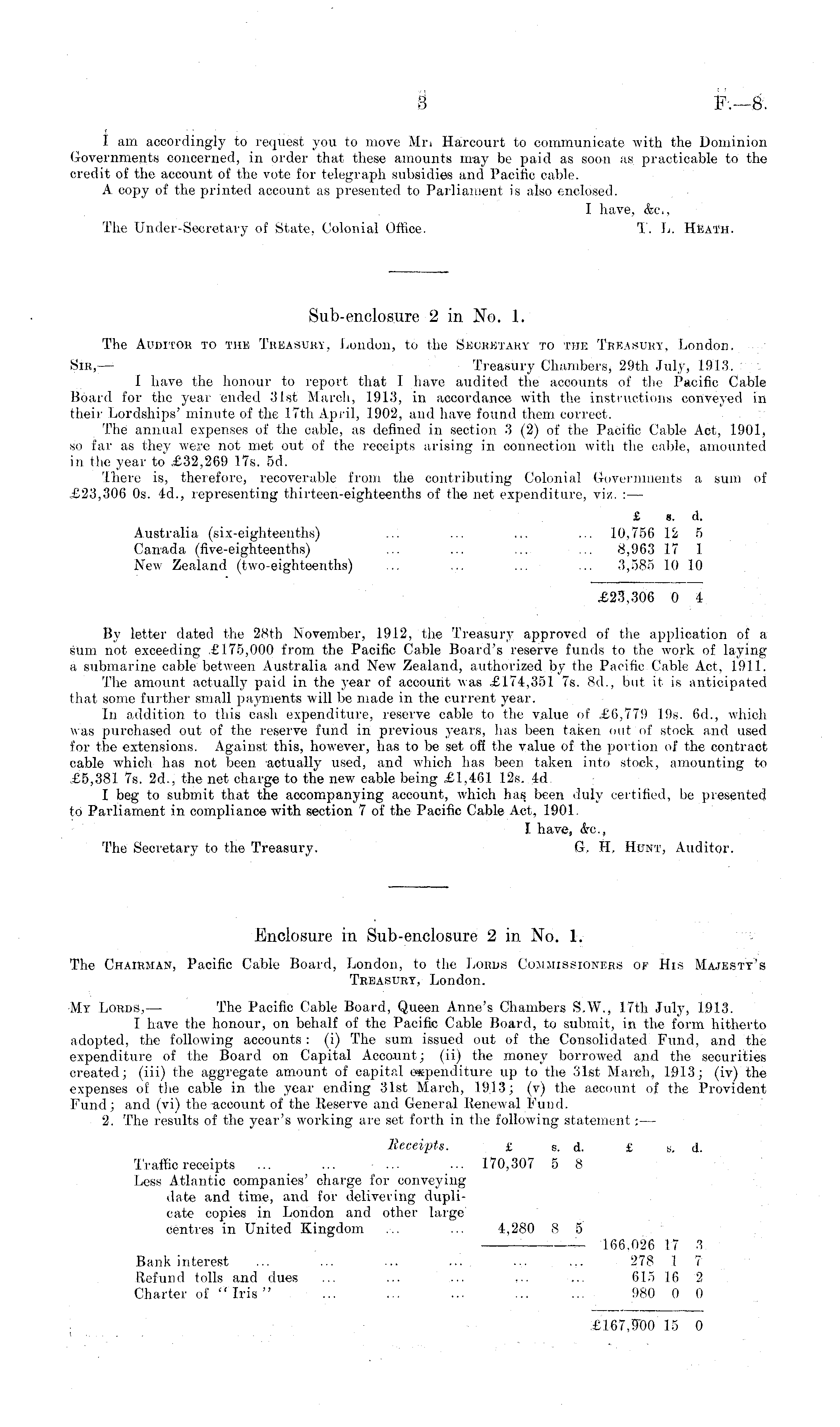 Sub-enclosure 2 in No. 1. The Auditor to the Treasury, London, to the Secretary to the Treasury, London. Sir, — Treasury Chambers, 29th July, 1913. I have the honour to report that I have audited the accounts of the Pacific Cable Board for the year ended 31st March, 1913, in accordance with the instructions conveyed in their -Lordships' minute of the 17th April, 1902, and have found them correct. The annual expenses of the cable, as defined in section 3 (2) of the Pacific Cable Act, 1901, so far as they were not met out of the receipts arising , in connection witli the cable, amounted in the year to" .£32,269 17s. sd. There is, therefore, recoverable from the contributing Colonial Governments a sum of £23,306 os. 4d., representing thirteen-eighteenths of the net expenditure, viz. : — £ s. d. Australia (six-eighteenths) ... ... ... ... 10,756 12 5 Canada (five-eighteenths) ... ... ... ... 8,963 17 1 New Zealand (two-eighteenths) ... ... ... ... .'5,585 10 10 £23,306 0 4 By letter dated the 28th November, 1912, the Treasury approved of the application of a sum not exceeding .£175,000 from the Pacific Cable Board's reserve funds to the work of laying a submarine cable between Australia and New Zealand, authorized by the Pacific Cable Act, 1911. The amount actually paid in the year of account was £174,351 7s. Bd., but it is anticipated that some further small payments will be made in the current year. In addition to this cash expenditure, reserve cable to the value of £6,779 19s, 6d., which was purchased out of the reserve fund in previous years, lias been taken out of stock and used for the extensions. Against this, however, has to be set off the value of the portion of the contract cable which has not been actually used, and which has been taken into stock, amounting to £5,381 7s. 2d., the net charge to the new cable being £1,461 12s. 4d I beg to submit that the accompanying account, which has been duly certified, be presented to Parliament in compliance with section 7 of the Pacific Cable Act, 1901. I have, &c, The Secretary to the Treasury. G, H, Hunt, Auditor. Enclosure in Sub-enclosure 2 in No. 1. The Chairman, Pacific Cable Board, London, to the Lords Commissioners of His Majesty's Treasury, London. ■My Lords, — The Pacific Cable Board, Queen Anne's Chambers S.W., 3.7 th July, 1913. I have the honour, on behalf of the Pacific Cable Board, to submit, in the form hitherto adopted, the following accounts : (i) The sum issued out of the Consolidated Fund, and the expenditure of the Board on Capital Account; (ii) the money borrowed and the securities created; (iii) the aggregate amount of capital expenditure up to the 81st March. 1913; (iv) the expenses of the cable in the year ending 31st March, 1913; (v) the account of the Provident Fund; and (vi) the account of the Reserve and General Renewal Fund. 2. The results of the year's working are set forth in the following statement; — Eeceipts. £ s. d. £ s. d. Traffic receipts ... ... ... ... 170,307 5 8 Less Atlantic companies' charge for conveying date and time, and for delivering duplicate copies in London and other large centres in United Kingdom ... ... 4,280 8 5 : -— 166,026 17 3 Bank interest ... ... ... ... ... ... 278 1 7 Refund tolls and dues ... ... ... ... ... 615 16 2 Charter of " Iris " ... ... ... 980 0 0 £167,900 15 0