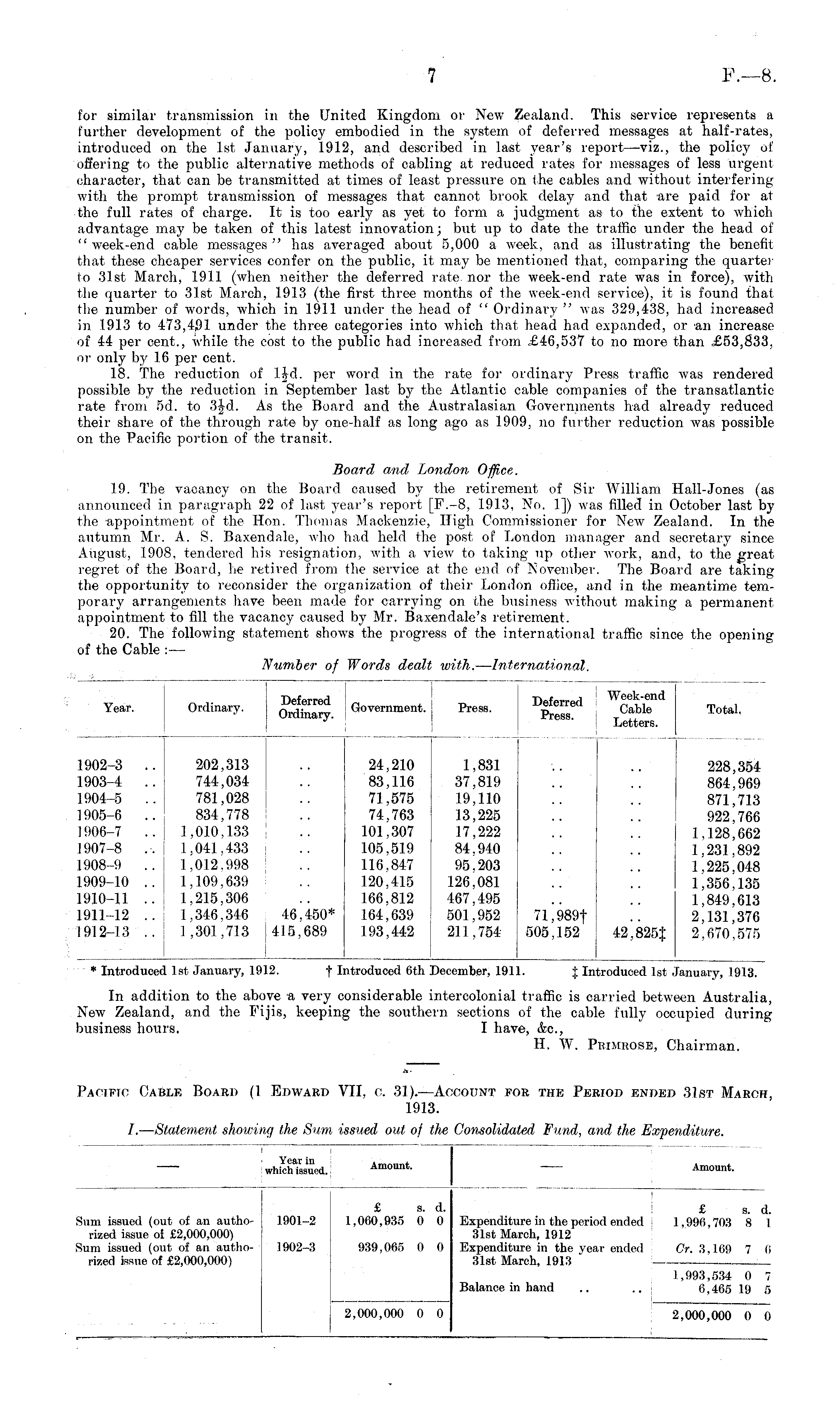 for similar transmission in the United Kingdom or New Zealand. This service represents a further development of the policy embodied in the system of deferred messages at half-rates, introduced on the Ist January, 1912, and described in last year's report—viz., the policy of offering to the public alternative methods of cabling at reduced rates for messages of less urgent character, that can be transmitted at times of least pressure on the cables and without interfering with the prompt transmission of messages that cannot brook delay and that are paid for at the full rates of charge. It is too early as yet to form a judgment as to the extent to which advantage may be taken of this latest innovation; but up to date the traffic under the head of " week-end cable messages " lias averaged about 5,000 a week, and as illustrating the benefit that these cheaper services confer on the public, it may be mentioned that, comparing the quarter to 31st March, 1911 (when neither the deferred rate, nor the week-end rate was in force), with the quarter to 31st March, 1913 (the first three months of the week-end service), it is found that the number of words, which in 1911 under the head of " Ordinary " was 329,438, had increased in 1913 to 473,491 under the three categories into which that head had expanded, or an increase of 44 per cent., while the cost to the public had increased from £46,537 to no more than £53,833, or only by 16 per cent. 18. The reduction of ljd. per word in the rate for ordinary Press traffic was rendered possible by the reduction in September last by the Atlantic cable companies of the transatlantic rate from sd. to 3jd. As the Board and the Australasian Governments had already reduced their share of the through rate by one-half as long ago as 1909, no further reduction was possible on the Pacific portion of the transit. Board and London Office. 19. The vacancy on the Board caused by the retirement of Sir William Hall-Jones (as announced in paragraph 22 of last year's report [F.-8, 1913, No. 1]) was filled in October last by the appointment of the Hon. Thomas Mackenzie, High Commissioner for New Zealand. In the autumn Mr. A. S. Baxendale, who had held the post of London manager and secretary since August, 1908, tendered his resignation, with a view to taking up other work, and, to the great regret of the Board, he retired from the service at the end of November. The Board are taking the opportunity to reconsider the organization of their London ofiice, and in the meantime temporary arrangements have been made for carrying on the business without making a permanent appointment to fill the vacancy caused by Mr. Baxendale's retirement. 20. The following statement shows the progress of the international traffic since the opening of the Cable :—