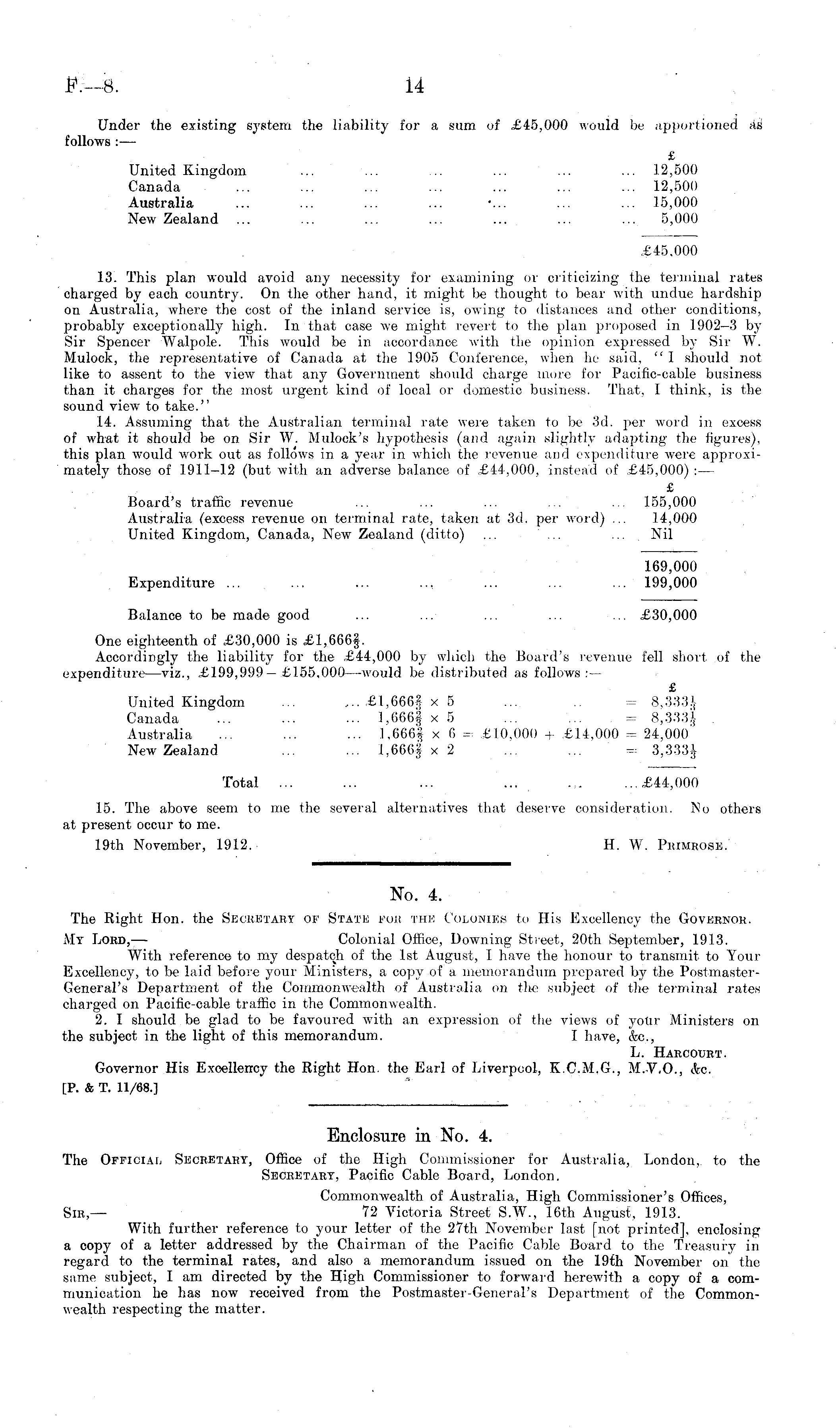 Enclosure in No. 4. The Official Secretary, Office of the High Commissioner for Australia, London, to the Secretary, Pacific Cable Board, London. Commonwealth of Australia, High Commissioner's Offices, Sir,— 72 Victoria Street S.W., 16th August, 1913. With further reference to your letter of the 27th November last [not printed], enclosing a copy of a letter addressed by the Chairman of the Pacific Cable Board to the Treasury in regard to the terminal rates, and also a memorandum issued on the 19th November on the same subject, I am directed by the High Commissioner to forward herewith a copy of a communication he has now received from the Postmaster-General's Department of the Commonwealth respecting the matter.