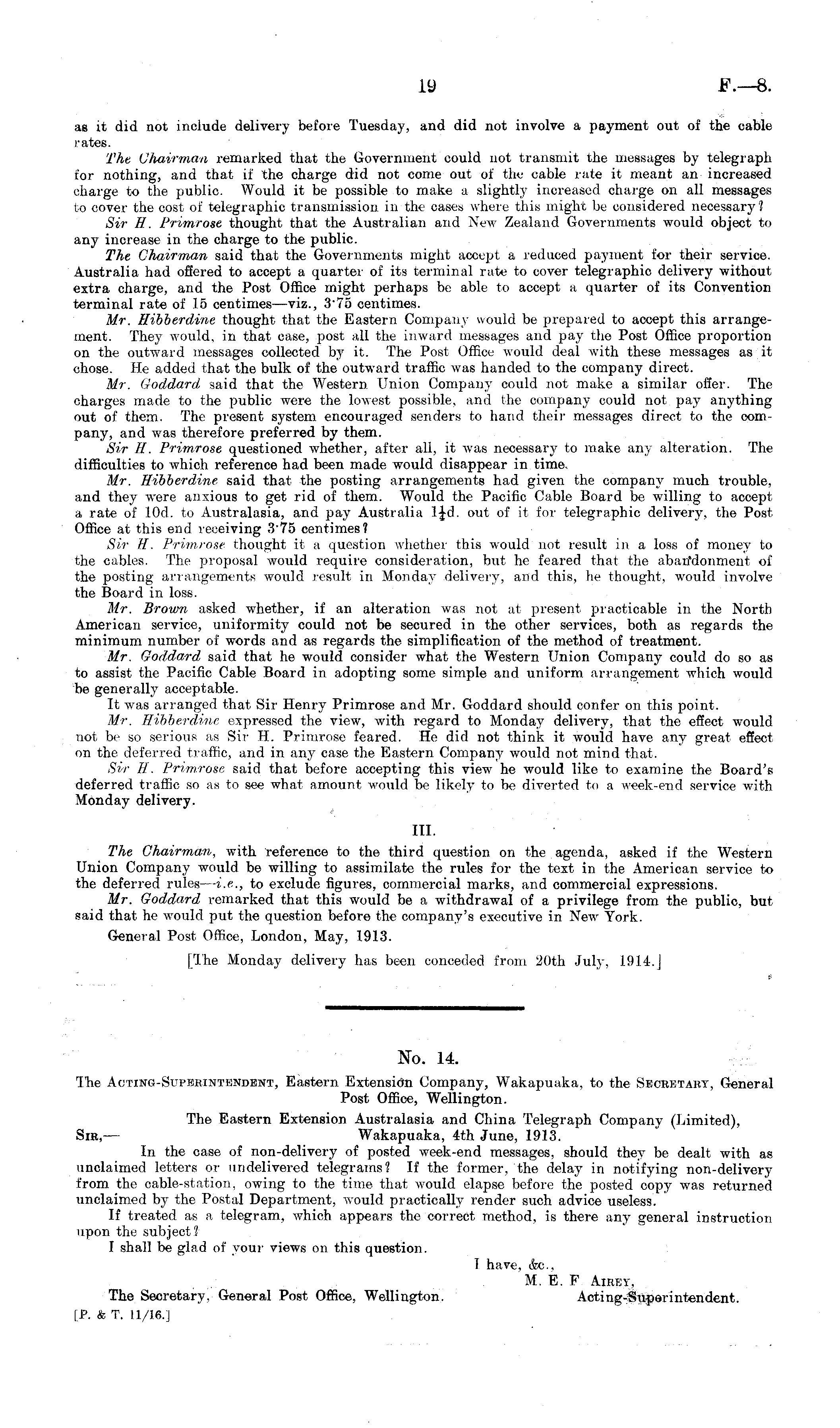 as it did not include delivery before Tuesday, and did not involve a payment out of the cable rates. The Chairman remarked that the Government could not transmit the messages by telegraph for nothing, and that if the charge did not come out of the cable rate it meant an increased charge to the public. Would it be possible to make a slightly increased charge on all messages to cover the cost of telegraphic transmission in the cases where this might be considered necessary? Sir H. Primrose thought that the Australian and New Zealand Governments would object to any increase in the charge to the public. The Chairman said that the Governments might accept a reduced payment for their service. Australia had offered to accept a quarter of its terminal rate to cover telegraphic delivery without extra charge, and the Post Office might perhaps be able to accept a quarter of its Convention terminal rate of 15 centimes —viz., 375 centimes. Mr. Hibberdine thought that the Eastern Company would be prepared to accept this arrangement. They would, in that case, post all the inward messages and pay the Post Office proportion on the outward messages collected by it. The Post Office would deal with these messages as it chose. He added that the bulk of the outward traffic was handed to the company direct. Mr. Goddard said that the Western Union Company could not make a similar offer. The charges made to the public were the lowest possible, and the company could not pay anything out of them. The present system encouraged senders to hand their messages direct to the company, and was therefore preferred by them. Sir R. Primrose questioned whether, after all, it was necessary to make any alteration. The difficulties to which reference had been made would disappear in time Mr. Hibberdine said that the posting arrangements had given the company much trouble, and they were anxious to get rid of them. Would the Pacific Cable Board be willing to accept a rate of 10d. to Australasia, and pay Australia ljd. out of it for telegraphic delivery, the Post Office at this end receiving 3"75 centimes? Sir H. Primrose, thought it a question whether this would not result in a loss of money to the cables. The proposal would require consideration, but he feared that the abandonment of the posting arrangements would result in Monday delivery, and this, he thought, would involve the Board in loss. Mr. Brown asked whether, if an alteration was not at present practicable in the North American service, uniformity could not be secured in the other services, both as regards the minimum number of words and as regards the simplification of the method of treatment. Mr. Goddard said that he would consider what the Western Union Company could do so as to assist the Pacific Cable Board in adopting some simple and uniform arrangement which would be generally acceptable. It was arranged that Sir Henry Primrose and Mr. Goddard should confer on this point. Mr. Hibberdine expressed the view, with regard to Monday delivery, that the effect would not be so serious as Sir H. Primrose feared. He did not think it would have any great effect on the deferred traffic, and in any case the Eastern Company would not mind that. Sir H. Primrose said that before accepting this view he would like to examine the Board's deferred traffic so as to see what amount would be likely to be diverted to a week-end service with Monday delivery. 111. The Chairman, with reference to the third question on the agenda, asked if the Western Union Company would be willing to assimilate the rules for the text in the American service to the deferred rules — i.e., to exclude figures, commercial marks, and commercial expressions. Mr. Goddard remarked that this would be a withdrawal of a privilege from the public, but said that he would put the question, before the company's executive in New York. General Post Office, London, May, 1913. [The Monday delivery has been conceded from 20th July, 1914. J