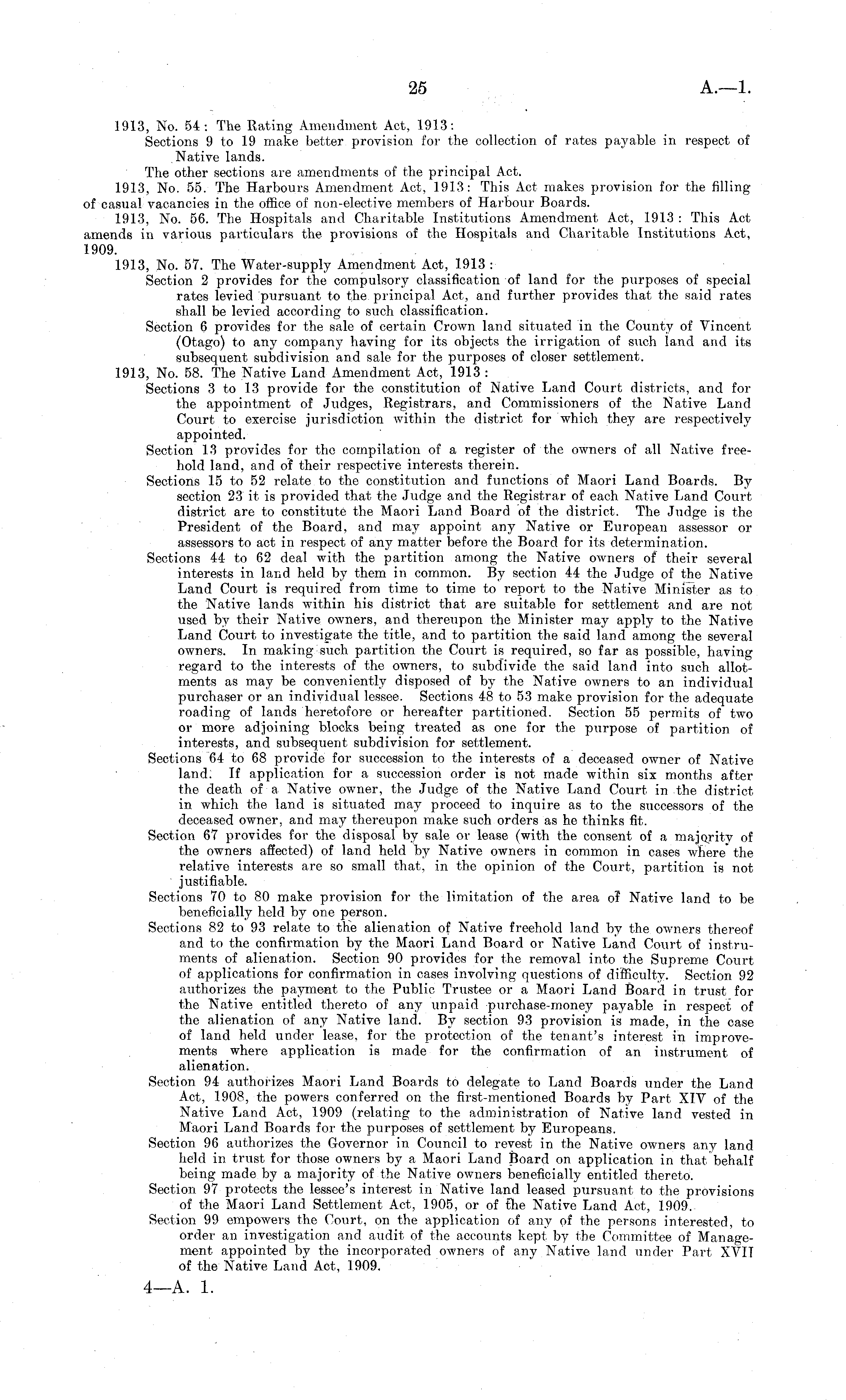 1913, No. 54: The Rating Amendment Act, 1913: Sections 9 to 19 make better provision for the collection of rates payable in respect of Native lands. The other sections are amendments of the principal Act. 1913, No. 55. The Harbours Amendment Act, 1913: This Act makes provision for the filling of casual vacancies in the office of non-elective members of Harbour Boards. 1913, No. 56. The Hospitals and Charitable Institutions Amendment Act, 1913 : This Act amends in various particulars the provisions of the Hospitals and Charitable Institutions Act, 1909. 1913, No. 57. The Water-supply Amendment Act, 1913 : Section 2 provides for the compulsory classification of land for the purposes of special rates levied pursuant to the principal Act, and further provides that the said rates shall be levied according to such classification. Section 6 provides for the sale of certain Crown land situated in the County of Vincent (Otago) to any company having for its objects the irrigation of such land and its subsequent subdivision and sale for the purposes of closer settlement. 1913, No. 58. The Native Land Amendment Act, 1913 : Sections 3 to 13 provide for the constitution of Native Land Court districts, and for the appointment of Judges, Registrars, and Commissioners of the Native Land Court to exercise jurisdiction within the district for which they are respectively appointed. Section 13 provides for the compilation of a register of the owners of all Native freehold land, and of their respective interests therein. Sections 15 to 52 relate to the constitution and functions of Maori Land Boards. By section 23 it is provided that the Judge and the Registrar of each Native Land Court district are to constitute the Maori Land Board of the district. The Judge is the President of the Board, and may appoint any Native or European assessor or assessors to act in respect of any matter before the Board for its determination. Sections 44 to 62 deal with the partition among the Native owners of their several interests in land held by them in common. By section 44 the Judge of the Native Land Court is required from time to time to report to the Native Minister as to the Native lands within his district that are suitable for settlement and are not used by their Native owners, and thereupon the Minister may apply to the Native Land Court to investigate the title, and to partition the said land among the several owners. In making such partition the Court is required, so far as possible, having regard to the interests of the owners, to subdivide the said land into such allotments as may be conveniently disposed of by the Native owners to an individual purchaser or an individual lessee. Sections 48 to 53 make provision for the adequate roading of lands heretofore or hereafter partitioned. Section 55 permits of two or more adjoining blocks being treated as one for the purpose of partition of interests, and subsequent subdivision for settlement. Sections 64 to 68 provide for succession to the interests of a deceased owner of Native land: If application for a succession order is not made within six months after the death of a Native owner, the Judge of the Native Land Court in the district in which the land is situated may proceed to inquire as to the successors of the deceased owner, and may thereupon make such orders as he thinks fit. Section 67 provides for the disposal by sale or lease (with the consent of a majority of the owners affected) of land held by Native owners in common in cases where* the relative interests are so small that, in the opinion of the Court, partition is not justifiable. Sections 70 to 80 make provision for the limitation of the area of Native land to be beneficially held by one person. Sections 82 to 93 relate to the alienation of Native freehold land by the owners thereof and to the confirmation by the Maori Land Board or Native Land Court of instruments of alienation. Section 90 provides for the removal into the Supreme Court of applications for confirmation in cases involving questions of difficulty. Section 92 authorizes the payment to the Public Trustee or a Maori Land Board in trust for the Native entitled thereto of any unpaid purchase-money payable in respect of the alienation of any Native land. By section 93 provision is made, in the case of land held under lease, for the protection of the tenant's interest in improvements where application is made for the confirmation of an instrument of alienation. Section 94 authorizes Maori Land Boards to delegate to Land Boards under the Land Act, 1908, the powers conferred on the first-mentioned Boards by Part XIV of the Native Land Act, 1909 (relating to the administration of Native land vested in Maori Land Boards for the purposes of settlement by Europeans. Section 96 authorizes the Governor in Council to revest in the Native owners any land held in trust for those owners by a Maori Land Board on application in that behalf being made by a majority of the Native owners beneficially entitled thereto. Section 97 protects the lessee's interest in Native land leased pursuant to the provisions of the Maori Land Settlement Act, 1905, or of the Native Land Act, 1909. Section 99 empowers the Court, on the application of any of the persons interested, to order an investigation and audit of the accounts kept by the Committee of Management appointed by the incorporated owners of any Native land under Part XVIT of the Native Land Act, 1909.