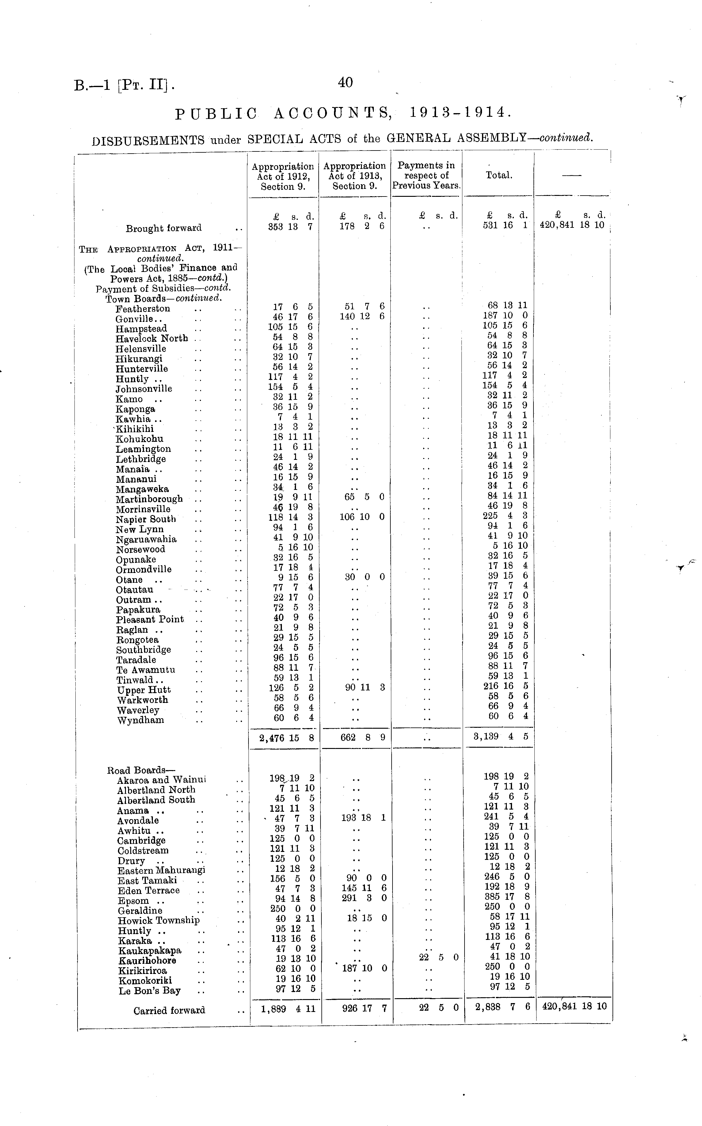 Appropriation Act of 1912, Seotion 9. Appropriation Aot of 1913, Seotion 9. Payments in respect of Previous Years. Total. Brought forward ?he Appropriation Act, 1911continued. (The Looal Bodies' Finance and Powers Act, 1885— contd.) Payment of Subsidies — contd. Town Boards— continued. Featherston Gonville Hampstead Havelock North Helensville Hikurangi Hunterville Huntly Johnsonville Kamo Kaponga Kawhia Kihikihi Kohukohu Leamington Lethbridge Manaia Mananui Mangaweka Martinborough Morrinsville Napier South New Lynn Ngaruawahia Norsewood Opunake Ormondville Otane Otautau - .. • Outram Papakura Pleasant Point Raglan Rongotea Southbridge Taradale Te Awamutu Tinwald Upper Hutt Warkworth Waverley Wyndham £ s. d. 353 13 7 £ s. d. 178 2 6 £ s. d. £ s. d. 531 16 1 £ s. d. 420,841 18 10 17 6 5 46 17 6 105 15 6 54 8 8 64 15 3 32 10 7 56 14 2 117 4 2 154 5 4 32 11 2 36 15 9 7 4 1 13 3 2 18 11 11 11 6 11 24 1 9 46 14 2 16 15 9 34 1 6 19 9 11 46 19 8 118 14 3 94 1 6 41 9 10 5 16 10 32 16 5 17 18 4 9 15 6 77 7 4 22 17 0 72 5 3 40 9 6 21 9 8 29 15 5 24 5 5 96 15 6 88 11 7 59 13 1 126 5 2 58 5 6 66 9 4 60 6 4 51 7 6 140 12 6 65 5 0 106 10 0 68 13 11 187 10 0 105 15 6 54 8 8 64 15 3 32 10 7 56 14 2 117 4 2 154 5 4 32 11 2 36 15 9 7 4 1 13 3 2 18 11 11 11 6 ll 24 1 9 46 14 2 16 15 9 34 1 6 84 14 11 46 19 8 225 4 3 94 1 6 41 9 10 5 16 10 32 16 5 17 18 4 39 15 6 77 7 4 22 17 0 72 5 3 40 9 6 21 9 8 29 15 5 24 5 5 96 15 6 88 11 7 59 13 1 216 16 5 58 5 6 66 9 4 60 6 4 30 0 0 9011 3 2,476 15 8 662 8 9 3,139 4 5 Road Boards — Akaroa and Wainui Albertland North .. Albertland South ' .. Anama Avondale Awhitu Cambridge Coldstream Drury Eastern Mahurangi East Tamaki Eden Terrace Epsom Geraldine Howick Township Huntly Karaka .. .. . • • Kaukapakapa Kaurihohore Kirikiriroa Komokoriki Le Bon's Bay 198 19 2 7 11 10 45 6 5 121 11 3 • 47 7 3 39 7 11 125 0 0 121 11 3 125 0 0 12 18 2 156 5 0 47 7 3 94 14 8 250 0 0 40 2 11 95 12 1 113 16 6 47 0 2 19 13 10 62 10 0 19 16 10 97 12 5 193 18 1 90 0 0 145 11 6 291 3 0 198 19 2 7 11 10 45 6 5 121 11 3 241 5 4 39 7 11 125 0 0 121 11 3 125 0 0 12 18 2 246 5 0 192 18 9 385 17 8 250 0 0 58 17 11 95 12 1 113 16 6 47 0 2 41 18 10 250 0 0 19 16 10 97 12 5 1815 0 22 5 0 ' 18710 0 Carried forward 1,889 4 11 926 17 7 22 5 0 2,838 7 6 420,841 18 10