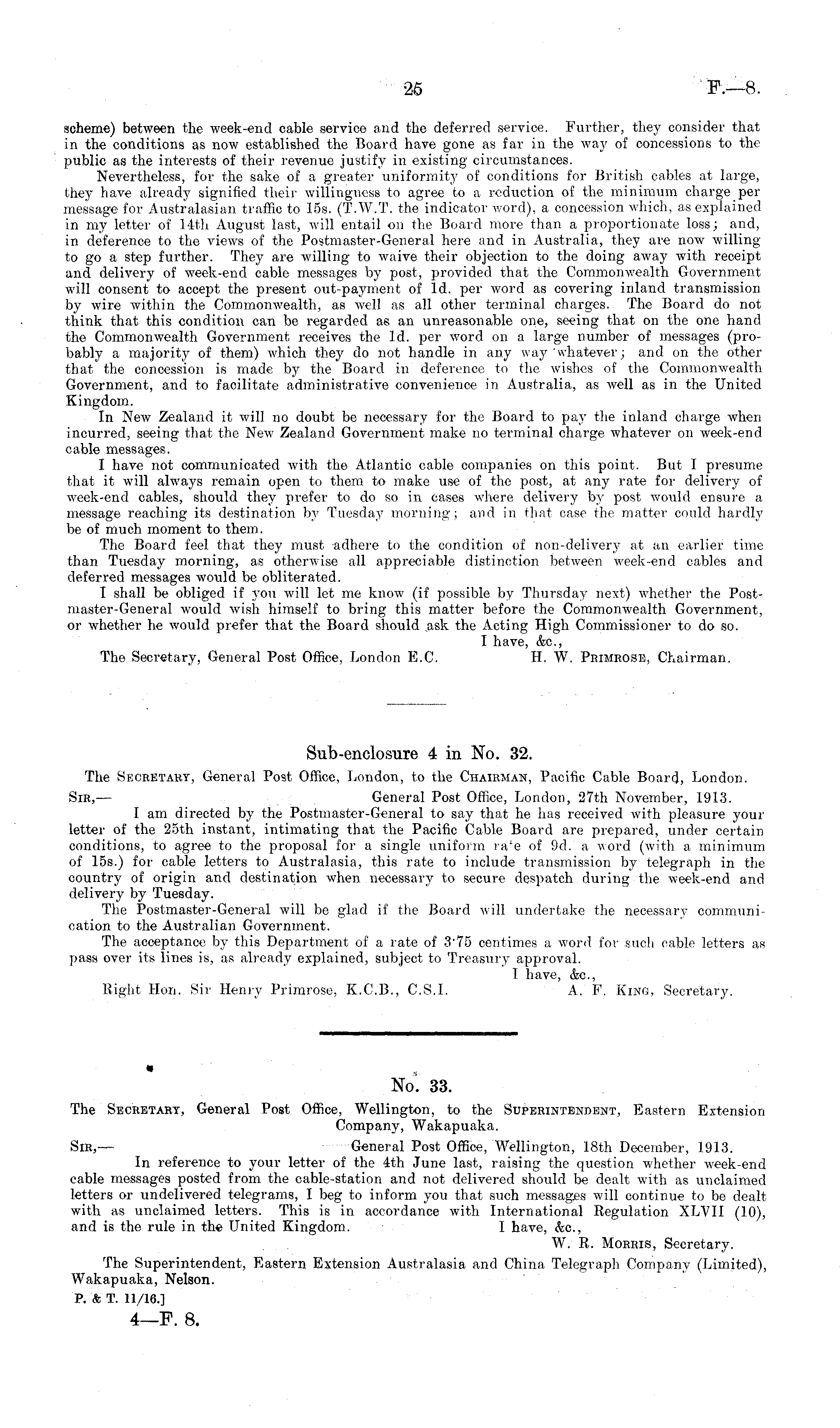 scheme) between the week-end cable service and the deferred service. Further, they consider that in the conditions as now established the Board have gone as far in the way of concessions to the public as the interests of their revenue justify in existing circumstances. Nevertheless, for the sake of a greater uniformity of conditions for British cables at large, they have already signified their willingness to agree to a reduction of the minimum charge per message for Australasian traffic to 15s. (T.W.T. the indicator word), a concession which, as explained in my letter of 14: th August last, will entail on the Board more than a proportionate loss; and, in deference to the views of the Postmaster-General here and in Australia, they are now willing to go a, step further. They are willing to waive their objection to the doing away with receipt and delivery of week-end cable messages by post, provided that the Commonwealth Government will consent to accept the present out-payment of Id. per word as covering inland transmission by wire within the Commonwealth, as well as all other terminal charges. The Board do not think that this condition can be regarded as an unreasonable one, seeing that on the one hand the Commonwealth Government receives the Id. per word on a large number of messages (probably a majority of them) which they do not handle in any way'whatever; and on the other that the concession is made by the Board in deference to the wishes of the Commonwealth Government, and to facilitate administrative convenience in Australia, as well as in the United Kingdom. In New Zealand it will no doubt be necessary for the Board to pay the inland charge when incurred, seeing that the New Zealand Government make no terminal charge whatever on week-end cable messages. I have not communicated with the Atlantic cable companies on this point. But I presume that it will always remain open to them to make use of the post, at any rate for delivery of week-end cables, should they prefer to do so in cases where delivery by post would ensure a message reaching its destination by Tuesday morning; and in that case the matter could hardly be of much moment to them. The Board feel that they must adhere to the condition of non-delivery at an earlier time than Tuesday morning, as otherwise all appreciable distinction between week-end cables and deferred messages would be obliterated. I shall be obliged if you will let me know (if possible by Thursday next) whether the Post-master-General would wish himself to bring this matter before the Commonwealth Government, or whether he would prefer that the Board should ask the Acting High Commissioner to do so. I have, <fee., The Secretary, General Post Office, London E.C. H. W. Primrose, Chairman. Sub-enclosure 4 in No. 32. The Secretary, General Post Office, London, to the Chairman, Pacific Cable Board, London. Sir, — General Post Office, London, 27th November, 1913. I am directed by the Postmaster-General to say that he has received with pleasure your letter of the 25th instant, intimating that the Pacific Cable Board are prepared, under certain conditions, to agree to the proposal for a single uniform rate of 9d. a word (with a minimum of 155.) for cable letters to Australasia, this rate to include transmission by telegraph in the country of origin and destination when necessary to secure despatch during the week-end and delivery by Tuesday. The Postmaster-General will be glad if the Board will undertake the necessary communication to the Australian Government. The acceptance by this Department of a rate of 375 centimes a word for such cable letters as pass over its lines is, as already explained, subject to Treasury approval. T have, &c., Right Hon. Sir Henry Primrose, X.C.8., C.S.I. A. F. King, Secretary.