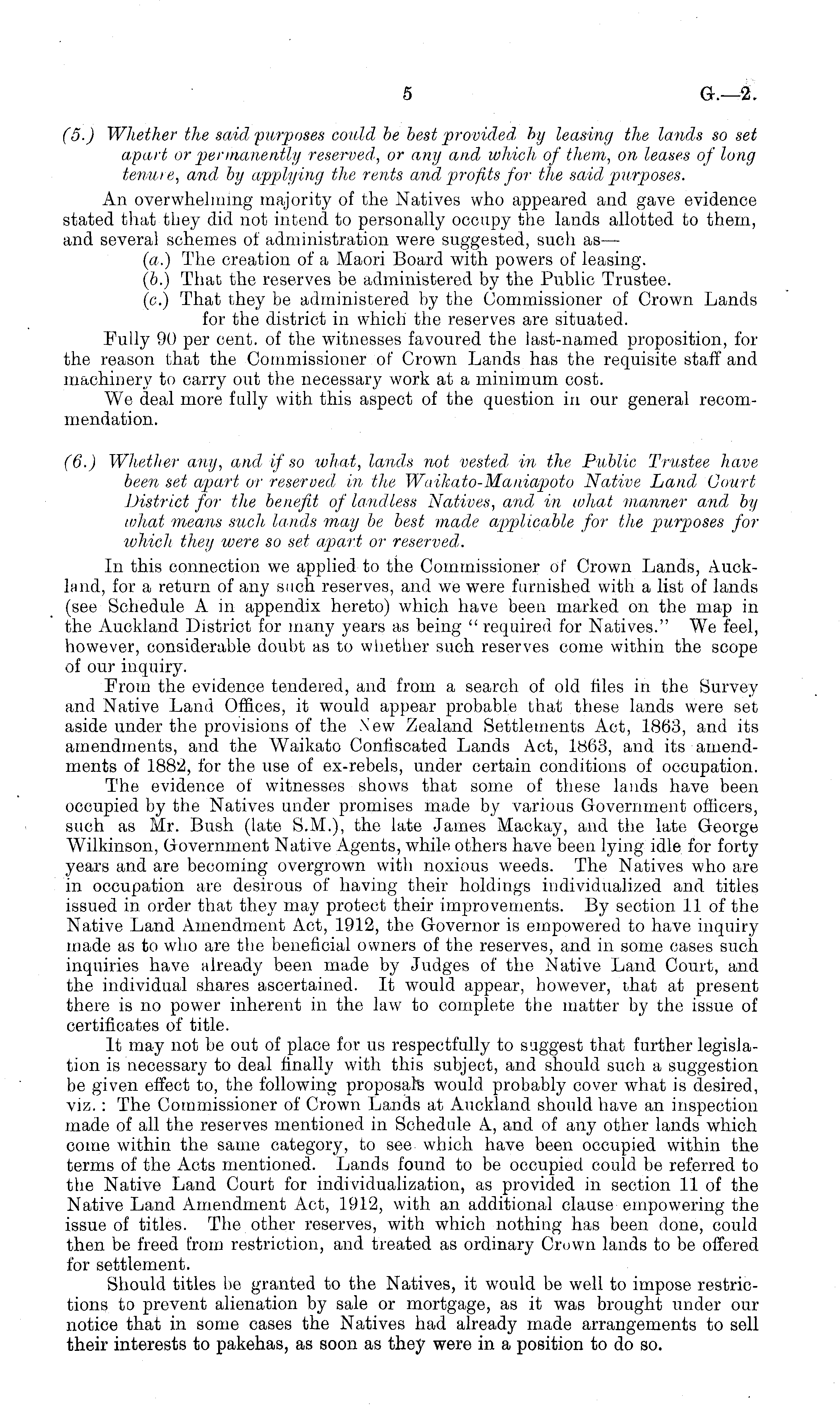 (5.) Whether the said 'purposes could be best provided, by leasing the lands so set apart or permanently reserved, or any and which of them, on leases of long tenure, and by applying the rents and, profits for the said purposes. An overwhelming majority of the Natives who appeared and gave evidence stated that they did not intend to personally occupy the lands allotted to them, and several schemes of administration were suggested, such as — (a.) The creation of a Maori Board with powers of leasing. (b.) That the reserves be administered by the Public Trustee. (c.) That they be administered by the Commissioner of Crown Lands for the district in which the reserves are situated. Fully 90 per cent, of the witnesses favoured the last-named proposition, for the reason that the Commissioner of Crown Lands has the requisite staff and machinery to carry out the necessary work at a minimum cost. We deal more fully with this aspect of the question in our general recommendation. (6.) Whether any, and if so what, lands not vested, in the Public Trustee have been set apart or reserved, in the Waikato-Maniapoto Native Land Court District for the benefit of landless Natives, and in what manner and, by what means such lands may be best made applicable for the purposes for which they were so set, apart or reserved. In this connection we applied to the Commissioner of Crown Lands, Auckland, for a return of any such reserves, and we were furnished with a list of lands (see Schedule A in appendix hereto) which have been marked on the map in the Auckland District for many years as being " required for Natives." We feel, however, considerable doubt as to whether such reserves come within the scope of our inquiry. From the evidence tendered, and from a search of old files in the Survey and Native Land Offices, it would appear probable that these lands were set aside under the provisions of the New Zealand Settlements Act, 1863, and its amendments, and the Waikato Confiscated Lands Act, 1863, and its amendments of 1882, for the use of ex-rebels, under certain conditions of occupation. The evidence of witnesses shows that some of these lands have been occupied by the Natives under promises made by various Government officers, such as Mr. Bush (late S.M.), the late James Mackay, and the late George Wilkinson, Government Native Agents, while others have been lying idle for forty years and are becoming overgrown with noxious weeds. The Natives who are in occupation are desirous of having their holdings individualized and. titles issued in order that they may protect their improvements. By section 11 of the Native Land Amendment Act, 1912, the Governor is empowered to have inquiry made as to who are the beneficial owners of the reserves, and in some cases such inquiries have already been made by Judges of the Native Land Court, and the individual shares ascertained. It would appear, however, that at present there is no power inherent in the law to complete the matter by the issue of certificates of title. It may not be out of place for us respectfully to suggest that further legislation is necessary to deal finally with this subject, and should such a suggestion be given effect to, the following proposals would probably cover what is desired, viz. : The Commissioner of Crown Lands at Auckland should have an inspection made of all the reserves mentioned in Schedule A, and of any other lands which come within the same category, to see which have been occupied within the terms of the Acts mentioned. Lands found to be occupied could be referred to the Native Land Court for individualization, as provided in section 11 of the Native Land Amendment Act, 1912, with an additional clause empowering the issue of titles. The other reserves, with which nothing has been done, could then be freed from restriction, and treated as ordinary Crown lands to be offered for settlement. Should titles be granted to the Natives, it would be well to impose restrictions to prevent alienation by sale or mortgage, as it was brought under our notice that in some cases the Natives had already made arrangements to sell their interests to pakehas, as soon as they were in a position to do so.