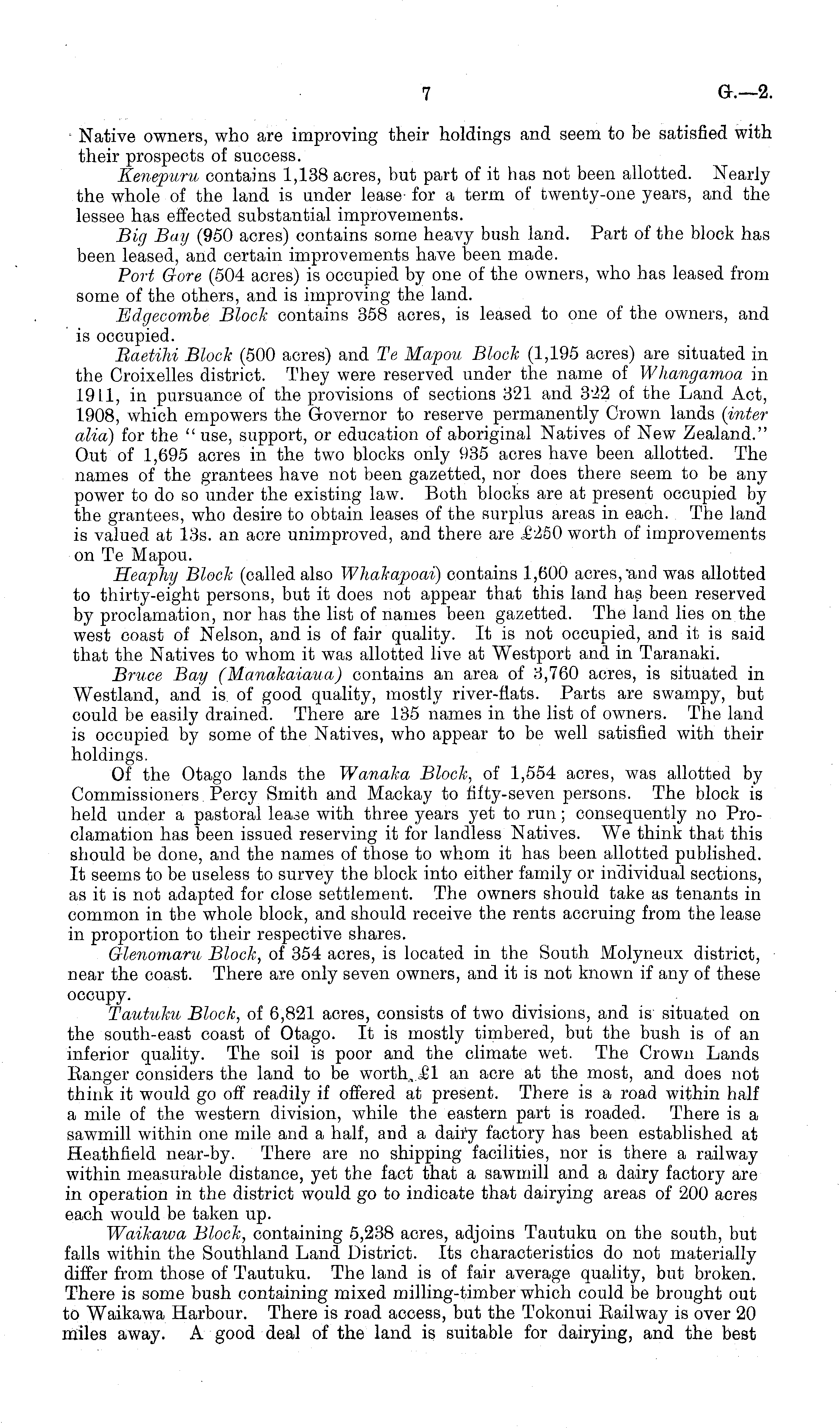 Native owners, who are improving their holdings and seem to be satisfied with their prospects of success. Kenepuru contains 1,138 acres, but part of it has not been allotted. Nearly the whole of the land is under lease- for a term of twenty-one years, and the lessee has effected substantial improvements. Big Bay (950 acres) contains some heavy bush land. Part of the block has been leased, and certain improvements have been made. Port Gore (504 acres) is occupied by one of the owners, who has leased from some of the others, and is improving the land. Edgecombe Block contains 358 acres, is leased to one of the owners, and is occupied. Baetihi Block (500 acres) and Te Mapou Block (1,195 acres) are situated in the Croixelles district. They were reserved under the name of Whangamoa in 19 LI, in pursuance of the provisions of sections 321 and 322 of the Land Act, 1908, which empowers the Governor to reserve permanently Crown lands {inter alia) for the " use, support, or education of aboriginal Natives of New Zealand." Out of 1,695 acres in the two blocks only 935 acres have been allotted. The names of the grantees have not been gazetted, nor does there seem to be any power to do so under the existing law. Both blocks are at present occupied by the grantees, who desire to obtain leases of the surplus areas in each. The land is valued at 13s. an acre unimproved, and there are £250 worth of improvements on Te Mapou. Heaphy Block (called also Whakapoai) contains 1,600 acres/and was allotted to thirty-eight persons, but it does not appear that this land has been reserved by proclamation, nor has the list of names been gazetted. The land lies on the west coast of Nelson, and is of fair quality. It is not occupied, and it is said that the Natives to whom it was allotted live at Westport and in Taranaki. Bruce Bay (Manakaiaua) contains an area of 3,760 acres, is situated in Westland, and is of good quality, mostly river-flats. Parts are swampy, but could be easily drained. There are 135 names in the list of owners. The land is occupied by some of the Natives, who appear to be well satisfied with their holdings. Of the Otago lands the Wanaka Block, of 1,554 acres, was allotted by Commissioners Percy Smith and Mackay to fifty-seven persons. The block is held under a pastoral lease with three years yet to run; consequently no Proclamation has been issued reserving it for landless Natives. We think that this should be done, and the names of those to whom it has been allotted published. It seems to be useless to survey the block into either family or individual sections, as it is not adapted for close settlement. The owners should take as tenants in common in the whole block, and should receive the rents accruing from the lease in proportion to their respective shares. Glenomaru Block, of 354 acres, is located in the South Molyneux district, near the coast. There are only seven owners, and it is not known if any of these occupy. Tautuku Block, of 6,821 acres, consists of two divisions, and is situated on the south-east coast of Otago. It is mostly timbered, but the bush is of an inferior quality. The soil is poor and the climate wet. The Crown Lands Ranger considers the land to be worth, £1 an acre at the most, and does not think it would go off readily if offered at present. There is a road within half a mile of the western division, while the eastern part is roaded. There is a sawmill within one mile and a half, and a dairy factory has been established at Heathfield near-by. There are no shipping facilities, nor is there a railway within measurable distance, yet the fact that a sawmill and a dairy factory are in operation in the district would go to indicate that dairying areas of 200 acres each would be taken up. Waikawa Block, containing 5,238 acres, adjoins Tautuku on the south, but falls within the Southland Land District. Its characteristics do not materially differ from those of Tautuku. The land is of fair average quality, but broken. There is some bush containing mixed milling-timber which could be brought out to Waikawa Harbour. There is road access, but the Tokonui Railway is over 20 miles away. A good deal of the land is suitable for dairying, and the best