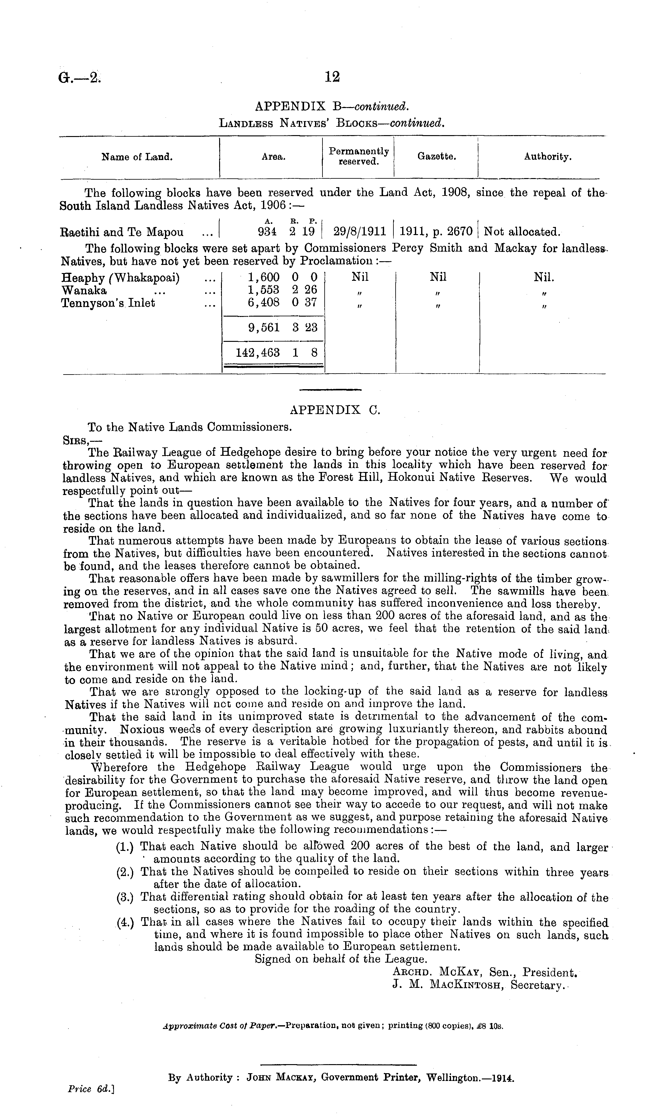 APPENDIX C. To the Native Lands Commissioners. Sirs, — The Railway League of Hedgehope desire to bring before your notice the very urgent need for throwing open to European settlement the lands in this locality which have been reserved for landless Natives, and which are known as the Forest Hill, Hokonui Native Reserves. We would respectfully point out — That the lands in question have been available to the Natives for four years, and a number of the sections have been allocated and individualized, and so far none of the Natives have come to reside on the land. That numerous attempts have been made by Europeans to obtain the lease of various sections from the Natives, but difficulties have been encountered. Natives interested in the sections cannot be found, and the leases therefore cannot be obtained. That reasonable offers have been made by sawmillers for the milling-rights of the timber growing on the reserves, and in all cases save one the Natives agreed to sell. The sawmills have been removed from the district, and the whole community has suffered inconvenience and loss thereby. That no Native or European could live on less than 200 acres of the aforesaid land, and as the largest allotment for any individual Native is 50 acres, we feel that the retention of the said land, as a reserve for landless Natives is absurd. That we are of the opinion that the said land is unsuitable for the Native mode of living, and the environment will not appeal to the Native mind; and, further, that the Natives are not likely to come and reside on the land. That we are strongly opposed to the locking-up of the said land as a reserve for landless Natives if the Natives will net come and reside on arid improve the land. That the said land in its unimproved state is detrimental to the advancement of the community. Noxious weeds of every description are growing luxuriantly thereon, and rabbits abound in their thousands. The reserve is a veritable hotbed for the propagation of pests, and until it is. closely settled it will be impossible to deal effectively with these. Wherefore the Hedgehope Railway League would urge upon the Commissioners the desirability for the Government to purchase the aforesaid Native reserve, and throw the land open for European settlement, so that the land may become improved, and will thus become revenueproducing. If the Commissioners cannot see their way to accede to our request, and will not make such recommendation to the Government as we suggest, and purpose retaining the aforesaid Native lands, we would respectfully make the following recommendations:— (1.) That each Native should be allowed 200 acres of the best of the land, and larger ' amounts according to the quality of the land. (2.) That the Natives should be compelled to reside on their sections within three years after the date of allocation. (3.) That differential rating should obtain for at least ten years after the allocation of the sections, so as to provide for the roading of the country. (4.) That in all cases where the Natives fail to occupy their lands within the specified time, and where it is found impossible to place other Natives on such lands, such lands should be made available to European settlement. Signed on behalf of the League. Archd. McKay, Sen., President. J. M. Mackintosh, Secretary. Approximate Cost of Paper.— Preparation, not given; printing (800 copies), £8 10s.