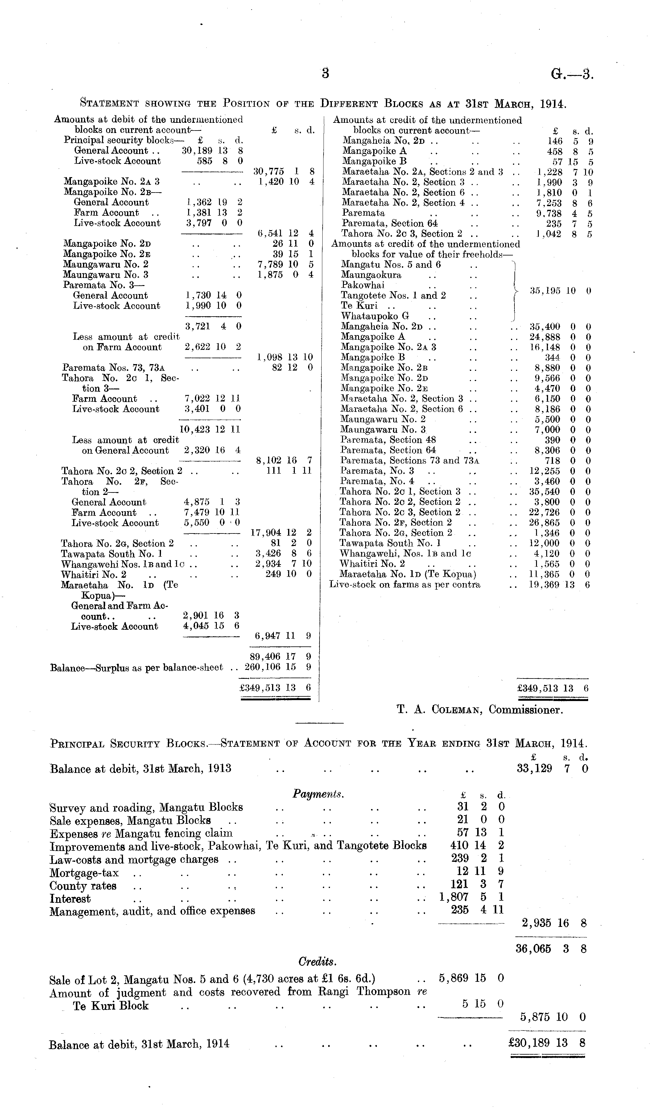 Statement showing the Position of the Different Blocks as at 31st March, 1914. Amounts at debit of the undermentioned j Amounts at credit of the undermentioned blocks on current account — £ s. d. blocks on current account — £ s. d. Principal security blocks— £ s. d. Mangaheia No, 2d .. . . . . 146 5 9 General Account .. 30,189 13 8 Mangapoike A .. .. .. 458 8 5 Live-stock Account 585 8 0 Mangapoike B .. .. . . 57 15 5 30,775 I 8 Maraetaha No. 2a, Sections 2 and 3 .. 1,228 7 10 Mangapoike No. 2a 3 .. .. 1,420 10 4 Maraetaha No. 2, Section 3.. .. 1,990 3 9 Mangapoike No. 2b— Maraetaha No. 2, Section 6.. .. 1 ,810 0 I General Account 1,362 19 2 Maraetaha No. 2, Section 4.. .. 7,253 8 6 Farm Account .. I. ,381 13 2 Paremata .. .. .. 9.738 4 5 Live-stock Account 3,797 0 0 Paremata, Section 64 .. .. 235 7 5 6,541 12 4 Tahora No. 2c 3, Section 2 .. .. J ,042 8 5 Mangapoike No. 2d .. .. 26 11 0 Amounts at credit of the undermentioned Mangapoike No. 2e .. ... 39 15 1 blocks for value of their freeholds — Maungawaru No. 2 .. .. 7,789 10 5 Mangatu Nos. 5 and 6 .. ] Maungawaru No. 3 .. .. 1,875 0 4 Maungaokura Paremata No. 3 — Pakowhai .. .. I Qt , ]Q _ lft „ General Account 1,730 14 0 Tangotete Nos. 1 and 2 .. r dO,iyo 1U 0 Live-stock Account .1,990 10 0 Te Kuri .. Whataupoko G 3,721 4 0 Mangaheia No. 2d .. .. .. 35,400 0 0 Less amount at credit Mangapoike A .. .. .. 24,888 0 0 on Farm Account 2,622 10 2 Mangapoike No. 2a 3 .. .. 16,148 0 0 J. ,098 13 10 Mangapoike B .. .. .. 344 0 0 Paremata Nos. 73, 73a .. .. 82 12 0 Mangapoike No. 2b .. .. 8,880 0 0 Tahora No. 2o 1, Sec- Mangapoike No. 2d .. .. 9,566 0 0 tion 3— . Mangapoike No. 2is .. .. 4,470 0 0 Farm Account .. 7,022 12 11 Maraetaha No. 2, Section 3 .. .. 6,150 0 0 Live-stock Account 3,401 0 0 Maraetaha No. 2, Section 6 .. .. 8,186 0 0 Maungawaru No. 2 .. .. 5,500 0 0 10,423 12 11. Maungawaru No. 3 .. .. 7,000 0 0 Less amount at credit Paremata, Section 48 .. . . 390 0 0 on General Account 2,320 16 4 Paremata, Section 64 .. .. 8,306 0 0 8,102 16 7 Paremata, Sections 73 and 73a .. 718 0 0 Tahora No. 2c 2, Section 2 .. .. 11l 111 Paremata, No. 3 .. .. .. 12,255 0 0 Tahora No. 2v, Sec- Paremata, No. 4 .. .. .. 3,460 0 0 tion 2— Tahora No. 2o 1, Section 3 .. .. 35,540 0 0 General Account 4,875 1 3 Tahora No. 2o 2, Section 2 .. .. 3,800 0 0 Farm Account .. 7,479 10 11 Tahora No. 2c 3, Section 2 .. .. 22,726 0 0 Live-stock Account 5,550 0 0 Tahora No. 2f, Section 2 .. .. 26,865 0 0 17,904 12 2 Tahora No. 2q, Section 2 .. .. 1,346 0 0 Tahora No. 2a, Section 2 .. .. 81 2 0 Tawapata South No. 1 .. .. 12,000 0 0 Tawapata South No. 1 .. .. 3,426 8 6 Whangawehi, Nos. IB and le .. 4,120 0 0 WhangawehiNos. lßandlc .. .. 2,934 710 Whaitiri No. 2 .. .. .. 1.565 0 0 WhaitiriNo. 2 .. .. .. 249 10 0 Maraetaha No. Id (Te Kopua) .. 11,365 0 0 Maraetaha No. Id (Te Live-stock on farms as per contra .. 19,369 13 6 Kopua)— General and Farm Account.. .. 2,901 16 3 Live-stock Account 4,045 15 6 6,947 11 9 89,406 17 9 Balance—Surplus as per balance-sheet .. 260,106 15 9 £349,513 13 6 £349,513 13 6 T. A. Coleman, Commissioner. Principal Security Blocks. —Statement of Account for the Year ending 31st March, 1914. £ s. d. Balance at debit, 31st March, 1913 .. .. .. .. .. 33,129 7 0 Payments. £ s . d. Survey and roading, Mangatu Blocks .. .. .. .. 31 2 0 Sale expenses, Mangatu Blocks .. .. .. .. .. 21 0 0 Expenses re Mangatu fencing claim .. .. .. .. 57 13 1 Improvements and live-stock, Pakowhai, Te Kuri, and Tangotete Blocks 410 14 2 Law-costs and mortgage charges .. .. .. .. .. 239 2 1 Mortgage-tax .. .. .. .. .. .. .. 12 11 9 County rates .. .. •, • • • ■ ■ • • • 121 3 7 Interest • 1,807 5 1 Management, audit, and office expenses . . .. .. .. 235 411 2,935 16 8 36,065 3 8 Credits. Sale of Lot 2, Mangatu Nos. 5 and 6 (4,730 acres at £1 6s. 6d.) .. 5,869 15 0 Amount of judgment and costs recovered from Rangi Thompson re Te Kuri Block .. .. .. • • • • • • 515 0 5,875 10 0 Balance at debit, 31st March, 1914 £30,189 13 8
