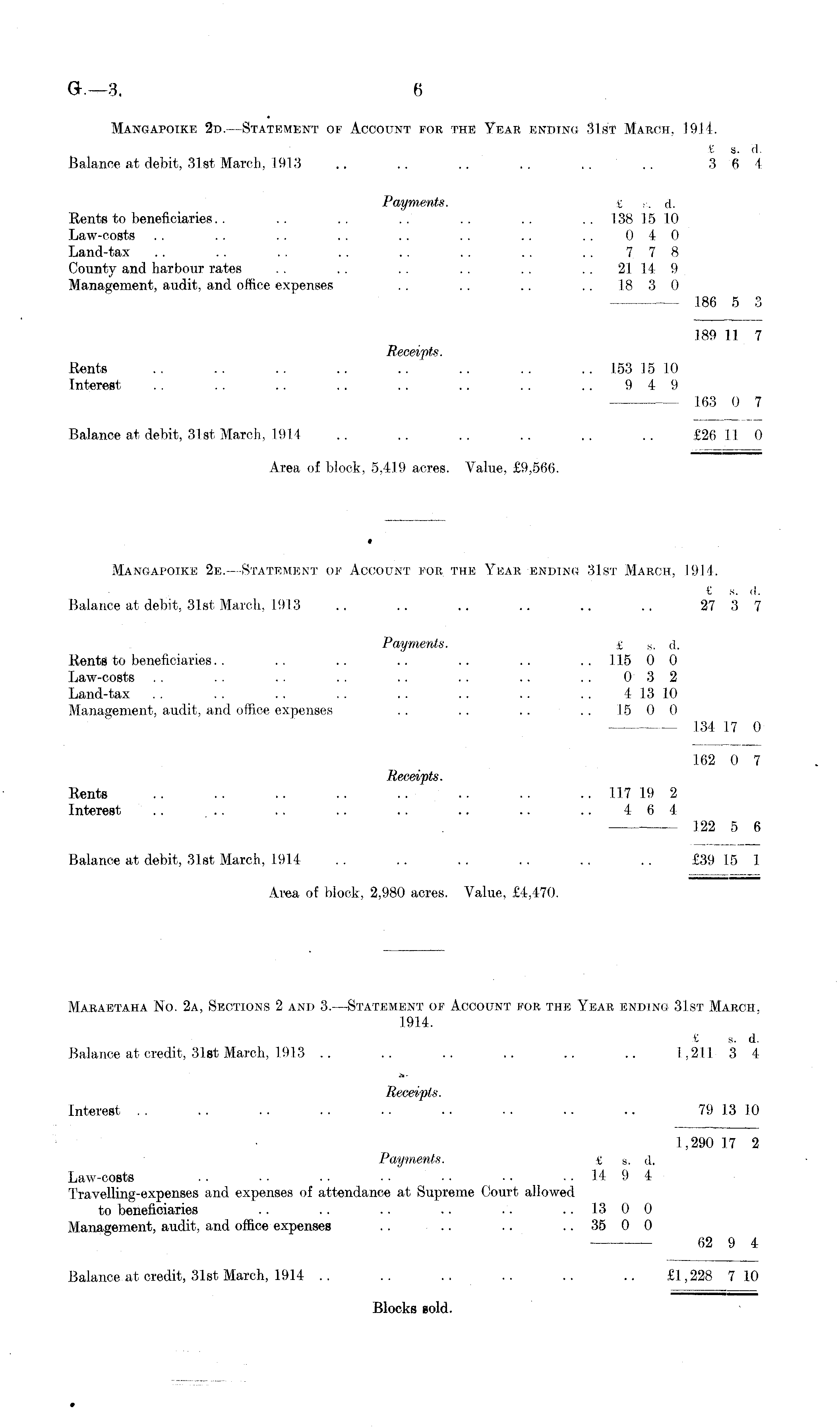 Mangapoike 2d.—Statement of Account for the Year ending 31st March. 1914. E s. d. Balance at debit, 31st March, 1913 .. .. .. .. .. .. 3 6 4 Payments. t ; . d. Rents to beneficiaries. . . . .. .. . . . . .. 138 15 10 Law-costs .. .. .. .. .. .. .. .. 040 Land-tax .. .. .. .. .. .. .. .. 778 County and harbour rates .. .. .. .. .. .. 21 14 9 Management, audit, and office expenses . . . . .. .. 18 3 0 186 5 3 189 11 7 Receipts. Rents .. .. .. .. .. .. .. .. 153 15 10 Interest . . .. .. .. .. .. .. .. 9 4 9 163 0 7 Balance at debit, 31st March, 1914 .. .. .. .. .. .. £26 II 0 Area of block, 5,419 acres. Value, £9,566. # Mangapoike 2e.—Statement of Account for the Year ending 31st March, 1914. £ s. (I. Balance at debit, 31st March, 1913 .. .. .. .. .. .. 27 3 7 Payments. t s . d. Rents to beneficiaries. . .. .. .. .. .. 115 0 0 Law-costs .. .. .. .. .. .. .. .. 0 3 2 Land-tax . . . . . . . . .. .. .. 4 13 10 Management, audit, and office expenses . . .. .. .. 15 0 0 134 17 o 162 0 7 Receipts. Rents .. .. .. .. .. .. .. .. 117 19 2 Interest .. .. .. .. .. .. .. .. 4 6 4 122 5 6 Balance at debit, 31st March, 1914 .. .. .. .. .. .. £39 15 1 Area of block, 2,980 acres. Value, £4,470. Maraetaha No. 2a, Sections 2 and 3.—Statement of Account for the Year ending 31st March. 1914, £ s. d. Balance at credit, 31st March, 1913 .. .. .. .. .. .. 1,211 3 4 Receipts. Interest .. .. .. .. .. .. .. .. .. 79 13 10 1,290 1.7 2 Payments. *t s . d. Law-costs .. .. . . • • . • • • ..1494 Travelling-expenses and expenses of attendance at Supreme Court allowed to beneficiaries .. .. .. .. .. 13 0 0 Management, audit, and office expenses .. .. .. .. 35 0 0 62 9 4 Balance at credit, 31st March, 1914 .. .. .. .. .. .. £1,228 7 10 Blocks sold.