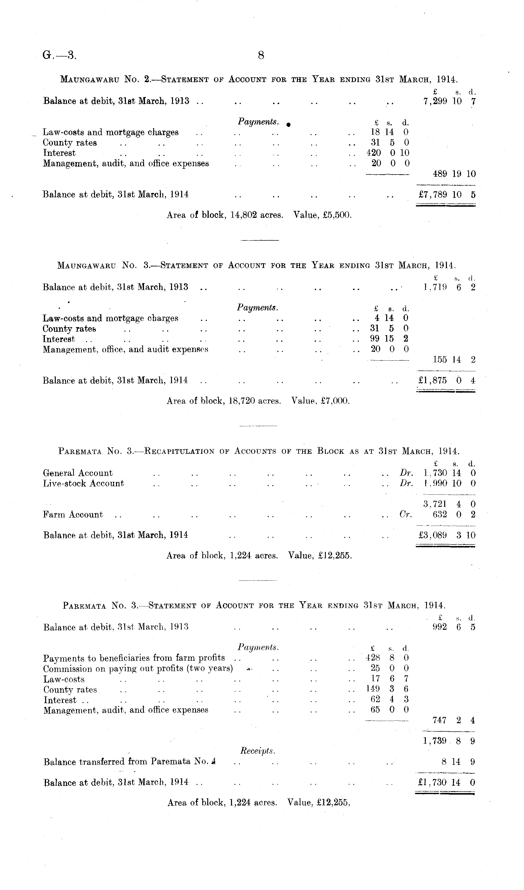 Maungawaru No. 2.—Statement of Account for the Year ending 31st March, 1914. £ s. d. Balance at debit, 31st March, 1913 .. .. .. .. .. .. 7,299 10 7 Payments. , £ s. d. Law-costs and mortgage charges .. .. .. .. .. 18 14 0 County rates .. .. .. .. .. .. 31 5 0 Interest .. .. .. .. .. .. 420 0 10 Management, audit, and office expenses . . . . .. 20 0 0 489 19 10 Balance at debit, 31st March, 1914 .. .. .. .. .. £7,789 10 5 Area of block, 1.4,802 acres. Value, £5,500. Maungawaru No. 3.—Statement of Account for the Year ending 31st March, 1914, £ s. d. Balance at debit, 31st March, 1913 .. .. .. .. .. ..- 1.719 6 2 Payments. £ s . d. Law-costs and mortgage charges .. .. .. .. 414 0 County rates .. .. .. .. .. .. 31 5 0 Interest .. .. .. .. .. .. .. 99 15 2 Management, office, and audit expenses .. . . .. 20 0 0 155 14 2 Balance at debit, 31st March, 1914 .. .. .. .. .. .. £1,875 0 4 Area of block, 18,720 acres. Value, £7,000. Paremata No. 3.- -Recapitulation of Accounts of the Block as at 31st March, 1914. £ s. d. General Account .. .. .. .. .. .. .. Dr. 1.730 14 0 Live-stock Account .. .. .. .. ..• .. ..Dr. 1.99010 0 3.721 4 0 Farm Account .. . . .. . . .. . . .. . . Cr. 632 0 2 Balance at debit, 31st March, 1914 .. .'. .. .. .. £3,089 3 10 Area of block, 1,224 acres. Value, £12,255. Paremata No. 3. -Statement of Account for the Year ending 31st March, 1914. £ s. d. Balance at debit, 31st March. 1913 .. .. .. .. .. 992 6 5 Payments. I s. d. Payments to beneficiaries from farm profits .. . . . . . . 428 8 0 Commission on paying out profits (two years) . . .. 25 0 0 Law-costs .. .. .. •■ •■ ■■ •■ 1767 County rates .. .. .. .. .. .. .. 149 3 6 Interest . . . . . . .. .. ' .. .. .. 62 4 3 Management, audit, and office expenses . . . . . . 65 0 0 747 2 4 1,739 8 9 Receipts. Balance transferred from Paremata No. A .. .. .. .. .. 8149 Balance at debit, 31st March, 1914 .. .. .. .. .. .. £1,730 14 0 Area of block, 1,224 acres. Value, £12,255,