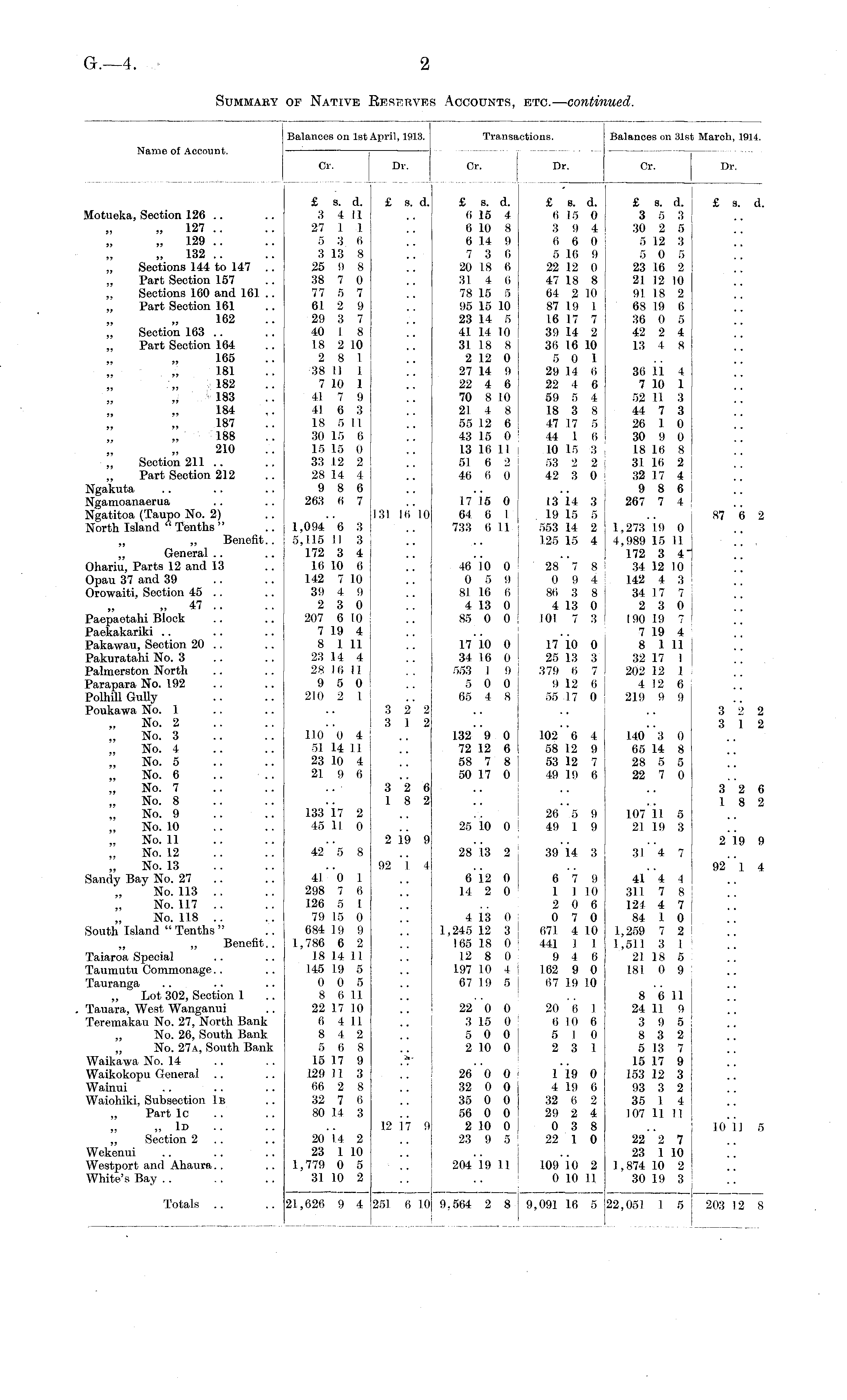 Balances on 1st April, 1913. Name of Account. ■■ Cr. Dr. Transa Cr. .ctions. Balances on 31st March, 1914. Cr. Dr. Dr. £ s. d. I £ s. d. Motueka, Section 126 .. .. 3 4 11 „ 127 .. .. 27 I 1 129 .. .. 5 3 6 132 *■} 1*3 8 "„ Sections 144 to 147 '.'. 25 9 8 Part Section 157 .. 38 7 0 Sections 160 and 161 .. 77 5 7 Part Section 161 .. 61 2 9 162 .. 29 3 7 Section 163 .. .. 40 I 8 Part Section 164 .. 18 2 10 165 2 8 1 181 .. 38 II 1 182 .. 7 10 1 183 .. 41 7 9 184 ,. 41 6 3 187 .. 18 5 II 188 .. 30 15 6 210 .'. 15 15 0 Section 211 .. .. 33 12 2 Part Section 212 .. 28 14 4 Ngakuta .. .. .. 9 8 6 Ngamoanaerua .. .. 263 6 7 Ngatitoa (Taupo No. 2) .. .. 131 Hi 10 North Island " Tenths" .. 1,094 6 3 Benefit.. : 5,115 113 General .. .. 172 3 4 Ohariu, Parts 12 and 13 .. 16 10 6 Opau 37 and 39 .. .. 142 7 10 Orowaiti, Section 45 .. .. 39 4 9 „ 47 .. .. 2 3 0 Paepaetahi Block .. .. 207 6 10: Paekakariki .. .. .. 7 19 4 Pakawau, Section 20 .. .. 8 1 11 Pakuratahi No. 3 .. .. 23 14 4 Palmerston North .. .. 28 16 11 Parapara No. 192 .. .. 9 5 0 Polhill Gully .. .. 210 2 I Poukawa No. 1 .. .. .. 3 2 2 No. 2 .. .. .. 3 12 No. 3 .. .. 110 0 4 No. 4 .. .. 51 14 11 No. 5 .. .. 23 10 4 No. 6 .. .. 21 9 6 No. 7 .. .. .. 3 2 6 No. 8 .. .. .. 18 2 No. 9 .. .. 133 17 2 No. 10 .. .. 45 II 0 No. 11 .. .. .. 2 19 9 No. 12 .. .. 42 5 8 „ No. 13 .. .. .. 92 1 4 Sandy Bay No. 27 .. 41 0 1 No. 113 .. .. 298 7 6 No. 117 .. .. 126 5 I No. 118 .. .. 79 15 0 South Island " Tenths " .. 684 I 9 9 Benefit.. 1,786 6 2 Taiaroa Special .. .. 181411 Taumutu Commonage.. .. 145 19 5 Tauranga .. .. .. 0 0 5 Lot 302, Section 1 .. 8 6 II Tauara, West Wanganui .. 221710 Teremakau No. 27, North Bank 6 4 11 No. 26, South Bank 8 4 2 No. 27a, South Bank 5 6 8 Waikawa No. 14 .. .. 15 17 9 Waikokopu General .. .. 129 11 3 Wainui .. .. .. 66 2 8 Waiohiki, Subsection 1b .. 32 7 6 Part lc .. .. 80 14 3 „ Id .. .. .. 12 17 9 Section 2 .. .. 20 14 2 Wekenui .. .. .. 23 1 10 Westport and Ahaura.. .. 1,779 0 5 White's Bay .. .. . . 31 10 2 £ s. d. 6 15 4 6 10 8 6 14 9 7 3 6 20 18 6 31 4 6 78 15 5 95 15 10 23 14 5 41 14 10 31 18 8 2 12 0 27 14 9 22 4 6 70 8 10 21 4 8 55 12 6 43 15 0 13 16 11 51 6 2 46 6 0 17 15 0 64 6 I I 733 6 11 46 10 0 0 5 9 81 16 Ii 4 13 0 85 0 0 ; 17 10 0 34 16 0 553 1 9 5 0 0 65 4 8 132' 9 0 72 12 6 58 7 8 50 17 0 25'io 0 28 13 2 612 0 14 2 0 4 13 0 1,245 12 3 165 18 0 12 8 0 197 10 4 67 19 5 22 0 0 3 15 0 5 0 0 2 10 0 26 0 0 32 0 0 I 35 0 0 56 0 0 ' 2 10 0 23 9 5 204 19 11 j £ s. d. (i 15 0 3 9 4 6 6 0 5 16 9 22 12 0 47 18 8 64 2 10 87 19 1 16 17 7 39 14 2 36 16 10 5 0 1 29 14 6 22 4 6 59 5 4 18 3 8 47 17 5 44 1 6 10 15 3 53 2 2 42 3 0 £ s. d. 3 5 3 30 2 5 5 12 3 5 0 5 23 16 2 21 12 10 91 18 2 68 19 6 36 0 5 42 2 4 13 4 8 £ s. d. 36 11 4 7 10 1 52 II 3 44 7 3 26 1 0 30 9 0 18 16 8 31 16 2 32 17 4 9 8 6 267 7 4 13 14 3 19 15 5 553 14 2 125 15 4 i 1,273 19 0 4,989 15 11 172 3 i.34 12 10 142 4 3 34 17 7 2 3 0 190 19 7 7 19 4 8 1 11 32 17 I 202 12 1 4 12 6 219 9 9 87 6 2 28 7 8 0 9 4 86 3 8 4 13 0 101 7 3 17 10 0 25 13 3 379 6 7 !) 12 6 55 17 0 3 2 2 3 1 2 102 6 4 58 1.2 9 53 12 7 49 19 6 140 3 0 65 14 8 28 5 5 22 7 0 3 2 6 1 8 2 26 5 9 49 1 9 107 il 5 21 19 3 39 14 3 31 4 7 219 9 6 7 9 1 I 10 2 0 6 0 7 0 671 4 10 441 I 1 9 4 6 162 9 0 157 19 10 41 4 4 311 7 8 124 4 7 84 1 0 1,259 7 2 1,511 3 I 21 18 5 181 0 9 92" 1 4 ., 20 6 I 6 10 6 5 I 0 2 3 1 8 6 11 24 11 9 3 9 5 8 3 2 5 13 7 15 17 9 153 12 3 93 3 2 35 1 4 107 11 II 1 19 0 4 19 6 32 6 2 29 2 4 0 3 8 22 1 0 22 2 7 23 1 10 1,874 10 2 30 19 3 io"ii 5 109 10 2 0 10 11 Totals .. .. 21,626 9 4 251 6 10 i| 9,564 2 8 9,091 16 5 22,051 I 5 : 203 12 8