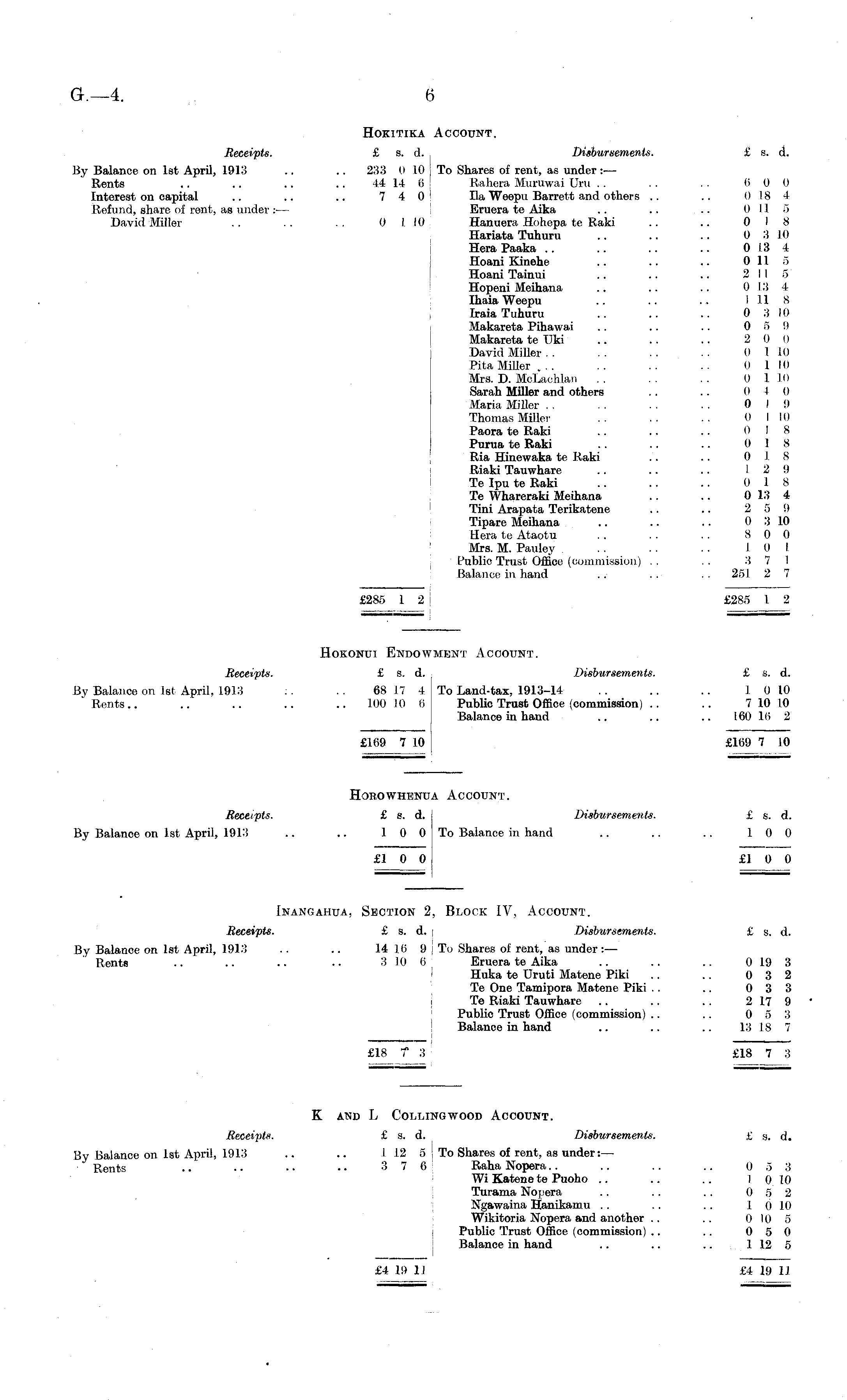 Hokitika Account. Receipts. £ s. d. Disbursements. £ s. d. By Balance on Ist April, 1913 .. .. 233 0 10 :To Shares of rent, as under :— Rents .. .. .. .. 44 14 6 ; Rahera Muruwai Urn . . . . . . 6 0 0 Interest on capital .. .. .. 7 4 0 i Ila Weepu Barrett and others .. .. OIS 4 Refund, share of rent, as under: — Eruera te Aika .. .. .. 0 115 David Miller .. .. .. 0 1.10 Hanuera Hohepa te Raki .. .. 0 18 Hariata Tuhuru .. .. .. 0 3 10 Hera Paaka .. .. .. .. 0134 Hoani Kinehe .. . ■ ■ ■ Olio Hoani Tainui .. .. .. 2 115 Hopeni Meihana .. .. .. 0 13 4 Ihaia Weepu .. .. .. 1 11 S Iraia Tuhuru .. .. .. 0 3 10 Makareta Pihawai .. .. .. 0 5 9 Makareta te TJki .. .. .. 2 0 0 David Miller. . . . .. . . 0 1 10 Pita Miller ... .. .. . . 0 1 10 Mrs. D. MoLachlan .. .. .. 0 110 Sarah Miller and others .. .. 0 4 0 Maria Miller .. . . .. .. 0 19 Thomas Miller .. .. .. 0 1 10 Paora te Raki .. .. .. 0 18 Purua te Raki .. .. .. 0 18 Ria Hinewaka te Raki .". .. 0 18 Riaki Tauwhare .. .. .. 12 9 Te Ipu te Raki .. .. .. 0 18 Te Whareraki Meihana .. .. 013 4 Tini Arapata Terikatene .. .. 2 5 9 Tipare Meihana .. .. .. 0 310 Hera te Ataotu .. .. .. 8 0 0 Mrs. M. Pauley . . . . . . 1 0 I Public Trust Office (oommission) . . .. 3 7 1 Balance in hand .. .. . . 25J 2 7 £285 1 2 £285 1 2 Hokonui Endowment Account. Receipts. £ s. d. Disbursements. £ s. d. By Balance on Ist April, 1913 :. .. 68 17 4 To Land-tax, 1913-14 .. .. .. 1 010 Rents.. .. .. .. 100 10 6 Public Trust Office (oommission) .. .. 7 10 10 Balance in hand .. .. .. 160 10 2 £169 7 10 £169 7 10 HOROWHENUA ACCOUNT. Receipts. £ s. d. | Disbursements. £ s. d. By Balance on Ist April, 1913 .. .. 1 0 OTo Balance in hand .. .. .. 10 0 £10 0 £10 0 Inangahua, Section 2, Block IV, Account. Receipts. £ s. d. i Disbursements. £ s. d. By Balance on Ist April, 1913 .. .. 14 16 9| To Shares of rent, as under :— Rents .. .. .. .. 3 10 6 Eruera te Aika .. .. .. 0 19 3 I Huka te Uruti Matene Piki .. .. 0 3 2 Te One Tamipora Matene Piki .. .. 0 3 3 Te Riaki Tauwhare .. .. .. 217 9 Public Trust Office (commission) .. .. 0 5 3 Balance in hand .. .. .. 13 18 7 £18 7 3 £18 7 3 X AMD L COLLINGWOOD ACCOUNT. Receipts. £ s. d. Disbursements. £ s. d. By Balance on Ist April, 1913 .. .. 112 5 To Shares of rent, as under:— Rents .. • ■ • • • • 3 7 6 Raha Nopera.. .. .. .. 0 5 3 Wi Katene te Puoho .. .. .. 1 010 Turama Nopera .. . . . . 0 5 2 Ngawaina Hanikamu . . .. .. 10 10 Wikitoria Nopera and another . . .. 0 10 5 Public Trust Office (commission) .. .. 0 5 0 Balance in hand .. .. .. 1 12 5 £4 19 1J £4 19 11