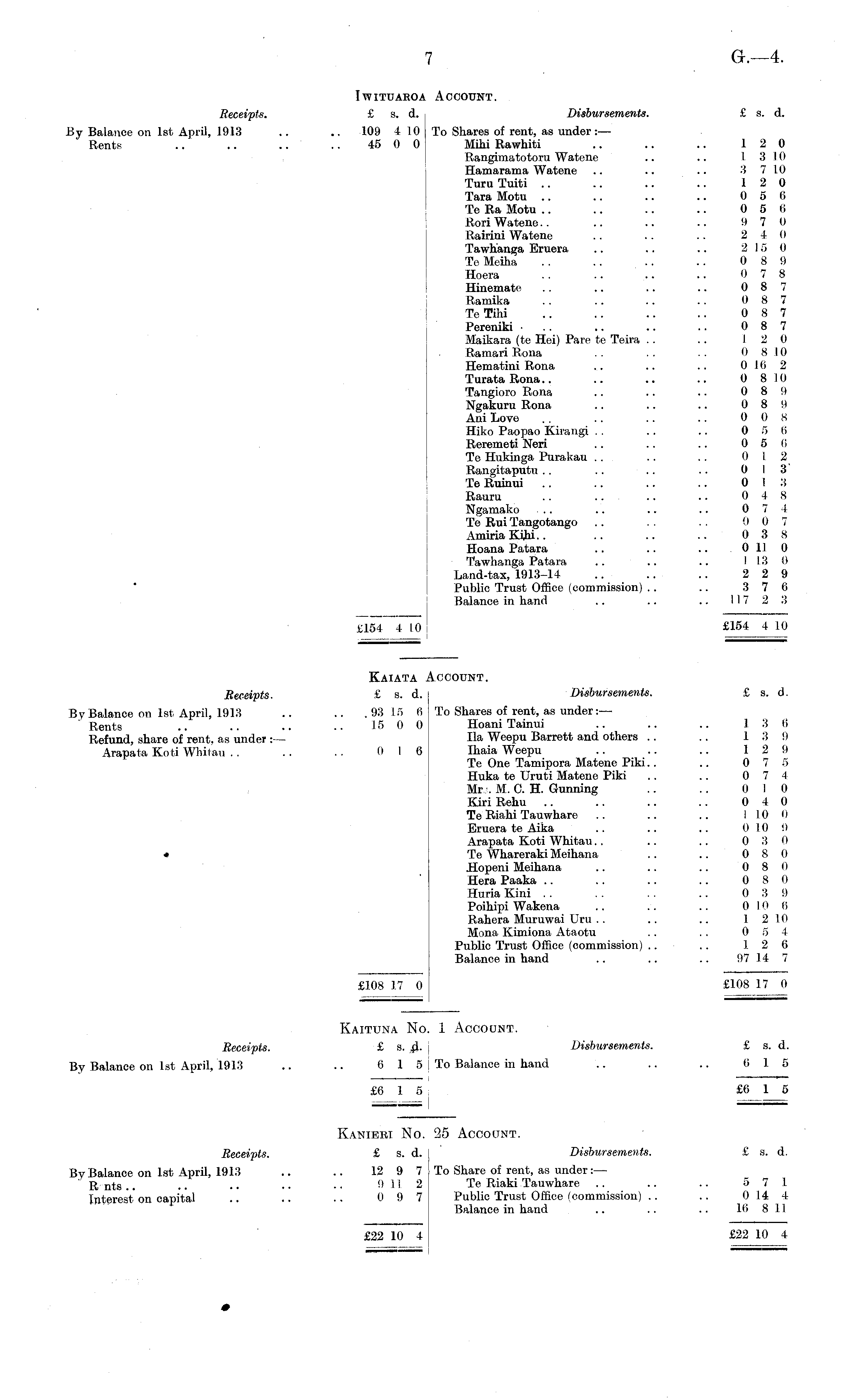 Iwituaroa Account. Receipts. £ s. d. Disbursements. £ s. d. By Balance on Ist April, 1913 .. .. 109 410 To Shares of rent, as under: — Rents .. .. .. .. 45 0 0 Mini Rawhiti .. .. .. 12 0 Rangimatotoru Watene .. .. 13 10 Hamarama Watene .. .. .. 3 7 10 Turu Tuiti .. .. .. .. 12 0 Tara Motu .. .. .. .. 0 5 6 Te Ra Motu .. .. .. .. 0 5 6 Kori Watene.. .. .. -. 9 7 0 Rairini Watene .. .. .. 2 4 0 Tawhanga Eraera .. .. .. 215 0 TeMeiha .. .. .. .. 0 8 9 Hoera .. .. .. .. 0 7 8 Hinemate .. .. .. .. 0 8 7 Ramika .. .. .. .. 0 8 7 Te Tihi .. .. .. .. 0 8 7 Pereniki • .. .. .. .. 087 Maikara (te Hei) Pare te Teira .. .. 12 0 Ramari Rona . . . . . . 0 810 Hematini Rona .. .. .. 0 16 2 Turata Rona.. .. .. .. 0 8 10 Tangioro Rona .. .. .. 0 8 9 Ngakuru Rona .. .. .. 0 8 9 Ani Love . . .. .. .. 0 0 8 Hiko Paopao Kirangi . . .. .. 0 5 6 Reremeti Neri .. .. .. 0 5 (i Te Hukinga Purakau .. .. .. 0 12 Rangitaputu .. .. .. .. 0 13 Te Ruinui .. .. .. .. 0 1 :i Rauru .. .. 048 Ngamako .. .. .. .. 074 Te Rui Tangotango .. . . . . 0 0 7 AmiriaKihi.. •• •• •• 0 3 8 Hoana Patara .. .. .. OHO Tawhanga Patara .. .. .. 113 0 Land-tax, 1913-14 .. .. .. 2 2 9 Public Trust Office (commission) .. .. 3 7 6 Balance in hand .. .. .. 117 2.'! * £154 4 10 £154 4 10 _ i ■ Kaiata Account. Receipts. £ s. d. I Disbursements. £ s. d. By Balance on Ist. April, 1913 .. .. .93 15 6 To Shares of rent, as under:— Rents .. .. .. .. 15 0 0 Hoani Tainui .. .. .. 13 6 Refund, share of rent, as under:— Ha Weepu Barrett and others .. .. 13 9 Arapata Koti Whitau . . .. . . 0 16 Ihaia Weepu .. .. .. 12 9 Te One Tamipora Matene Piki.. .. 0 7 5 Huka te TJruti Matene Piki .. .. 0 7 4 Mr .M.C. H. Gunning .. .. 0 10 Kiri Rehu .. .. .. .. 0 4 0 Te Riahi Tauwhare .. .. .. 1 10 0 Eruera te Aika .. .. .. 0 10!) Arapata Koti Whitau.. .. .. 0 3 0 • Te Whareraki Meihana .. .. 0 8 0 Hopeni Meihana .. .. .. 0 8 0 Hera Paaka .. .. .. .. 0 8 0 Huria Kini . . .. . . .. 0 3 9 Poihipi Wakena .. .. .. 010 6 Rahera Muruwai Uru .. .. .. 1 210 Mona Kimiona Ataotu .. . . 0 5 4 Public Trust Office (commission) .. .. 12 6 Balance in hand .. .. .. 97 14 7 £108 17 0 £108 17 0 Kaituna No. 1 Account. Receipts. £ s. d. Disbursements. £ s. d. By Balance on Ist April, 1913 .. .. 6 1 5j To Balance in hand .. .. .. 6 15 £615. £615 Kanieei No. 25 Account. Receipts. £ s. d. Disbursements. £ s. d. Bvßalance on Ist April, 1913 .. .. 12 9 7 To Share of rent, as under:— R nts.. .. .. • • • • 9 112 Te Riaki Tauwhare .. .. .. 5 7 1 Interest on capital .. .. .. 0 9 7 Public Trust Office (commission) .. .. 014 4 Balance in hand .. .. .. 16 8 11 £22 10 4 £22 10 4