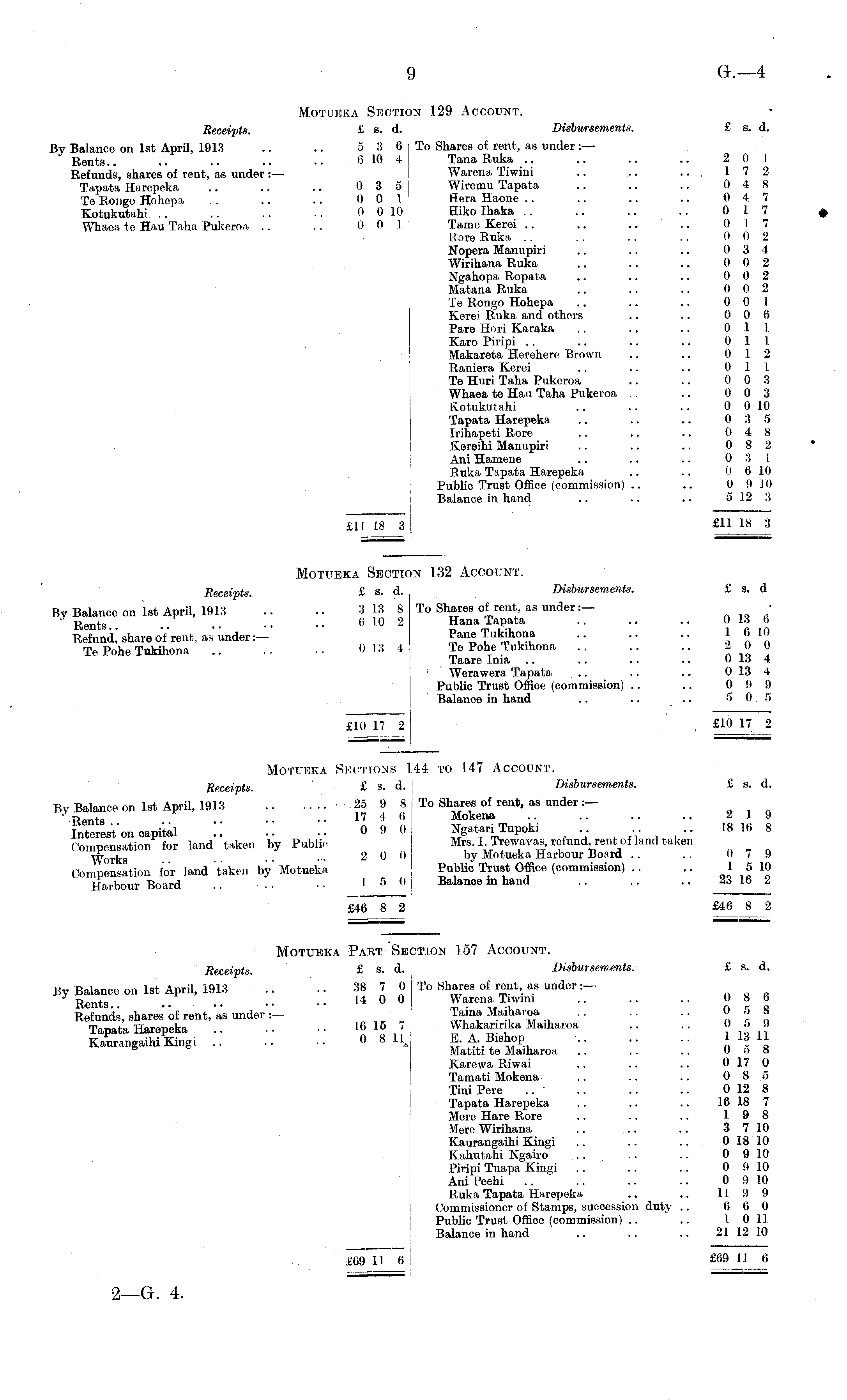 Motueka Section 129 Account. Receipts. £ s. d. Disbursements. £ s. d. By Balance on Ist April, 1913 .. .. 5 3 6 To Shares of rent, as under : — Rents.. .. .. .. .. l> 10 4 Tana Ruka .. .. .. .. 2 0 1 Refunds, shares of rent, as under:— Warena Tiwini .. .. .. 17 2 Tapata Harepeka .. .. .. 03 5 Wiremu Tapata .. .. .. 04 8 Tβ Rongo Hohepa .. .. .. 00 1 Hera Haone .. .. .. .. 04 7 Kotukutahi .. .. .. .. 0 010 Hiko Ihaka .. .. .. .. 017 * Whaea to Hau Taha Pukerna .. .. 0 0 1 Tame Kerei .. .. .. .. 0 17 Rore Ruka .. .. .. .. 0 0 2 Nopera Manupiri .. .. .. 0 3 4 Wirihana Ruka .. .. .. 0 0 2 Ngahopa Ropata .. .. .. 0 0 2 Matana Ruka .. .. .. 0 0 2 Tβ Rongo Hohepa .. .. .. 0 0 1 Kerei Ruka and others .. .. 0 0 6 Pare Hori Karaka .. .. .. 0 11 Karo Piripi .. .. .. .. 0 11 Makareta Herehere Brown .. .. 0 12 Raniera Kerei .. .. .. Oil Tβ Huri Taha Pukeroa .. .. 0 0 3 Whaea te Hau Taha Pukeroa . . .. 0 0 3 Kotukutahi .. .. .. 0 0 10 Tapata Harepeka .. .. .. 0 3 5 Irihapeti Rore .. .. .. 0 4 8 Kerei hi Manupiri .. .. .. 0 8 2 Ani Hamene .. .. .. 0 :! I Ruka Tapata Harepeka .. .. 0 6 10 Public Trust Office (commission) .. .. 0 !) 1 0 Balance in hand .. .. .. 5 12 3 £11 18 3 £H 18 3 Motubka Section 132 Account. Receipts. £ s. d. Disbursements. £ s. d By Balance on Ist April, 1913 .. .. 3 13 8 To Shares of rent, as under:— • Rents ..6102 Hana Tapata .. .. .. 013 b Refund,'share oVrent, asunder:- Pane Tukihona 1 6 10 Te Pohe Tukihona 0 13 4 Te Pohe Tukihona Taare Inia .. .. .. .. 0 13 4 Werawera Tapata .. .. .. 013 4 Public Trust Office (commission) .. .. 0 9 9 Balance in hand .. .. .. 5 0 5 £10 17~2 , £ i°_2 7 J Motueka Sections 144 to 147 Account. Receipts. £ s. d. I Disbursements. £ s. d. By Balance on Ist April, 1913 • 25 9 8, To Shares of rent, as under :- ■ »„„*„ .. .. 17 4 6 Mokena .. .. .. .. 2 19 Interest™ capital .. \. .. 09 0 Ngatari Tupoki tt V ' 8 16 8 Compensation for land taken by Public Mrs. I Trewavas, refund rent of land taken ■^ orkg ... 2 0 0 by Motueka Harbour Board . . .. 0 7 9 Compensation for land'taken by'Motueka Public Trust Office (commission) .. .. 18 10 Harbour Board I 5 *> j Balanoe in hand 23 16 2 £46 8 2 £46 8 2 Motueka Pabt Section 157 Account. Receipts. £ s. d. i Disbursements. £ s. d. JJy Balance on Ist April, 1913 .. . • 38 70 To Shares of rent, as under:Rents .. 14 0 0 J Warena Tiwim .. .. .. 0 8 6 Refunds, shared rent/as under':- Taina Maiharoa 0 5 8 Tapata Harepeka 16 15 7 Whakaririka Maiharoa .. .. 05 9 KaVangaihi Kingi 0 8 11 E A Bishop 113 11 Matiti te Maiharoa .. .. .. 0 5 8 Karewa Riwai .. .. .. 017 0 Tamati Mokena .. .. .. 0 8 5 Tini Pere .. .. .. .. 0 12 8 Tapata Harepeka .. .. .. 16 18 7 Mere Hare Rore .. .. .. 19 8 Mere Wirihana .. .. .. 3 7 10 Kaurangaihi Kingi .. .. .. 018 10 . Kahutahi Ngairo .. .. .. 0 910 Piripi Tuapa Kingi .. .. ... 0 910 Ani Peehi .. .. .. .. 0 9 10 Ruka Tapata Harepeka .. .. 11 9 9 Commissioner of Stamps, succession duty .. 6 6 0 Public Trust Office (commission) .. .. 1 011 Balance in hand .. .. .. 21 12 10 £69 11 6 ! £69 11 6