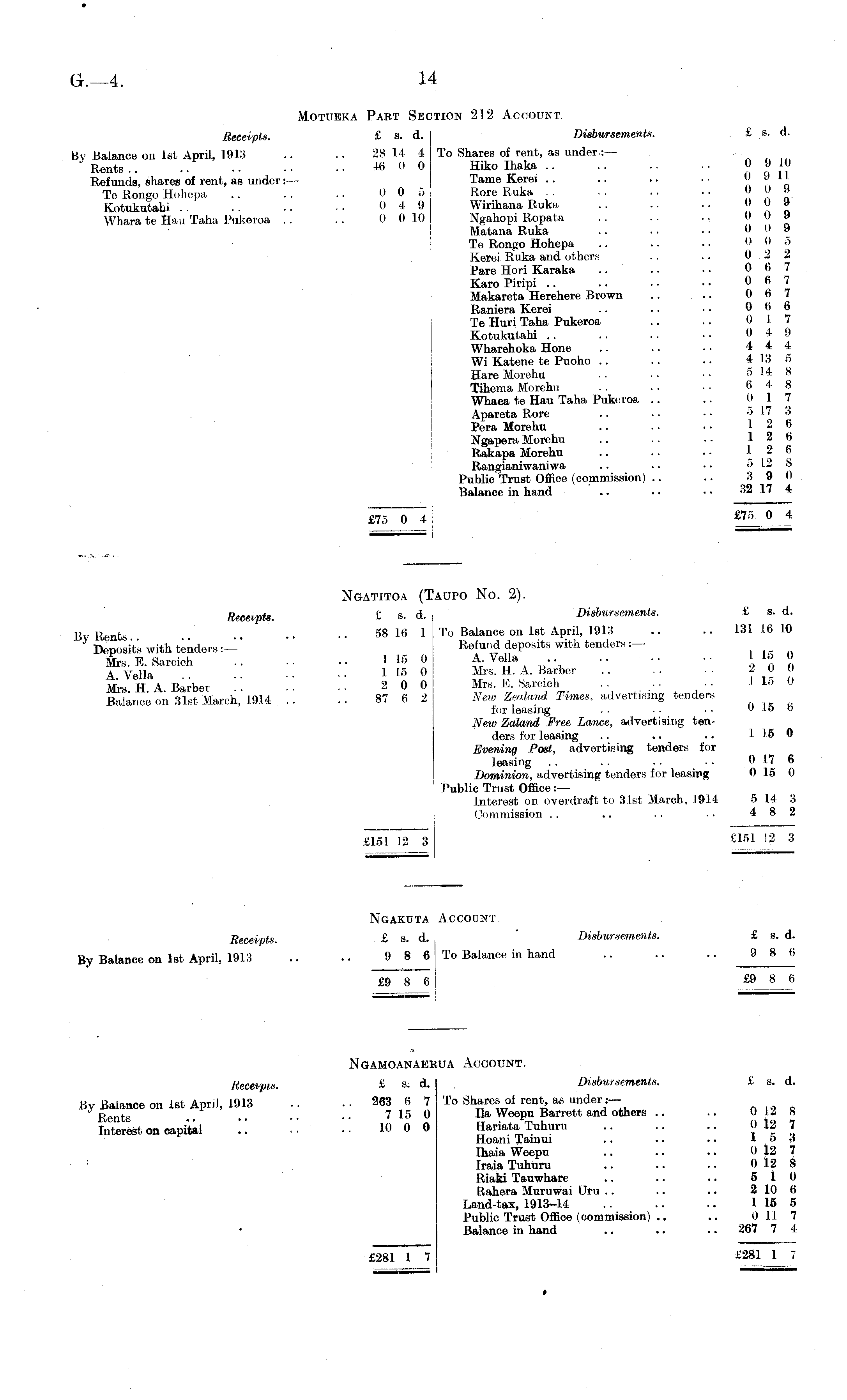 Motubka Part Section 212 Account Receipts. £ s. d. [ Disbursements. £ s. d. By Balance on Ist April, 19l:i .. .. 28 1.4 4To Shares of rent, as under.:— Rents.. .. 46 0 0 Hiko Ihaka 0 9 10 Refunds, shares of rent, as under:— Tame Kerei .. .. .. . • ";, „ Te Kongo Hohepa .. .. .. 0 0 5 Rore Ruka . . .. .. ■ ■ 00 « Kotukutahi .. .. .. •. 049 Wirihana Ruka, .. .. .. 0 0 9 Whara te Han Taha Pukeroa . . .. 0 010 Ngahopi Ropata .. .. • • 0 U v Matana Ruka .. .. ■ ■ 0 0 9 Te Rongo Hohepa .. .. .. 0 0 5 Kerei Ruka and others . . .. 0 2 2 Pare Hori Karaka .. .. • • 0 6 7 Karo Piripi .. .. • • • • 0 6 7 Makareta Herehere Brown .. . .. 0 6 7 Raniera Kerei .. .. ■ • 0 6 6 Te Huri Taha Pukeroa .. .. 0 17 Kotukutahi .. .. .. ■■ 0 4 9 Wharehoka Hone .. .. • • 4 4 4 Wi Katene te Puoho .. .. ■ • 413 5 Hare Morehu • . • • ■ • 5 14 8 Tjhema Morehu . . .. • ■ 6 4 8 Whaea te Hau Taha Pukoroa .. .. 0 1 7 Apareta Rore .. • • • • 517 8 Pera Morehu .. .. • • 12 6 Ngapera Morehu .. . . • • 12 6 Rakapa Morehu .. ■ ■ • • 12 6 Rangianiwaniwa .. .. • • 512 8 Public Trust Office (commission) .. .. 3 9 0 Balance in hand .. .. • • 32 17 4 £75 0 4 £7JL ° t Ngatitoa (Taupo No. 2). Receipts. £ s. d. Disbursements. £ s. d. By Rents • • 58 16 ITo Balance on Ist April, 1913 .. • • 131 1-6 10 Deposit's with tenders:—" K<f™i deposits with tenders :- Mrs. E. Sarcich 116 0 A. VeUa .. .. •• ■• W 0 A v e ii a . . 1 15 0 Mrs. H. A. Barber .. .. •. 2 0 0 Mrs H A Barber 2 0 0 Mrs. E. Sarcich . . ■ • ■ • ' '» 0 Balance on 31st March,' 1914 .. .. 87 6 2 New Zealand Times, advertising tenders for leasing . . ■ ■ ■ • 0 15 b New Zaland, Free Lance, advertising tenders for leasing .. .. .. 115 0 Evening Post, advertising tenders for leasing .. . . . . • ■ 017 6 Dominion, advertising tenders for leasing 0 15 0 Public Trust Office :— Interest on overdraft to 31st March, 1914 5 14 3 Commission . . .. .. • • 4 8 2 £151 12 3 £161 12 3 Ngakuta Account. Receipts. £ s. d. Disbursements. £ s. d. By Balance on Ist April, 1913 .. .. 986 To Balance in hand 98 6 £9 8 6 . ®_J_J Ngamoanabeua Account. Receipts. £ s. d. Disbursements. £ s. d. By Balance on Ist April, 1913 .. .. 263 6 7 To Shares of rent, as under:— Rents .. • • 715 0 Ha Weepu Barrett and others .. .. 012 S Interest oa capital !! '.'. ■■ 10 0 0 Hariata Tuhuru 012 7 Hoani Tamui .. .. •. 1 5 ,{ Ihaia Weepu .. .. .. 0 12 7 : Iraia Tuhuru .. .. .. 0 12 8 Riaki Tauwhare .. .. .. 5 10 Rahera Muruwai Uru .. .. .. 2 10 6 Land-tax, 1913-14 .. .. .. 115 5 Public Trust Office (commission) .. .. 0 11 7 Balance in hand .. .. .. 267 7 4 £281 1 7 £281 1 7 t
