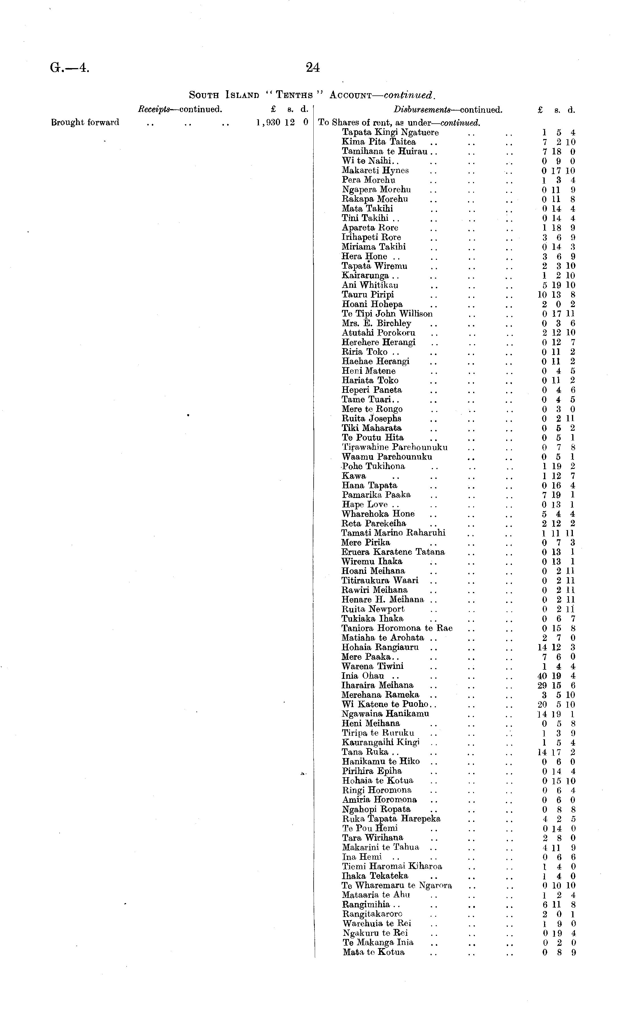 South Island " Tenths " Account— continued. Receipts —continued. £ s. d. Disbursements —continued. £ s. d. Brought forward .. .. .. 1,930 12 0 To Shares of rent, as under— continued. Tapata Kingi Ngatuere .. .. 15 4 Kima Pita Taitea .. .. .. 7 210 Tamihana te Huirau .. .. .. 718 0 WiteNaihi.. .. .. .. 0 9 0 Makareti Hynes .. .. .. 0 17 10 Pera Morehu .. .. .. 13 4 Ngapera Morehu .. .. .. 0 119 Rakapa Morehu .. .. .. 0 118 Mata Takihi .. .. .. 014 4 Tini Takihi .. .. .. .. 0 14 4 Apareta Rore .. .. .. 1 18 9 Irihapeti Rore .. .. .. 3 6 9 Miriama Takihi .. .. .. 0 14 :S Hera Hone .. .. .. .. 3 6 9 Tapata Wiremu .. .. .. 2 3 10 Kairarunga .. .. .. .. 1 2 10 Ani Whitikau .. .. .. 5 19 10 Tauru Piripi .. .. .. 10 13 8 Hoani Hohepa .. .. .. 2 0 2 Te Tipi John Willison .. .. 017 11 Mrs. E. Birchley .. .. .. 0 3 6 Atutahi Porokoru .. .. .. 212 10 Herehere Herangi .. .. .. 012 7 Riria Toko .. .. .. .. 0 11 2 Haehae Herangi .. .. .. 0 112 Heni Matene .. .. . . 0 4 5 Hariata Toko .. .. .. 0 11 2 Heperi Paneta .. .. .. 0 4 6 TameTuari.. .. .. .. 0 4 5 Mere te Rongo .. .. .. 0 3 0 Ruita Josephs .. .. .. 0 2 11 Tiki Maharata .. .. .. 0 5 2 Te Poutu Hita .. .. .. 0 5 1 Tirawahine Parehounuku .. .. 0 7 8 Waamu Parehounuku .. .. 0 5 1 Pohe Tukihona .. .. .. 119 2 Kawa .. .. .. .. 1 12 7 Hana Tapata .. .. .. 0 16 4 Pamarika Paaka .. .. .. 719 1 Hape Love . . .. . . .. 013 1 Wharehoka Hone .. .. .. 5 4 4 Reta Parekeiha .. .. .. 212 2 Tamati Marino Raharuhi .. .. 11111 Mere Pirika .. .. ~ 0 7 3 Eruera Karatene Tatana .. .. 0 13 1 Wiremu Ihaka .. .. .. 0 13 1 Hoani Meihana .. .. .. 0 2 11 Titiraukura Waari .. .. .. 0 211 Rawiri Meihana .. .. .. 0 211 Henare H. Meihana .. .. .. 0 2 11 Ruita Newport .. .. .. 0 2 11 Tukiaka Ihaka .. .. .. 0 6 7 Taniora Horomona te Rae .. .. 0 15 8 Matiaha te Arohata .. .. .. 2 7 0 Hohaia Rangiauru .. .. .. 14 12 3 Mere Paaka.. .. .. .. 7 6 0 Warena Tiwini .. .. .. 14 4 Inia Ohau .. .. .. .. 40 19 4 Iharaira Meihana .. .. .. 29 15 6 Merehana Rameka .. .. .. 3 5 10 Wi Katene te Puoho.. .. .. 20 5 10 Ngawaina Hanikamu .. .. 14 19] Heni Meihana .. .. .. 0 5 8 Tiripa te Ruruku .. .. .'. 13 9 Kaurangaihi Kingi . . .. .. 15 4 Tana Ruka .. .. .. .. 14 17 2 Hanikamu te Hiko .. .. .. 0 6 0 *. Pirihira Epiha .. .. .. 014 4 Hohaia te Kotua .. .. .. 0 15 10 Ringi Horomona .. .. . . 0 6 4 Amiria Horomona .. .. .. 0 6 0 Ngahopi Ropata .. .. .. 0 8 8 Ruka Tapata Harepeka .. .. 4 2 5 Te PouHemi .. .. .. 014 0 Tara Wirihana .. .. .. 2 8 0 Makarini te Tahua .. .. .. 4 119 Ina Hemi . . .. .. . . 0 6 6 Tiemi Haromai Kiharoa .. . . 14 0 Ihaka Tekateka .. .. .. 14 0 Te Wharemaru te Ngarora .. .. 0 10 10 Mataaria te Ahu .. .. .. 12 4 Rangimihia .. .. .. .. 6 118 Rangitakaroro . . .. .. 2 0 1 Warehuia te Rei .. .. .. 19 0 Ngakura te Rei .. .. .. 0 19 4 Te Makanga Inia .. .. .. 0 2 0 Mata to Kotua .. .. .. 0 8 9