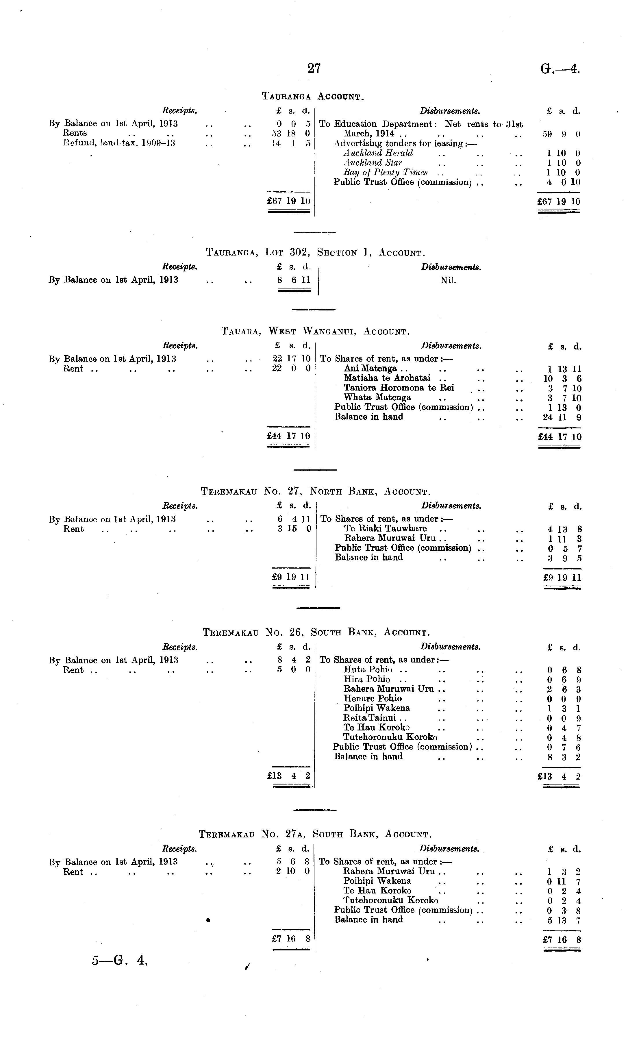 Tauranga Account. Receipts. £ s. d. Disbursements. £ s. d. By Balance on Ist April, 1913 .. .. 0 0 5 To Education Department: Net rents to 31st Rents .. .. .. .. 53 18 0 March, 1914 .. .. .. .. 59 0 0 Refund, land-tax, 1909-11! ~ .. 14 1 5 Advertising tenders for leasing:— Auckland Herald .. .. .. 1 10 0 Auckland Star .. .. .. 110 0 Bay of Plenty Times . . .. . . 1 10 0 Public Trust Office (commission) .. .. 4 0 10 £67 19 10 £67 19 10 Tauranga, Lot 302, Section ], Account. Receipts. £ s. d. Disbursements. By Balance on Ist April, 1913 .. 8 6 11 Nil. Tauatsa, West Wanganui, Account. Receipts. £ s. d. Disbursements. £ s. d. By Balance on Ist April, 1913 .. .. ■ 22 17 10 To Shares of rent, as under : — Rent .. .. .. .. .. 22 0 0 AniMatenga.. .. .. .. 1 13 11 Matiaha te Arohatai .. .. .. 10 3 6 Taniora Horomona te Rei .. .. 3 7 10 Whata Matenga .. .. .. 3 710 Public Trust Office (commission) .. .. 1 13 0 Balance in hand .. .. .. 24 11 9 £44 17 10 £44 17 10 Teremakau No. 27, North Bank, Account. Receipts. £ s. d. Disbursements. £ s. d. By Balance on Ist April, 1913 .. .. 6411 To Shares of rent, as under:— Rent .. .. .. .. .. 315 0 Te Riaki Tauwhare .. .. .. 413 8 Rahera Muruwai Uru .. .. .. 1113 Public Trust Office (commission) .. .. 0 5 7 Balance in hand .. .. .. 3 9 5 £9 19 11 £9 19 11 Thremakau No. 26, South Bank, Account. Receipts. £ s. d. Disbursements. £ s. d. By Balance on Ist April, 1913 .. .. 8 4 2 To Shares of rent, as under: — Rent .. .. .. .. .. 500 Huta Pohio .. .. .. .. 0 6 8 Hira Pohio .. .. .. .. 0 6 9 Rahera Muruwai Uru .. .. .. 2 6 3 Henare Pohio .. .. .. 0 0!) Poihipi Wakena .. .. .. 13 1 ReitaTainui .. .. .. . . 0 0!) Te Hau Koroko .. . . . . 0 4 7 Tutehoronuku Koroko .. .. 0 4 8 Public Trust Office (commission) .. .. 0 7 6 Balance in hand .. .. .. 8 3 2 £13 4 2 £13 4 2 Teremakau No. 27a, South Bank, Account. Receipts. £ s. d. Disbursements. £ s. d. By Balance on Ist April, 1913 ~ .. 5 6 8 To Shares of rent, as under:— Rent .. .. .. .. .. 2 10 0 Rahera Muruwai Uru .. .. .. 13 2 Poihipi Wakena .. .. .. 0 117 Te Hau Koroko .. .. .. 0 2 4 Tutehoronuku Koroko .. .. 0 2 4 Public Trust Office (commission) .. .. 0 3 8 • Balance in hand .. .. .. 5 13 7 £7 16 8 £7 16 8