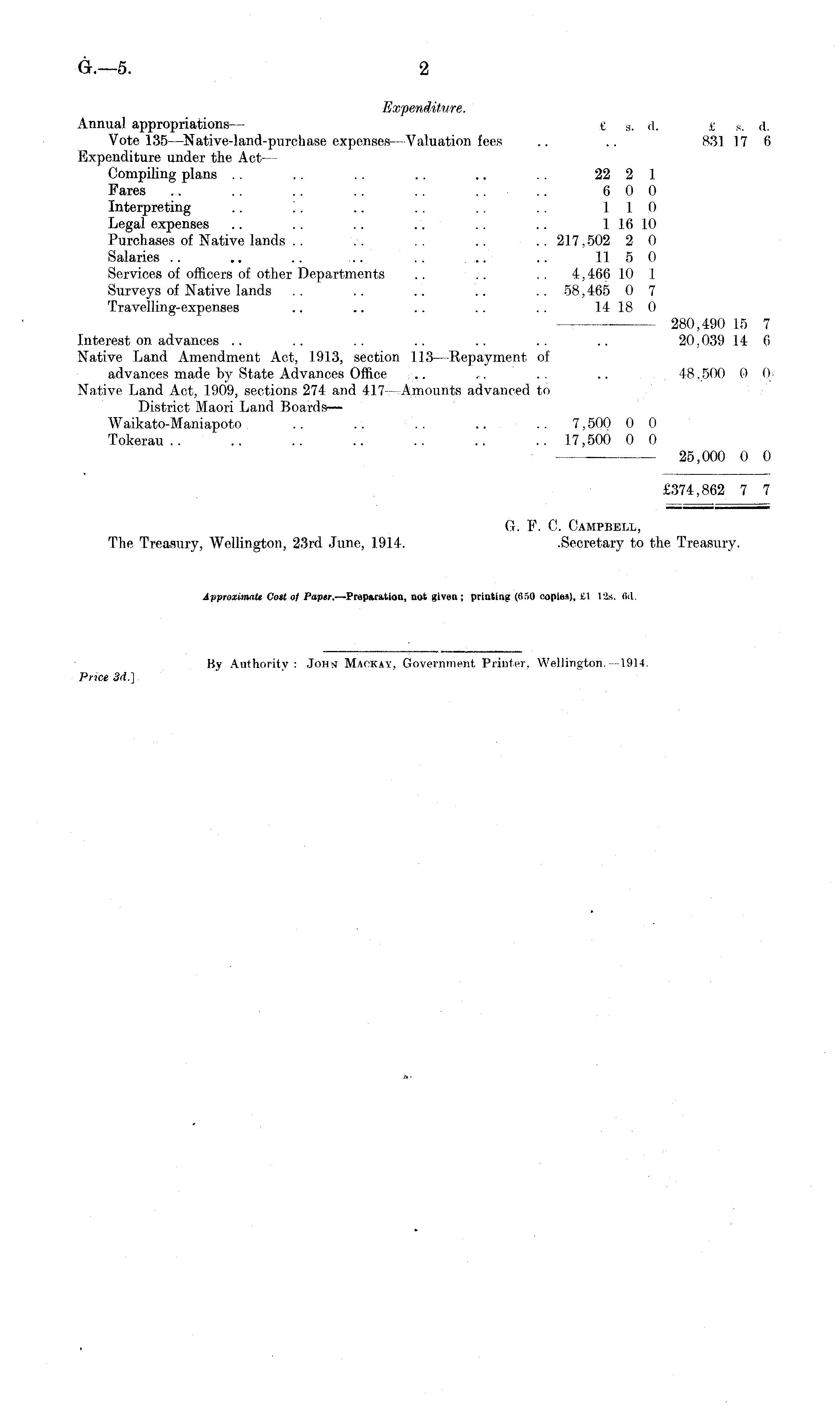 Expenditure. Annual appropriations— £ s . A. £ s. d. Vote 135 —Native-land-purchase expenses —Valuation fees .. .. 831 17 6 Expenditure under the ActCompiling plans . . .. .. .. .. 22 2 1 Fares .. .. .. .. .. .... 600 Interpreting .. '.. .. .. .. . . 110 Legal expenses .. .. .. .. . . .. 116 10 Purchases of Native lands . . . . . . .. . . 2.17,502 2 0 Salaries .. .. .. .. . . ... .. 1150 Services of officers of other Departments .. .. . . 4,466 10 1 Surveys of Native lands .. .. .. .. .. 58,465 0 7 Travelling-expenses .. .. .. .. .. 14 18 0 280,490 15 7 Interest on advances .. .. .. .. .. .. .. 20,039 14 6 Native Land Amendment Act, 1913, section 113—Repayment of advances made by State Advances Office .. ... . . .. 48,500 0 0 Native Land Act, 1909, sections 274 and 417 —Amounts advanced to District Maori Land Boards— Waikato-Maniapoto .. .. .. .. 7,500 0 0 Tokerau.. .. .. .. .. .. .. 17,500 0 0 25,000 0 0 £374,862 7 7 G. F. C. Campbell, The Treasury, Wellington, 23rd June, 1914. .Secretary to the Treasury. Approximate Cost of Paper. —Preparation, not given; printing (0"t0 copies), £1 12s. fid.