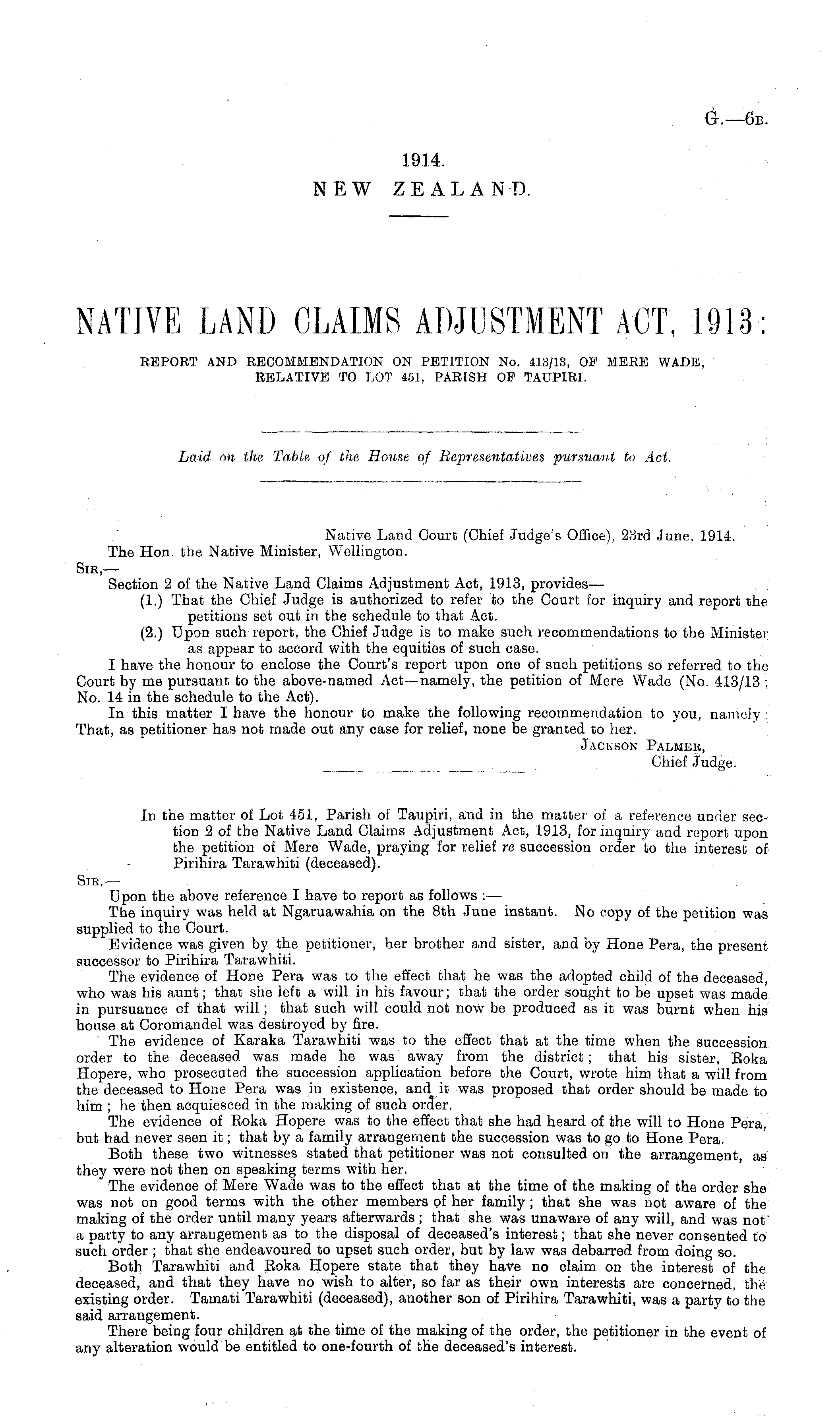 NATIVE LAND CLAIMS ADJUSTMENT ACT, 1913: REPORT AND RECOMMENDATION ON PETITION No. 413/13, OF MERE WADE, RELATIVE TO LOT 451, PARISH OF TAUPIRI.