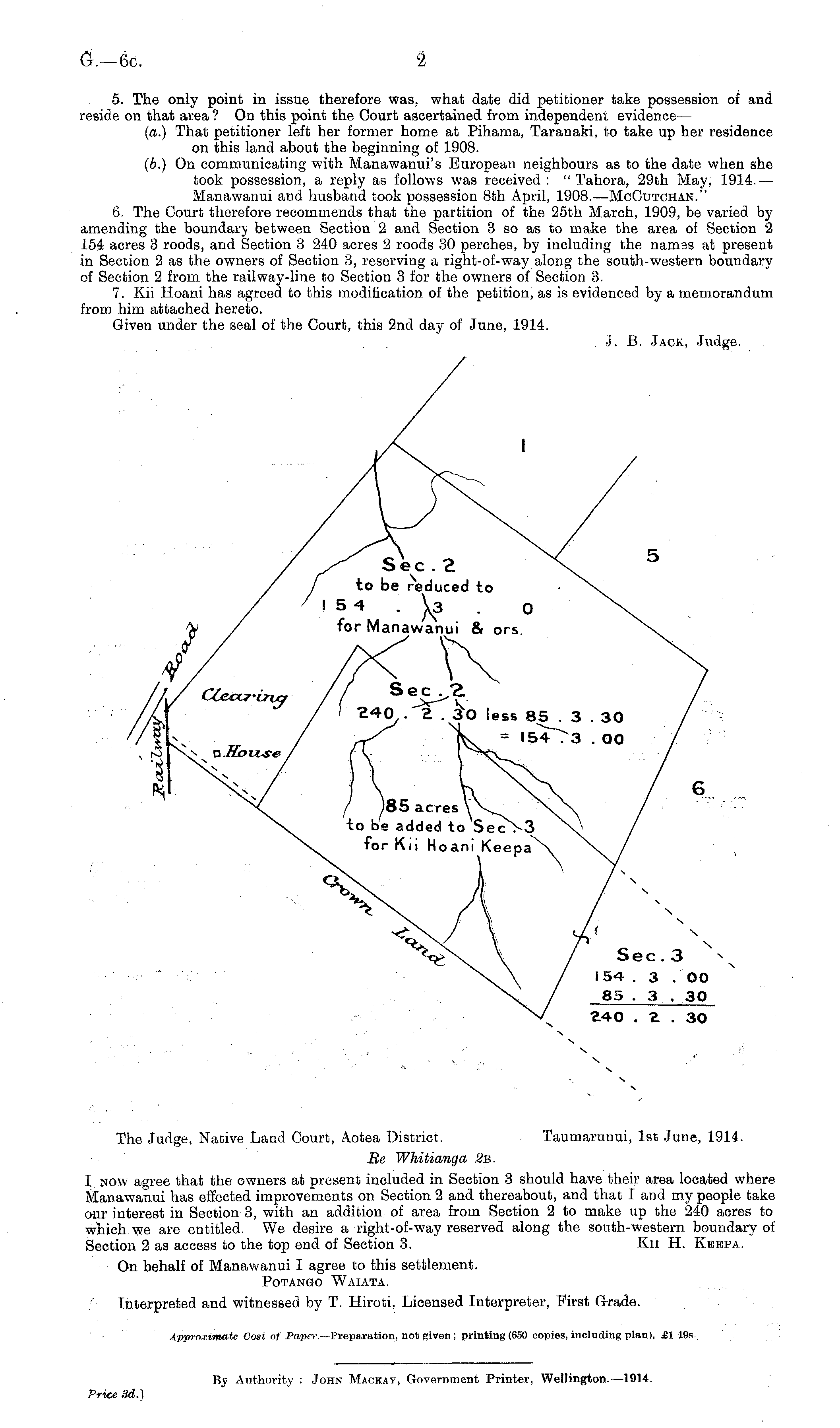 The Judge, Native Land Court, Aotea District. Taumarunui, Ist June, 1914. Be Whitianga Hβ. I now agree that the owners at present included in Section 3 should have their area located where Manawanui has effected improvements on Section 2 and thereabout, and that I and my people take our interest in Section 3, with an addition of area from Section 2 to make up the 240 acres to which we are entitled. We desire a right-of-way reserved along the south-western boundary of Section 2 as access to the top end of Section 3. Xii H. Kbepa. On behalf of Manawanui I agree to this settlement. POTANGO WAIATA. Interpreted and witnessed by T. Hiroti, Licensed Interpreter, First Grade. Approximate Cost of Paper.— Preparation, not given ; printing (650 copies, including plan), £1 19s