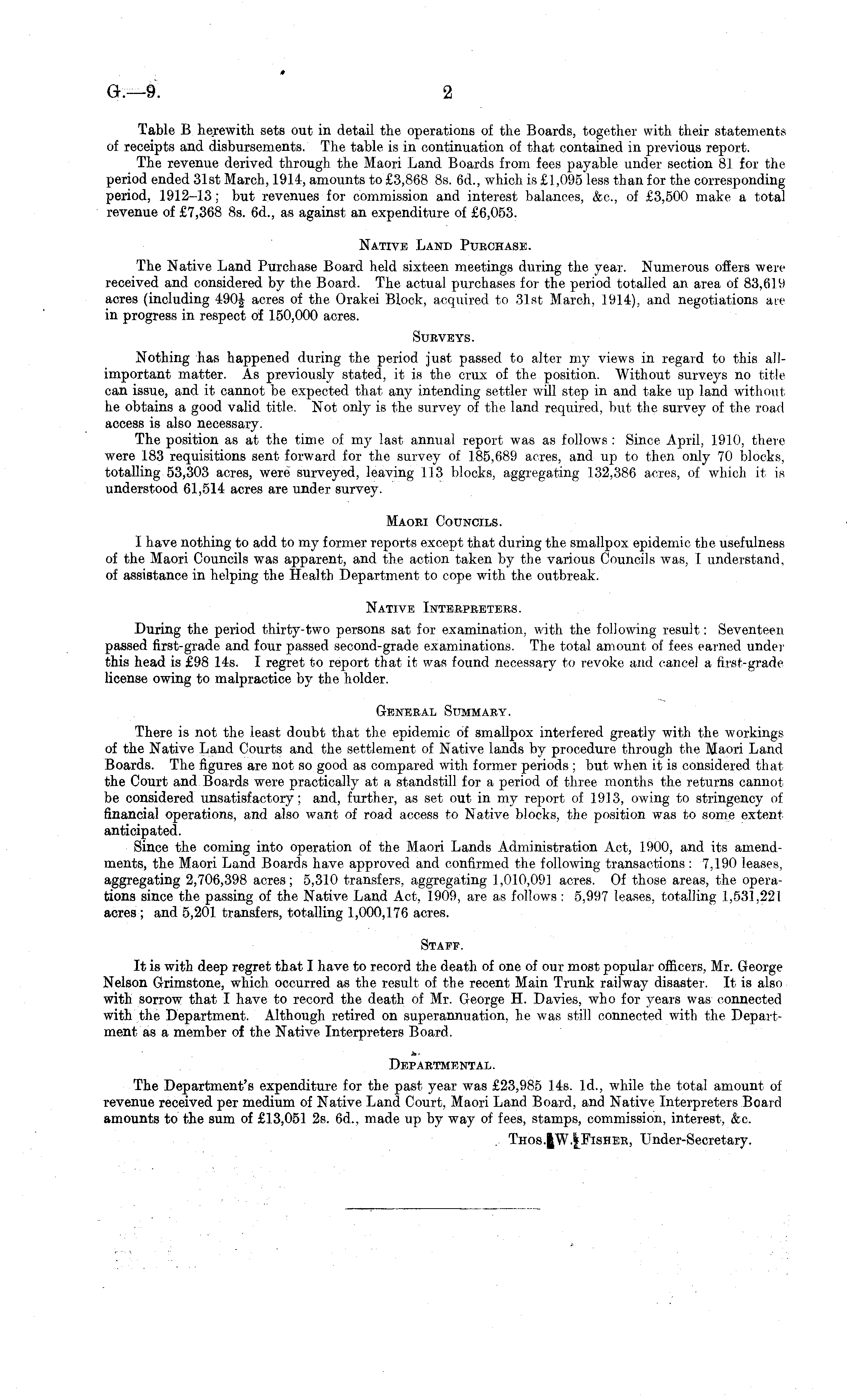 Table B herewith sets out in detail the operations of the Boards, together with their statements of receipts and disbursements. The table is in continuation of that contained in previous report. The revenue derived through the Maori Land Boards from fees payable under section 81 for the period ended 31st March, 1914, amounts to £3,868 Bs. 6d., which is £1,095 less than for the corresponding period, 1912-13; but revenues for commission and interest balances, &c, of £3,500 make a total revenue of £7,368 Bs. 6d., as against an expenditure of £6,053. Native Land Purchase. The Native Land Purchase Board held sixteen meetings during the year. Numerous offers were received and considered by the Board. The actual purchases for the period totalled an area of 83,619 acres (including 490| acres of the Orakei Block, acquired to 31st March, 1914), and negotiations are in progress in respect of 150,000 acres. Surveys. Nothing has happened during the period just passed to alter my views in regard to this allimportant matter. As previously stated, it is the crux of the position. Without surveys no title can issue, and it cannot be expected that any intending settler will step in and take up land withoul he obtains a good valid title. Not only is the survey of the land required, but the survey of the road access is also necessary. The position as at the time of my last annual report was as follows : Since April, 1910, there were 183 requisitions sent forward for the survey of 185,689 acres, and up to then only 70 blocks, totalling 53,303 acres, were surveyed, leaving 113 blocks, aggregating 132,386 acres, of which it is understood 61,514 acres are under survey. Maori Councils. I have nothing to add to my former reports except that during the smallpox epidemic the usefulness of the Maori Councils was apparent, and the action taken by the various Councils was, 1 understand. of assistance in helping the Health Department to cope with the outbreak. Native Interpreters. During the period thirty-two persons sat for examination, with the following result: Seventeen passed first-grade and four passed second-grade examinations. The total amount of fees earned under this head is £98 14s. I regret to report that it was found necessary to revoke and cancel a first-grade license owing to malpractice by the holder. General Summary. There is not the least doubt that the epidemic of smallpox interfered greatly with the workings of the Native Land Courts and the settlement of Native lands by procedure through the Maori Land Boards. The figures are not so good as compared with former periods : but when it is considered that the Court and Boards were practically at a standstill for a period of three months the returns cannot be considered unsatisfactory; and, further, as set out in my report of 1913, owing to stringency of financial operations, and also want of road access to Native blocks, the position was to some extent anticipated. Since the coining into operation of the Maori Lands Administration Act, 1900, and its amendments, the Maori Land Boards have approved and confirmed the following transactions : 7,190 leases, aggregating 2,706,398 acres; 5,310 transfers, aggregating 1,010,091 acres. Of those areas, the operations since the passing of the Native Land Act, 1909, are as follows : 5,997 leases, totalling 1,531,221 acres ; and 5,201 transfers, totalling 1,000,176 acres. Staff. It is with deep regret that I have to record the death of one of our most popular officers, Mr. George Nelson Grimstone, which occurred as the result of the recent Main Trunk railway disaster. It is also with sorrow that I have to record the death of Mr. George H. Davies, who for years was connected with the Department. Although retired on superannuation, he was still connected with the Department as a member of the Native Interpreters Board. Departmental . The Department's expenditure for the past year was £23,985 14s. Id., while the total amount of revenue received per medium of Native Land Court, Maori Land Board, and Native Interpreters Board amounts to the sum of £13,051 2s. 6d., made up by way of fees, stamps, commission, interest. &c. Thos.|W.|Fisher, Under-Secretary.