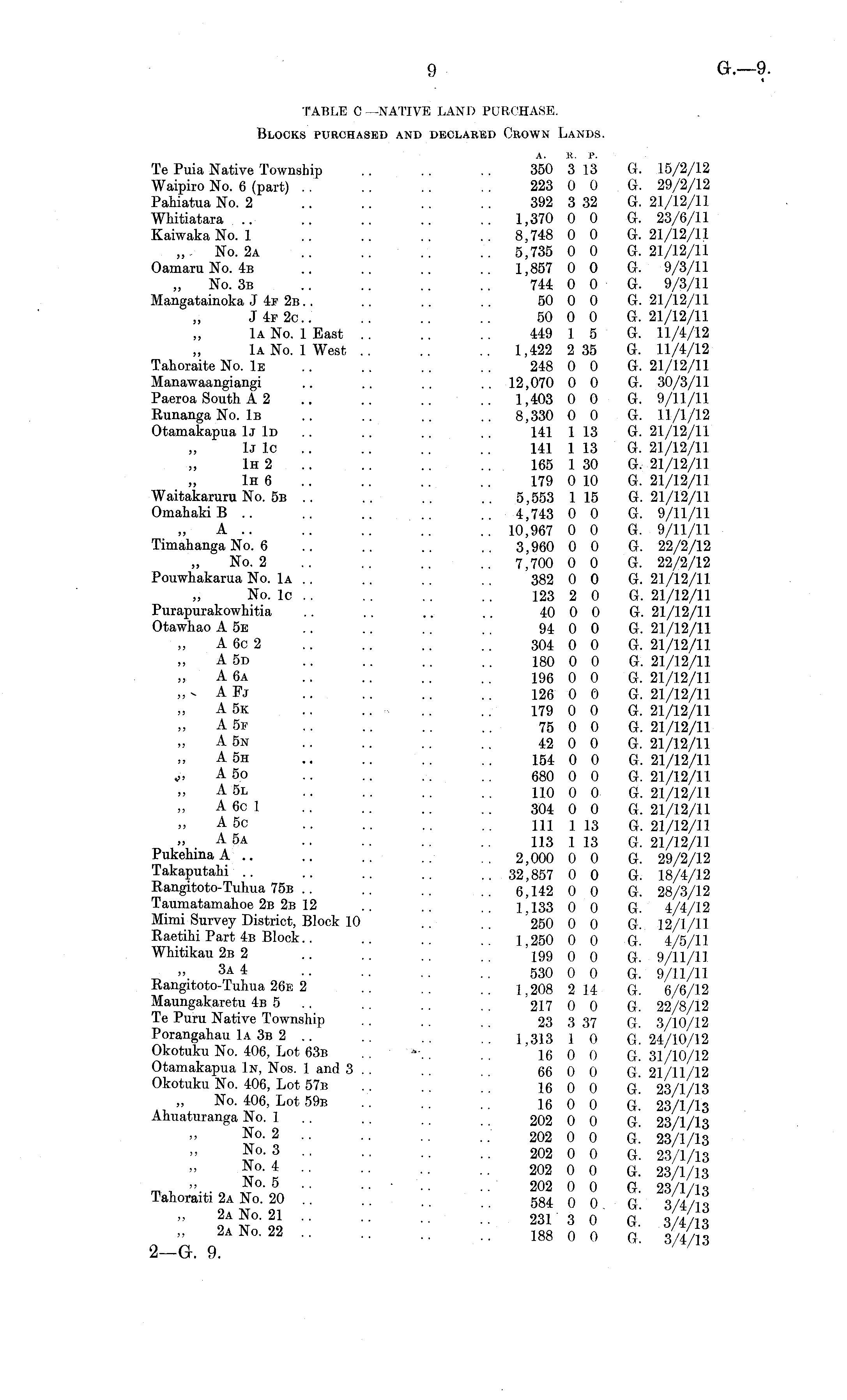 TABLE C —NATIVE LAND PURCHASE. Blocks purchased and declared Crown Lands. A. K. P. Te Puia Native Township .. .. .. 350 313 G. 15/2/12 Waipiro No. 6 (part) .. 223 0 0 G. 29/2/12 Pahiatua No. 2 392 3 32 G. 21/12/11 Whitiatara .. .. .. 1,370 0 0 G. 23/6/11 KaiwakaNo. 1 8,748 0 0 G. 21/12/11 No. 2a 5,735 0 0 G. 21/12/11 OamaruNo. 4b .. .. .. .. 1,857 0 0 G. 9/3/11 „ No. 3b .. 744 0 0 G. 9/3/11 Mangatainoka J4f 2b .. .. . 50 0 0 G. 21/12/11 J4f2c 50 0 0 G. 21/12/11 Iα No. 1 East .. .. .. 449 1 5 G. 11/4/12 Iα No. 1 West 1,422 235 G. 11/4/12 Tahoraite No. 1e .. .. .. .. 248 0 0 G. 21/12/11 Manawaangiangi .. .. .. .. 12,070 0 0 G. 30/3/11 Paeroa South A 2 .. .. .. .. 1,403 0 0 G. 9/11/11 RunangaNo. Iβ .. .. .. .. 8,330 0 0 G. 11/1/12 Otamakapua 1j Id .. 141 113 G. 21/12/11 1j lc 141 1 13 G. 21/12/11 1h 2 165 1 30 G. 21/12/11 1h 6 179 0 10 G. 21/12/11 Waitakaruru No. 5b .. .. .. .. 5,553 115 G. 21/12/11 Omahaki B .. .. .. .. .. 4,743 0 0 G. 9/11/11 A.. .. .. .. .. 10,967 0 0 G. 9/11/11 Timahanga No. 6 .. .. .. 3,960 0 0 G. 22/2/12 No. 2 .. .. .. .. 7,700 0 0 G. 22/2/12 Pouwhakarua No. Iα .. .. .. .. 382 0 0 G. 21/12/11 No. lc .. .. .. .. 123 2 0 G. 21/12/11 Purapurakowhitia .. .. .. .. 40 0 0 G. 21/12/11 Otawhao Ase .. .. .. .. 94 0 0 G. 21/12/11 A6c 2 .. .. .. .. 304 0 0 G. 21/12/11 Asd .. .. .. .. 180 0 0 G. 21/12/11 A6a 196 0 0 G. 21/12/11 >o AFj 126 0 0 G. 21/12/11 Ask .. ... .. .. 179 0 0 G. 21/12/11 Asf .. .. .. .. 75 0 0 G. 21/12/11 Asn .. .. .. .. 42 0 0 G. 21/12/11 Ash .. .. .. .. 154 0 0 G. 21/12/11 .;. Aso .. .. .. .. 680 0 0 G. 21/12/11 Asl .. .. .. .. 110 0 0 G. 21/12/11 A6c 1 .. .. .. .. 304 0 0 G. 21/12/11 Asc .. .. .. .. 11l 113 G. 21/12/11 Asa .. .. .. .. 113 113 G. 21/12/11 PukehmaA .. .. .. .. . 2,000 0 0 G. 29/2/12 Takaputahi .. .. .. .. 32,857 0 0 G. 18/4/12 Rangitoto-Tuhua 75b .. .. 6,142 0 0 G. 28/3/12 Taumatamahoe 2b 2b 12 .. .. .. 1,133 0 0 G. 4/4/12 Mimi Survey District, Block 10 .. .. '250 0 0 G. 12/1/11 Raetihi Part 4b Block.. .. .. .. 1,250 0 0 G. 4/5/11 Whitikau 2b 2 .. 199 0 0 G. 9/11/11 _ ». 3a 4 .. .. .. .. 530 0 0 G. 9/11/11 Rangitoto-Tuhua 26e 2 .. .. .. 1,208 214 G. 6/6/12 Maungakaretu 4b 5 .. .. .. .. 217 0 0 G. 22/8/12 Te Puru Native Township .. .. .. 23 337 G. 3/10/12 Porangahau Iα 3b 2 1;313 1 0 G. 24/10/12 Okotuku No. 406, Lot 63b .."■.. .. 16 0 0 G. 31/10/12 Otamakapua In, Nos. 1 and 3 . . .. . . 66 0 0 G. 21/11/12 Okotuku No. 406, Lot 57b .. 16 0 0 Gγ! 23/1/13 No. 406, Lot 59b .. .. .. 16 0 0 G. 23/1/13 Ahuaturanga No. 1 .. .. .. _ _ 202 0 0 G. 23/1/13 2°- 2 202 0 0 G. 23/1/13 *}°- 3 202 0 0 G. 23/1/13 T °- 4 202 0 0 G. 23/1/13 No - 5 ■■ ..•'.. .. 202 0 0 G 23/1/ is Tahoraiti 2a No. 20 584 0 0 G 3/4/1 % 2a No - 21 .. 2313 0 G 3/4/ iS 2aNo - 22 188 0 0 t \%%