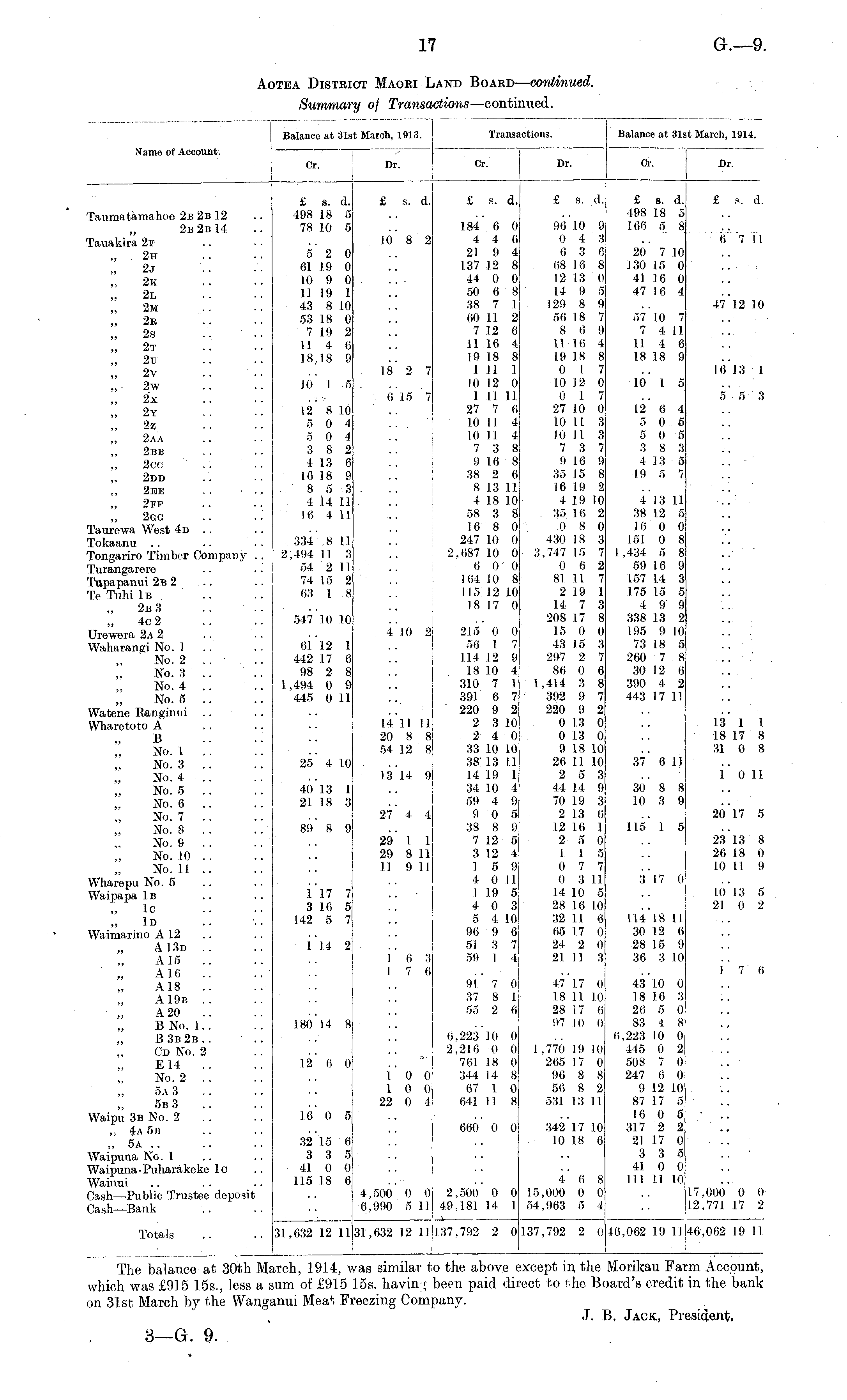 Balance at 31i it March, 1913. Transactions. Balance at 31st March, 1914. Same of Account. I Or. Dr. Or. Bγ. Cγ. Dr. £ s. d. 498 18 5 78 10 5 £ s. d. £ s. d. £ s. d. £ 8. d. 498 18 5 166 5 8 £ s. d. Taumatamahoe 2b 2b 12 2b2b 14 Tauakira 2f 2h 2j 2k 2l 2m 2e 2s 2t 2tt 2v „. 2w 2x 2y „ 2z ,, 2aa 2bb „ 2cc 2dd 2ee .. .. ,, 2m , 2gg Taurewa West 4d .. Tokaanu Tongariro Timber Company .. Turangarere Tupapanui 2b 2 To Tuhi Iβ 2b 3 4c 2 Urewera 2a 2 Waharangi No. I „ No. 2 . . No. 3 .. No. 4 .. No. 5 .. Wateno Ranginui Wharetoto A B No. 1 .. No. 3 No. 4 .. No. 3 .. No. 6 .. No. 7 No. 8 .. No. 9 .. No. 10 .. No. 11 .. Wharepu No. 5 Waipapa Iβ lc Id VVaimarino A 12 A 13d .. A 15 A 16 A 18 A 19b A 20 B No. 1.. B 3b 2b .. Cd No. 2 E 14 No. 2 . . 5a 3 5b 3 Waipu 3b No. 2 ,, 4a 5js „ 5a .. Waipuna No. 1 Waipuna-Puharakeke lc Wainui Cash —Public Trustee deposit Gash—Bank 5 2 0 61 19 0 10 9 0 11 19 1 43 8 10 53 18 0 7 19 2 114 6 18,18 9 10 1 5 12 8 10 5 0 4 5 0 4 3 8 2 4 13 6 16 18 9 8 5 3 4 14 11 16 4 11 334 8 11 2,494 11 3 54 2 11 74 15 2 63 I 8 10 8 2 18 2 7 6 15 7 184 6 0 4 4 6 2.1 9 4 137 12 8 44 0 0 50 6 8 38 7 I 60 11 2 7 12 6 11 16 4 19 18 8 1 11 1 10 12 0 1 11 11 27 7 6 10 11 4 10 11 4 7 3 8 9 16 8 38 2 6 8 13 11 4 18 10 58 3 8 16 8 0 247 10 0 2.687 10 0 (i 0 0 164 10 8 115 12 10 18 17 0 90 10 9 0 4 3 (i 3 6 (58 16 8 12 13 0 14 9 5 12!) 8 9 56 18 7 8 6 9 11 16 4 19 18 8 0 I 7 10 12 0 0 1 7 27 10 0 10 I I 3 10 11 3 7 :i 7 9 16 9 35 15 8 16 19 2 4 19 10 35 16 2 0 8 0 430 18 3 3,747 15 7 0 6 2 81 11 7 2 19 1 14 7 3 208 17 8 15 0 0 43 15 3 297 2 7 86 0 6 1.414 3 8 392 9 7 220 9 2 0 13 0 0 13 0 9 18 10 26 11 10 2 5 3 44 14 9 70 19 3 2 13 6 12 16 1 2 5 0 1 1 5 0 7 7 0 3 11 14 10 5 28 Iβ 10 32 11 6 65 17 0 24 2 0 21 II 3 20 7 10 130 15 0 41 16 0 47 16 4 •17 10 7 7 4 11 114 6 18 18 9 10 1 5 12 6 4 •"> 0 5 5 0 5 3 8 31 4 13 5 19 5 7 4 13 11 38 12 5 16 0 0 151 0 8 1,434 5 8 59 16 9 157 14 3 175 15 5 4 9 9 338 13 2 195 9 10 73 18 5 260 7 8 30 12 6 390 4 2 443 17 11 6 7 11 47 12 10 16 J 3 1 5 5 3 547 10 10 410 2 215 0 0 56 1 7 114 12 9 18 10 4 310 7 1 391 6 7 220 9 2 2 3 10 2 4 0 33 10 10 38 13 11 14 19 1 34 10 4 59 4 9 9 0 5 38 8 9 7 12 5 3 12 4 1 5 9 4 0 11 1 19 5 4 0 3 5 4 10 96 9 6 51 3 7 59 1 4 61 12 1 442 17 6 98 2 8 1,494 0 9 445 0 11 14 11 11 20 8 8 ; 54 12 8; 13 1 1 18 17 8 31 0 8 25 4 1.0 13 14 9! 37' 6 II 1 0 11 40 13 1 21 18 3 30 8 8 10 3 9 I 27 4 4 20 17 5 89 8 9 115 1 5 23 13 8 26 18 0 10 II 9 29 1 1 29 8 11 11 9 11 3 17 0 10 13 5 21 0 2 1 17 7 3 16 5 142 5 7 114 18 11 30 12 6 28 15 9 36 3 10 1 14 2 I (i 3 I 7 6 I 7 6 91 ' 7 0 37 8 1 55 2 6 47 17 0 18 11 10 28 17 6 97 10 0 43 10 0 18 16 3 2(> 5 0! 83 4 8 6,223 10 0 445 0 2 508 7 0 247 6 0 9 12 10 87 17 5 16 0 5 317 2 2 21 17 0 3 3 5 41 0 0 111 11 10 180 14 8 6,223 10 0 2,216 0 0 761 18 0 344 14 8 67 1 0 64J 11 8 12' 6 0 . . 1 0 0 I 0 0 22 0 4 1,770 19 10 265 17 0 96 8 8 56 8 2 531 13 11 16 0 5 660 0 0 342'17 10 10 18 6 32 15 6 3 3 5 41 0 0 115 18 6 4,500 0 0 6,990 5 11 2,500 0 0 49,181 14 1 4 6 8 15,000 0 0 54,963 5 4 17,000 0 0 12,771 17 2 Totals 31,632 12 11 31,632 12 11 137,792 2 0 137,792 2 0 +0,062 19 11 46,062 19 11