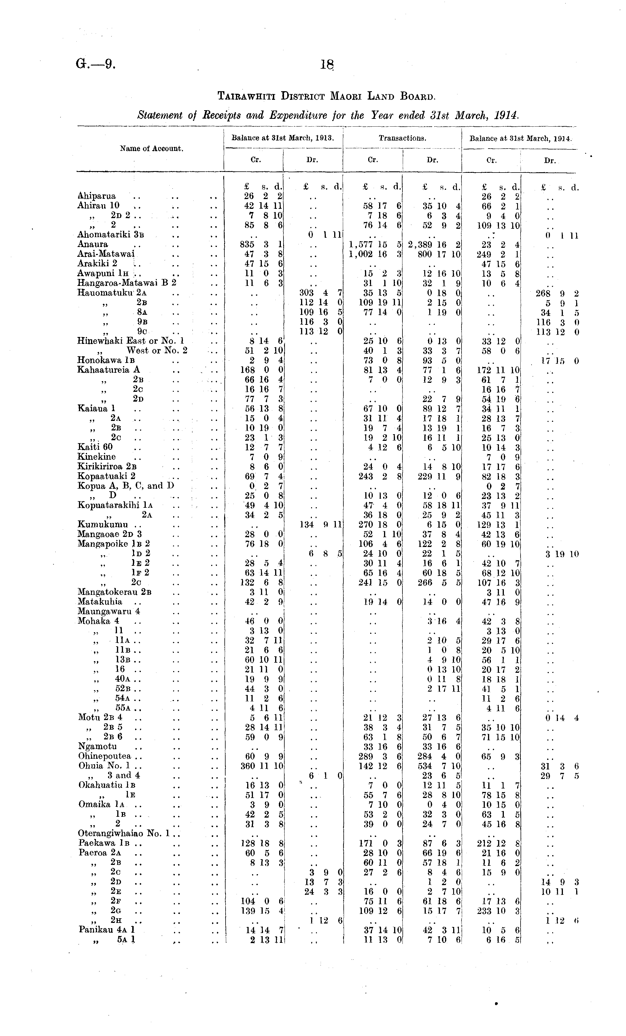 i Balance at 31st March, 1913. Transactions. Balance at 31st March, 1914. Name of Account. Cr. Dr. Cr. Dr. Cr. Dr. £ s. d. 26 2 2 42 14 11 7 8 10 85 8 6 £ s. d. £ e. d. £ s. d. £ s. d. 26 2 2 66 2 1 9 4 0 109 13 10 23' 2 4 249 2 1 47 15 6 13 5 8 10 6 4 £ s. d. Akiparua Ahirau 10 2d 2 .. 2 Ahomatariki 3b Anaura Arai-Matawai Arakiki 2 Awapuni 1h .. Hangaroa-Matawai B 2 Hauomatuku 2a 2b 8a 9b 9c Hinewhaki East or No. 1 West or No. 2 Honokawa Iβ Kahaatureia A 2b 2c 2d Kaiaua 1 2a .. 2b .. „ 2c .. Kaiti 60 Kinekine Kirikiriroa 2b Kopaatuaki 2 Kopua A, B, 0, and 1) „ D .. Kopuatarakihi Iα 2a Kumukumu .. Mangaoae 2d 3 Mangapoike Iβ 2 Id 2 1e2 If 2 2c Mangatokerau 2b Matakuhia Maungawaru 4 Mohaka 4 11 .. llA.. llB.. 13b .. 16 .. 40a .. 52b .. 54a .. 55a .. Motu 2b 4 .. „ 2b 5 .. „ 2b 6 .. Ngamotu Ohinepoutea Ohuia No. 1 .. 3 and 4 Okahuatin Iβ Ik Omaika Iα.. Iβ .. 2 .. Oterangiwhaiao No. 1 .. Paekawa Iβ.. Paeroa 2a „ 2b .. „ 2c .. „ 2d .. „ 2e .. „ 2f .. ., 2g .. „ 2h .. Panikau 4a 1 „ 5a 1 835 3 1 47 3 8 47 15 6 11 0 3 11 6 3 8 14 6 51 2 10 2 9 4 168 0 0 66 16 4 16 16 7 77 7 3 56 13 8 15 0 4 10 19 0 23 1 3 12 7 7 7 0 9 8 6 0 69 7 4 0 2 7 25 0 8 49 4 10 34 2 5 28 0 0 76 18 01 28' 5 4 63 14 11 132 6 8 3 11 01 42 2 9i 0 1 11 303 4 7 112 14 0 109 16 5 116 3 0 113 12 0 134 9 11 6' 8 5 58 17 6 7 18 6 76 14 6 1,577 J 5 5 1,002 16 3 15 2 3 31 1 l<) 35 13 5 109 19 11 77 14 0 25 10 6 40 1 3 73 0 8 81 13 4 7 0 0 67 10 0 31 11 4 19 7 4 19 2 10 4 12 6 24 0 4 243 2 8 10 13 0 47 4 0 36 18 0 270 18 0 52 1 10 106 4 6 24 10 0 30 11 4 65 16 4 241 15 0 35 10 4 6 3 4 52 9 2 2,389 16 2 800 17 10 12 16 10 32 1 9 0 18 0 2 15 0 1 19 0 0 13 0 33 3 7 93 5 0 77 1 6 12 9 3 22 7 9 89 12 7 17 18 1 13 19 1 16 11 1 6 5 10 14 8 10 229 11 9 12 0 6 58 18 11 25 9 2 6 15 0 37 8 4 122 2 8 22 1 5 16 6 1 60 18 5 266 5 5 33 12 0! 58 0 6 172 11 IO| 61 7 I 16 16 7 54 19 6 34 11 1 28 13 7 16 7 3 25 13 0 10 14 3 7 0 9 17 17 6 82 18 3 0 2 7 23 13 2 37 9 11 45 11 3 129 13 1 42 13 6 60 19 10 42 10 7 68 12 10 107 16 3 3 11 0 47 16 9 0 I 11 268 9 2 5 9 1 34 1 5 116 3 0 113 12 0 17 15 0 3 19 10 1914 0 14 0 0 46 0 0 3 13 0 32 7 11 21 6 6 60 10 11 21 11 0 19 9 9 44 3 0 11 2 6 4 116 5 6 11 28 14 11 59 0 9 3 16 4 2 10 5 1 0 8 4 9 10 0 13 10 0 11 8 2 17 11 42 3 8 3 13 0 29 17 6 20 5 10 56 1 1 20 17 2 18 18 1 41 5 1 112 6 4 11 6 21 12 3 38 3 4 63 1 8 33 16 6 289 3 6 142 12 6 27 13 6 31 7 5 50 6 7 33 16 6 284 4 0 534 7 10 23 6 5 12 11 5| 28 8 10j 0 4 0 32 3 0! 24 7 O! 35 10 10 71 15 10 0 14 4 60 9 9 360 11 10 65 9 3 3± 3 6 29 7 5 6 1 0 16 13 0 51 17 0 3 9 0 42 2 5 31 3 8 7 0 0 55 7 6 7 10 0 53 2 0 39 0 0 11 1 7 78 15 8 10 15 0 63 1 5 45 16 8 128 18 8 60 5 6 8 13 3 171 0 3 28 10 0 60 11 0 27 2 6 87 6 3 1 66 19 6j 57 18 l> 8 4 6; 1 2 0 2 7 10! 61 18 6; 15 17 7 212 12 S 21 16 0 11 6 2 15 9 0 3 9 0 13 7 3 24 3 3 14 9 3 10 11 1 104 0 6i 139 16 4J 16 0 0 75 11 6 109 12 6 17 13 6 233 10 3 14 14 7 2 13 Hi .[ 1 12 6 37 14 10 11 13 0 42 3 11 7 10 6: 1 12 (i • 10 5 6 6 16 5