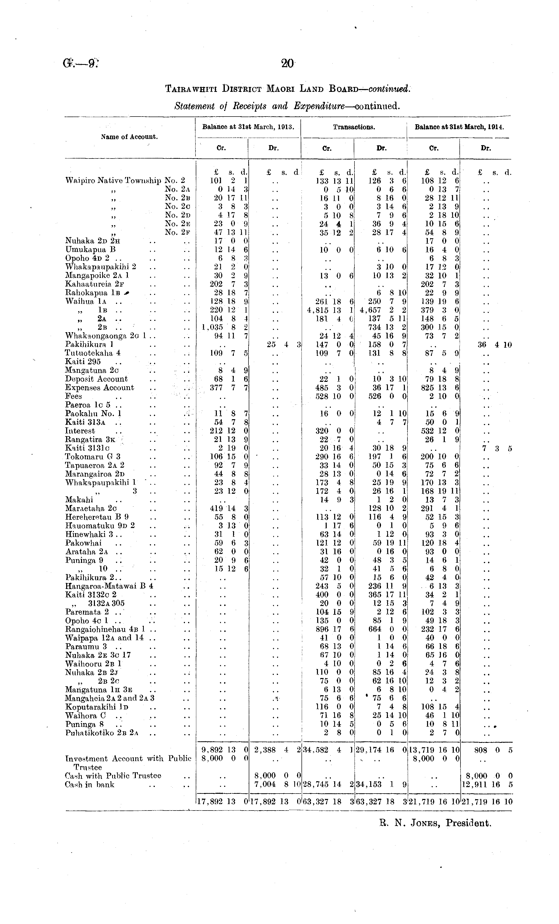 Balance at 31st March, 1913. Transactions. Balance at 31st March, 1914. Name of Account. Cr. Dr. Cr. Dr. Cr. Dr. Waipiro Native Township No. 2 No. 2a No. 2b No. 2c No. 2d No. 2b No. 2f Nuhaka 2d 2h Umukapua B Opoho 4d 2 .. Wbakapaupakihi 2 .. Mangapoike 2a 1 Kahaatureia 2f Rahokapua 1b * Waihua IA .. Ib . . „ 2a 2b .. .. .'. Whakaongaonga 2o I .. Pakihikura 1 Tutuotekaha 4 .. .: Kaiti 295 Manga tuna 2 c .. Deposit Account Expenses Account .. Pees .. .. £ s. d. 101 2 1 0 14 3 20 17 II 3 8 3 4 17 8 23 0 9 47 13 II 17 0 0 12 14 6 6 8 3 21 2 0 30 2 9 202 7 3 28 1.8 7 128 18 9 220 12 I 104 8 4 1.035 8 2 94 11 7 £ s. d £ s. d. 133 13 11 0 5 10 16 11 0 3 0 0 5 .10 8 24 4 1 35 12 2 £ s. d. 126 3 6 0 6 6 8 16 0 3 14 6 7 9 6 36 9 4 28 17 4 £ s. d. 108 12 6 0 13 7 28 12 11 2 13 9 2 18 10 10 15 6 54 8 9 17 0 0 16 4 0 6 8 3 17 1:2 0 32 10 1 202 7 3 22 9 9 139 19 6 379 3 0 148 6 5 300 15 0 73 7 2 £ s. d. 10 0 0 6 10 6 13 0 6 3 10 0 10 13 2 261. 18 6 4,815 13 I 181 4 C 6 8 10 250 7 9 4,657 2 2 137 5 11 734 13 2 45 16 9 158 0 7 131 8 8 109 7 5 25 4 2 25 4 3 24 12 4 147 0 0 109 7 0 87 5 9 36 4 10 8 4 9 68 1 6 377 7 7 22 1 0 485 3 Oj 528 10 O! 10 3 10 36 17 1 526 0 0 8 4 9 79 18 8 825 13 6 2 10 0 Paeroa 1c 5 .. Paokahu No. 1 .. ., Kaiti 313a .. Interest Rangatira 3k Kaiti 3131c Tokomaru G 3 Tapuaeroa 2a 2 Marangairoa 2d Wbakapaupakihi 1 ' .. 3 .. Makahi Maraetaha 2c Hereheretau B 9 Hauomatuku 9d 2 Hinewhaki 3 .. Pakowhai Arataha 2a .. Puninga 9 .. 10 .. Pakihikura 2.. Hangaroa-Matawai B 4 Kaiti 3132c 2 „ 3132a 305 Paremata 2 .. .. Opoho 4c 1 .. Rangaiohinehau 4b 1 • • Waipapa 12a and 14 .. Paraumu 3 .. Nuhaka 2e 3o 17 Waihooru 2b 1 Nuhaka 2b 2j „ 2b 2o Mangatuna 1h 3e Mangahoia 2A 2 and 2a 3 Koputarakihi Id Waihora C .. Puninga 8 ... Puhatikotiko 2b 2a 11 8 7 54 7 8 212 12 0 21 13 9 2 19 0 106 15 0 92 7 9 44 8 8 23 8 4 23 12 0 419 14 3 55 8 0 3 13 0 31 I 0 59 6 3 62 0 0 20 9 6 15 12 6 16 0 0 320 0 0 22 7 0; 20 16 4! 290 16 6 33 14 0 28 13 0 173 4 8 172 4 0 14 9 3 113 12 0 1 17 6 63 14 0 121 12 0 31 16 0 42 0 0 32 I 0 57 10 0 243 5 0 400 0 0 20 0 0 104 15 9 135 0 0 896 17 6 41 0 0 68 13 0 67 10 0: 4 10 Oj 110 0 0 75 0 0 6 13 0 75 6 6 116 0 0 71 16 8 10 14 5 2 8 0 12 1 10 4 7 7 30 18 9 197 I 6 50 15 3 0 14 6 25 19 9 26 16 I 1 2 0 128 10 2 116 4 9 0 1 0 1 12 0 59 19 II 0 16 0 48 3 5 41 5 6 15 6 0 236 11 9 365 17 11 12 15 3 2 12 6 85 I. 9 664 0 0 1 0 0 I 14 6 1 14 0 0 2 6 85 16 4 62 16 10 6 8 10 ' 75 6 6 7 4 8 25 14 10 0 5 6 0 1 01 15 6 9 50 0 1 532 12 0 26 1 9 200 10 0 75 6 6 72 7 2 170 13 3 168 19 11 13 7 3 291 4 1 52 15 3 5 9 6 93 3 0 120 18 4 93 0 01 14 6 1 6 8 0| 42 4 0; 6 13 3 34 2 1 7 4 9 102 3 3 49 18 3 232 17 6 40 0 0 66 18 6 65 16 0 4 7 6 24 3 8 12 3 2 0 4 2 i' 3 5 108 15 4 46 1 10 10 8 11 2 7 0 Investment Account with Public Trustee Cash with Public Trustee Cash in bank 9.892 13 0 8,000 0 0 2,388 4 2 34,582 4 1 29,174 16 0 13,719 16 10 8,000 0 0 808 0 5 8,000 0 0 7,004 8 1.0 28,745 14 2 34,153 1 9 8,000 0 0 1.2,911 16 5 21,719 16 10 17,892 13 0' 17,892 13 0 1 '63,327 18 31 163,327 18 3 1 '21 ,719 16 10
