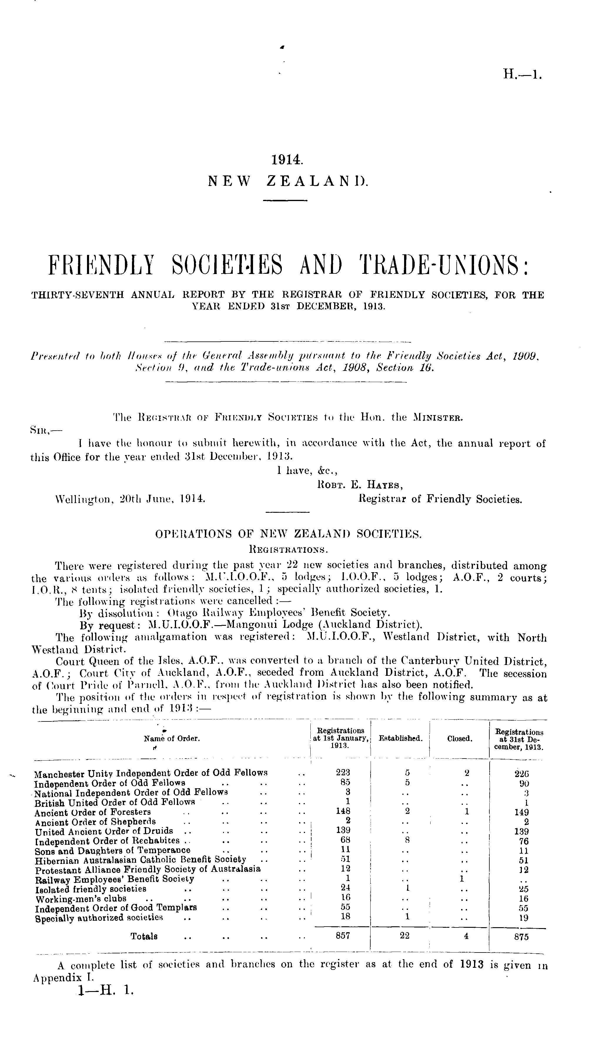 Presented to both House* of tht General Assembly pursuant to the Friendly Societies Act, 1909, Section '■). and //it, Trade-unions Act, 1908, Section Iβ. The Registrar of Friendlt Societies to the Hun. the Minister. Snt, — I have the honour to submil herewith, in accordance with the Act, the annual report of this Office for the pear ended 31st December, L 913. I have, &c, ttoirr. E. Hates, Wellington, 20th June, 1914. Registrar of Friendly Societies. OPERATIONS OF NEW ZEALAND SOCIETIES. Registrations. There were registered during the past year 22 new societies and branches, distributed among the various orders as Follows: M.U.1.0.0.F., 5 Lodges; 1.0.0. F., 5 lodges; A.0.F., 2 courts; [.0.R., 8 tents; isolated friendly societies, 1 ; specially authorized societies, 1. The following registrations were cancelled :— By dissolution : Otago Railway Employers' Benefit Society. By request: M.U.1.0.0.F. —Mangonui Lodge (Auckland District). The following amalgamation was registered: M.U.1.0.0.F., Westland District, with North Westland District. Court Queen of the Isles, A.0.F., was converted to a branch of the Canterbury United District, A.0.F.; Court City of Auckland, A.0.F., seceded from Auckland District, A.O.F. The secession of Court Pride of Parnell, A.0.1 , '.. From the Auckland District lias also been notified. The position of the orders in respeel of registration is shown by the following summary as at the beginning and end of L 913 : —
