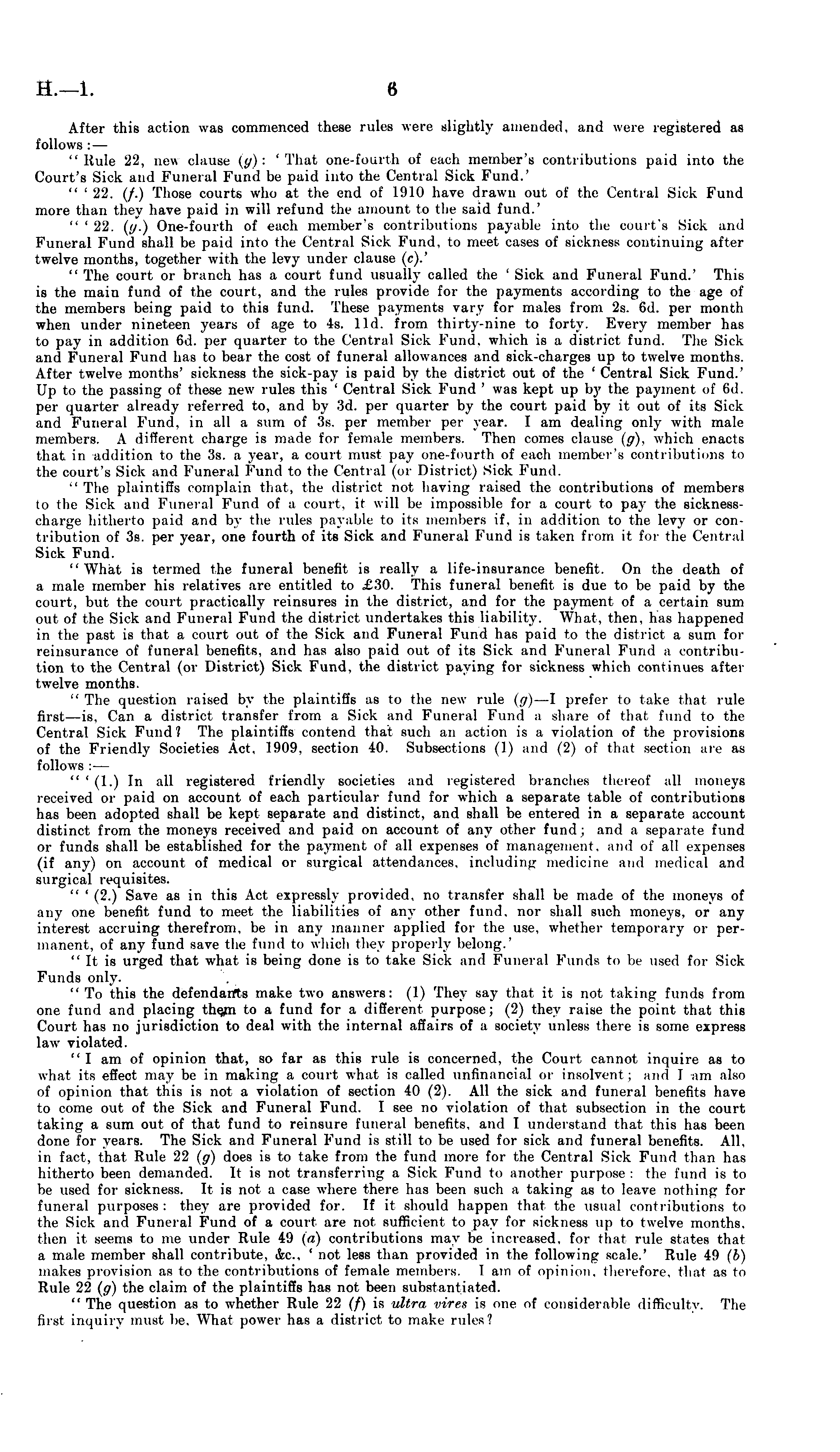 After this action was commenced these rules were slightly amended, and were registered as follows : — "Rule 22, new clause (y) : 'That one-fourth of each member's contributions paid into the Court's Sick and Funeral Fund be paid into the Central Sick Fund.' " '22. (/.) Those courts who at the end of 1910 have drawn out of the Central Sick Fund more than they have paid in will refund the amount to the said fund.' " ' 22. ((/.) One-fourth of each member's contributions payable into the court's Sick and Funeral Fund shall be paid into the Central Sick Fund, to meet cases of sickness continuing after twelve months, together with the levy under clause (c).' " The court or branch has a court fund usually called the ' Sick and Funeral Fund.' This is the main fund of the court, and the rules provide for the payments according to the age of the members being paid to this fund. These payments vary for males from 2s. 6d. per month when under nineteen years of age to 4s. lid. from thirty-nine to forty. Every member has to pay in addition 6d. per quarter to the Central Sick Fund, which is a district fund. The Sick and Funeral Fund has to bear the cost of funeral allowances and sick-charges up to twelve months. After twelve months' sickness the sick-pay is paid by the district out of the ' Central Sick Fund.' Up to the passing of these new rules this ' Central Sick Fund ' was kept up by the payment of (id. per quarter already referred to, and by 3d. per quarter by the court paid by it out of its Sick and Funeral Fund, in all a sum of 3s. per member per year. I am dealing only with male members. A different charge is made for female members. Then comes clause (g), which enacts that in addition to the 3s. a year, a court must pay one-fourth of each member's contributions to the court's Sick and Funeral Fund to the Central (or District) Sick Fund. " The plaintiffs complain that, the district not having raised the contributions of members to the Sick and Funeral Fund of a court, it will be impossible for a court to pay the sicknesscharge hitherto paid and by the rules payable to its members if, in addition to the levy or contribution of 3s. per year, one fourth of its Sick and Funeral Fund is taken from it for the Central Sick Fund. "What is termed the funeral benefit is really a life-insurance benefit. On the death of a male member his relatives are entitled to £30. This funeral benefit is due to be paid by the court, but the court practically reinsures in the district, and for the payment of a certain sum out of the Sick and Funeral Fund the district undertakes this liability. What, then, has happened in the past is that a court out of the Sick and Funeral Fund has paid to the district a sum for reinsurance of funeral benefits, and has also paid out of its Sick and Funeral Fund a contribution to the Central (or District) Sick Fund, the district paying for sickness which continues after twelve months. " The question raised by the plaintiffs as to the new rule (g) —l prefer to take that rule first —is. Can a district transfer from a Sick and Funeral Fund a share of that fund to the Central Sick Fund? The plaintiffs contend that such an action is a violation of the provisions of the Friendly Societies Act. 1909, section 40. Subsections (1) and (2) of that section are as follows :— " ' (1.) In all registered friendly societies and registered blanches thereof all moneys received or paid on account of each particular fund for which a separate table of contributions has been adopted shall be kept separate and distinct, and shall be entered in a separate account distinct from the moneys received and paid on account of any other fund; and a separate fund or funds shall be established for the payment of all expenses of management, and of all expenses (if any) on account of medical or surgical attendances, including medicine and medical and surgical requisites. " ' (2.) Save as in this Act expressly provided, no transfer shall be made of the moneys of any one benefit fund to meet the liabilities of any other fund, nor shall such moneys, or any interest accruing therefrom, be in any manner applied for the use, whether temporary or permanent, of any fund save the fund to which they properly belong.' " It is urged that what is being done is to take Sick and Funeral Funds to lie used for Sick Funds only. "To this the defendants make two answers: (1) They say that it is not taking funds from one fund and placing the/n to a fund for a different purpose; (2) they raise the point that this Court has no jurisdiction to deal with the internal affairs of a society unless there is some express law violated. " I am of opinion that, so far as this rule is concerned, the Court cannot inquire as to what its effect may be in making a court what is called unfinnncial or insolvent ; and I am also of opinion that this is not a violation of section 40 (2). All the sick and funeral benefits have to come out of the Sick and Funeral Fund. I see no violation of that subsection in the court taking a sum out of that fund to reinsure funeral benefits, and I understand that this has been done for years. The Sick and Funeral Fund is still to be used for sick and funeral benefits. All, in fact, that Rule 22 (g) does is to take from the fund more for the Central Sick Fund than has hitherto been demanded. It is not transferring a Sick Fund to another purpose : the fund is to be used for sickness. It is not a case wdiere there has been such a taking as to leave nothing for funeral purposes: they are provided for. If it should happen that the usual contributions to the Sick and Funeral Fund of a court are not sufficient to pay for sickness up to twelve months, then it seems to me under Rule 49 (a) contributions may be increased, for that rule states that a male member shall contribute, &c, ' not less than provided in the following scale.' Rule 49 (b) makes provision as to the contributions of female members. lam of opinion, therefore, that