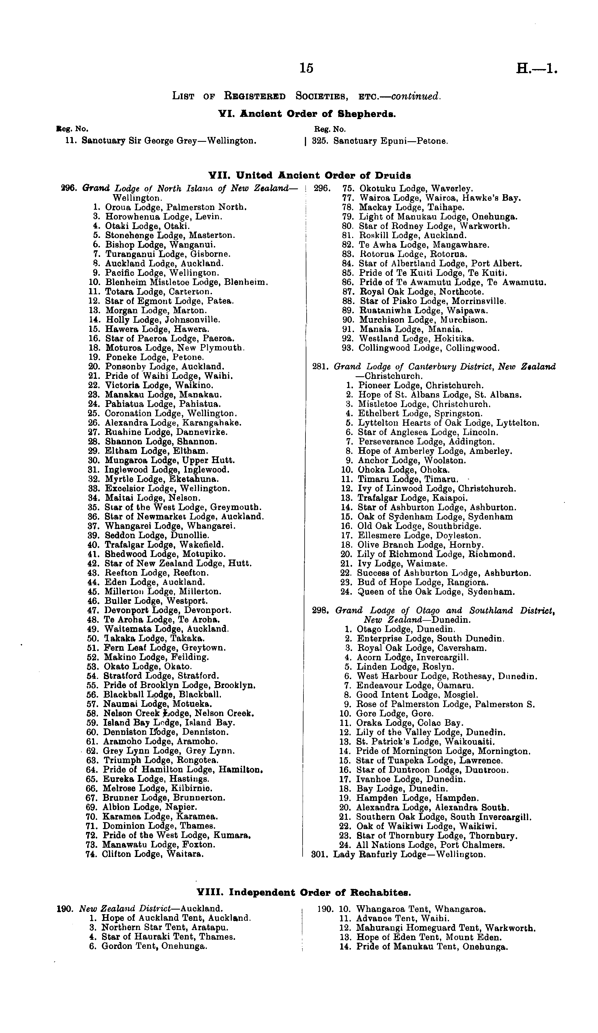 List of Registered Societies, etc. — continued. VI. Ancient Order of Shepherds. Keg. No. Reg. No. 11. Sanctuary Sir George Grey—Wellington. | 325. Sanotuary Epuni—Petone. VII. United Ancient Order of Druids