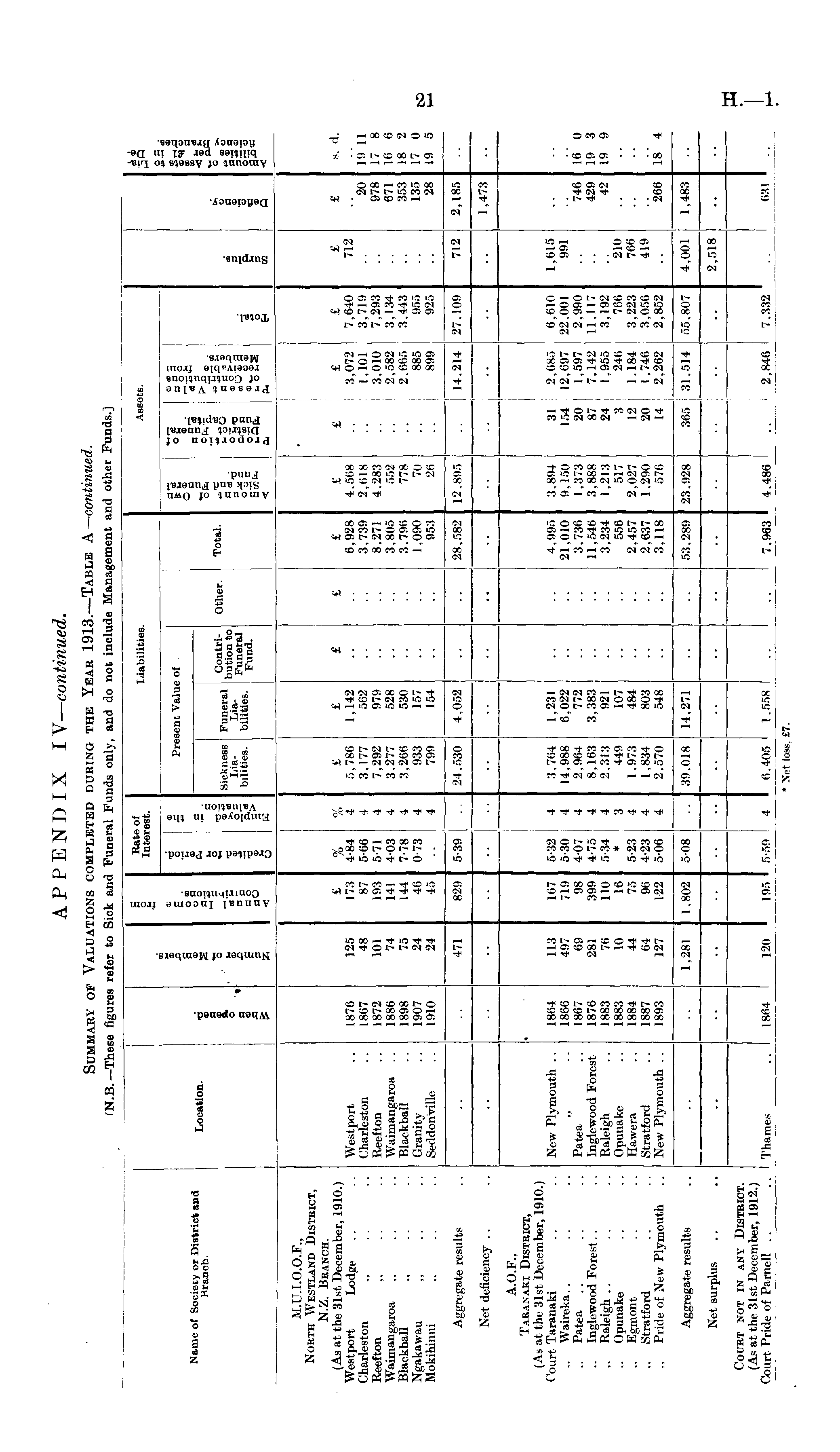 TN.B.-Tl ese igures rei :er to lie' am uneral .s onl !}•, anc io not ino! anagemenl am er 'un< .8. Name of Society or District and Branch. Location. i 8 1 s a J O m - c Bati Intel - o 1 !Ol ■est. V o o 2. Present Value of Liabilities. < "■go Assets. ear DC t J h o t*S < Contribution to Funeral Fund. Other. Total. I I Q Sickness Liabilities. Funeral Liabilities. r Jt.U.l.O.O.F., North Westland District, X.Z. Branch. (As at the 31st December, 1910.) Westport Lodge Charleston Reef ton Waimangaroa Blackball Ngakawau ., Mokihinui Westport Charleston Reefton Waimangaroa Blackball Granity 1876 1867 1872 1886 1898 1007 1910 125 48 101 74 75 24 24 £ 173 87 193 14! 144 46 45 % 4-84 .-Will .',-71 403 7-TS 0-73 4 4 4 4 4 4 4 5.7SI1 3.177 7.20L' 3.277 933 700 £ 1,142 562 070 528 530 157 154 £ I £ 6.028 3.730 8.271 3.805 3.701. 1.00(1 053 £ 4.568 2,618 4.283 552 778 70 26 t £ 1,101 3,010 l>. 582 2.665 885 899 7,640 3,719 7,293 3,134 3.443 965 925 712 t 20 978 671 353 135 28 a. d. HI II 17 8 16 6 18 2 17 0 19 5 Aggregate results 471 82!) 5-30 24,630 4.(152 28.582 12,895 14.214 27. 1(1(1 712 2,185 .Net deficiency 1.473 •• A.O.F.. Taraxaki District, (As at the 31st December, 1910.) Court Taranaki „ Waireka.. Patea Inglewood Forest Raleigh Opunake ,, Egmont .. Stratford „ Pride of New Plymouth New Plymout b . . Patea Inglewood Forest Raleigh Opunake Hawera Stratford New Plymouth .. I SI 14 1806 1867 1876 1883 1883 1884 1887 1893 113 497 69 281 76 10 44 64 127 1(>7 719 98 300 IIO 75 96 122 5-32 5-30 407 4-75 5-34 4 4 4 4 4 3 4 4 4 3.764 14,988 2.964 8.163 2,313 449 1,834 2,670 1.231 6.022 772 3,383 921 107 484 803 548 4,996 21,010 3,736 11,546 3.234 556 2.457 2. t>37 3,118 3.894 9,160 1.373 3.88S I ,213 517 2,027 1 ,290 31 2,685 154 12,697 l'i i 1. 697 87 7,142 24 1.955 :! 24(i 12 1.184 20 1.746 14 2,262 6,810 l>2.001 2,99(1 11,117 3,192 7(>(> 3,223 3,056 2,852 1,615 991 74(i 429 42 Hi Id 19 5-23 4-23 506 210 766 419 2f>(> 18 Aggregate results 1,281 1.802 508 .. 39.018 14.271 53.289 23.928 365 31.514 55.807 4,001 1,483 •■ Net surplus • • 2,518 Court not in any District. (As at the 31st December, 1912.) Court Pride of Parnell .. Thames IH(>4 120 IP.") 5-59 6.405 I . 568 7.963 4,486 2,846 7.332 631 • Net loss. £7.
