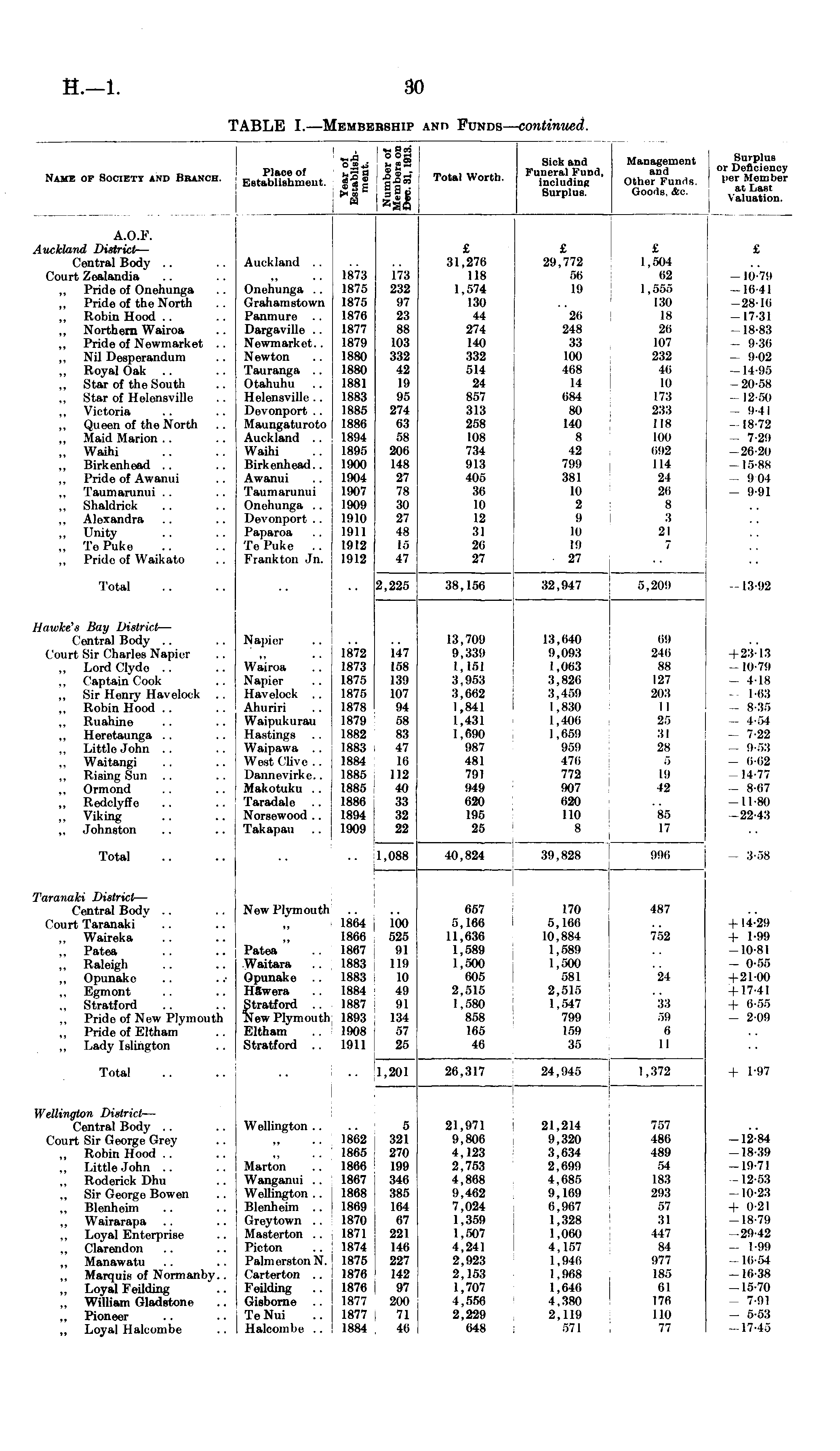 Name of Society and Branch. Place of Establishment. 1 «- 8°» ♦.JO ° °g *■ *r 9 JO ® rH cu s a anTotal Worth. Sick and Management Surplus Funeral Fund, and °*R e £ c \ e ','£. including Other Funds. P er Member Surplus. Goods, Ac. vatartton. A.O.F. Auckland District — Central Body Court Zealandia ,, Pride of Onehunga „ Pride of the North „ Robin Hood .. ,, Northern Wairoa „ Pride of Newmarket .. ,, Nil Desporandum „ Royal Oak ,, Star of the South ,, Star of Helensville ,, Victoria ,, Queen of the North „ Maid Marion „ Waihi ,, Birkenhead „ Pride of Awanui ,, Taumarunui .. ,, Shaldrick ,, Alexandra „ Unity „ Te Puke ,, Prido of Waikato Auckland .. Onehunga .. Graham stown Panmure Dargaville .. Newmarket.. Newton Tauranga .. Otahuhu Helensville .. Devonport .. Maungaturoto Auckland .. Waihi Birkenhead.. Awanui Taumarunui Onehunga .. Devonport .. Paparoa Te Puke .. Frankton .In. 1873 1875 1875 1870 1877 1879 1880 1880 1881 1883 1885 1886 1894 1895 1900 1904 1907 1909 1910 1911 1912 1912 173 232 97 23 88 103 332 42 19 95 274 63 58 200 148 27 78 30 27 48 15 47 £ 31,276 118 1,574 130 44 274 140 332 514 24 857 313 258 108 734 913 405 30 10 12 31 86 27 £ 29,772 50 19 20 248 33 100 468 14 084 80 140 8 42 799 381 10 2 9 10 19 27 £ 1,504 62 1,555 130 18 26 107 232 40 10 173 233 118 100 092 114 24 20 8 3 21 7 £ -10-79 -16-41 -28-10 -17-31 -18-83 - 9-36 - 9-02 14-95 20-58 -12-50 9-41 18-72 7-29 26-20 -15-88 901 - 9-91 Total 2,225 38,150 32,947 5.209 13-92 Hawke's Bay District — Central Body Court Sir Charles Napier „ Lord Clydo .. ,, Captain Cook ,, Sir Henry Havelock ,, Robin Hood „ Ruahine „ Heretaunga .. ,, Little John .. ,, Waitangi ,, Rising Sun .. ,, Ormond „ Redclyffo ,. Viking „ Johnston Napier Wairoa Napier Havelock .. Ahttriri Waipukurau Hastings .. Waipawa .. West ('live . . Dannevirke.. Makottiku .. Taradale Norsewood .. Takapati 1872 1873 1875 1875 1878 1879 1882 1883 1884 1885 1885 1886 1894 1909 147 158 139 107 94 58 83 47 16 112 40 33 32 22 13,709 9.339 1,151 3,953 3,002 1,841 1,431 1,690 987 481 791 949 020 195 25 i 13,640 9,093 I .003 3,826 3.459 1,830 1,400 1.059 959 470 772 907 690 110 8 09 210 88 127 203 II 25 31 28 5 19 42 85 17 | 23-13 10-79 - 418 I 03 8-96 4-64 - 7-22 9-53 002 -14-77 8-67 II-SO -22-43 Total 1,088 40,824 39,828 996 3-58 Taranaki District — Central Body Court Taranaki ,, Waireka „ Patea „ Raleigh Opunake Egmont Stratford ,, Pride of New Plymouth „ Pride of Eltham „ Lady Islington New Plymouth 1864 1866 Patea .. 1867 Waitara 1883 Opunake .. 1883 H8wera .. 1884 Stratford .. 1887 New Plymouth 1893 Eltham . . 1908 Stratford .. 1911 100 525 91 119 10 49 91 134 57 25 657 5,166 11,636 1,589 1,500 605 2,515 1,580 858 165 46 170 5,166 10.884 1,589 1,500 581 2,515 1,547 799 159 35 487 752 24 33 59 6 II + 14-29 1-99 -10-81 0-55 + 21-00 + 17-41 . 0-55 - 209 Total 1,201 26,317 24,945 1.372 + 1-97 Wellington District — Central Body Court Sir George Grey ,, Robin Hood .. ,, Little John .. ,, Roderick Dhu Sir George Bowen „ Blenheim „ Wairarapa ,, Loyal Enterprise „ Clarendon ,, Manawattt „ Marquis of Normanby.. ,, Loyal Feilding ,, William Gladstone „ Pioneer „ Loyal Halcombe Wellington .. .. 1862 1865 Marton .. 1866 Wanganui .. 1867 Wellington .. 1868 Blenheim .. 1869 Greytown .. 1870 Masterton .. 1871 Picton .. 1874 Palmerston N. 1875 Carterton .. 1876 Feilding .. 1876 Gisbome 1877 TeNui .. 1877 Halcombe .. I 1884 5 321 270 199 346 385 164 67 221 146 227 142 97 200 71 46 21,971 9,806 4,123 2,753 4,868 9,462 7,024 1,359 1,507 4,241 2.923 2,153 1,707 4,556 2,229 648 21,214 9,320 3,634 2,099 4,685 9,169 6,967 1,328 1,060 4,157 1,940 1.908 1,040 4,380 2,119 571 757 486 489 54 183 293 57 31 447 84 977 185 61 176 110 77 -12-84 -18-39 -19-71 12-53 10-23 + 0-21 -18-79 29-42 1-99 16-54 10-38 -15-70 - 7-91 - 5-53 -17-45