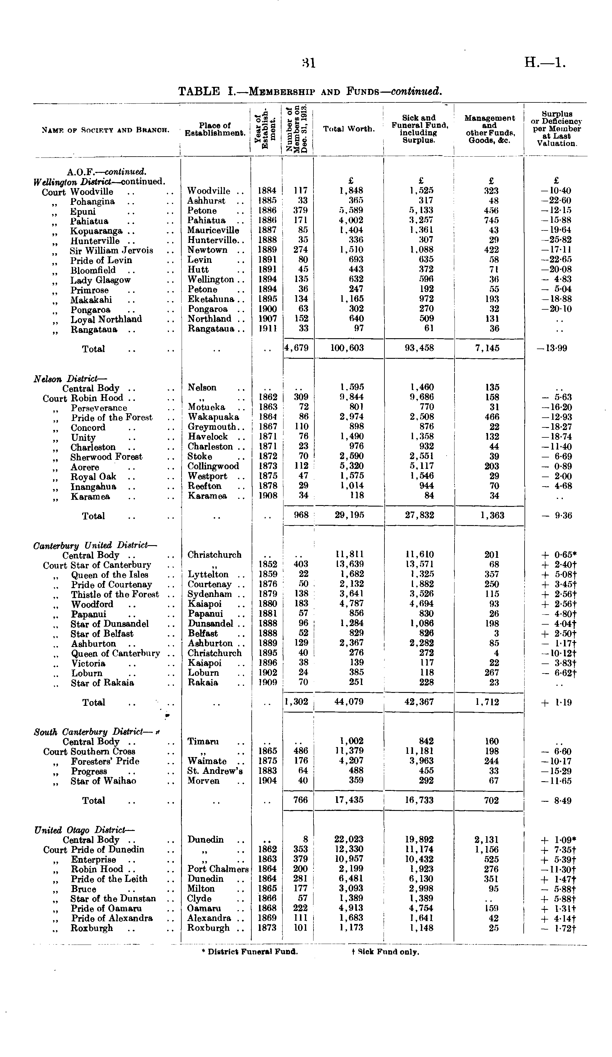 Name of Socikty and Branch. Place of Establishment. all lid v in Total Worth. Sick and Funeral Fund, including Surplus. Management and otber Funds, Goods, &c. Surplus or Deficiency per Member at Last Valuation. A.O.F. — continued. Wellington District —continued. Court Woodville „ Pohangina ,, Kpuni „ Pahiatua „ Kopuaranga .. „ Hunterville .. „ Sir William Jervois ,, Pride of Levin „ Bloomfield „ Lady Glasgow „ Primrose „ Makakahi ,, Pongaroa ,, Loyal Northland ,, Rangataua Woodvillc .. Ashhurst .. Petone l'ahiatua Mauriceville Hunterville.. Newtown .. Levin Hutt Wellington .. Petone Eketahuna .. Pongaroa .. Northland .. Rangataua .. 1884 1 886 1886 1886 1887 1888 1889 1891 1891 1894 1894 1895 1900 1907 1911 117 33 379 171 85 35 274 80 45 135 36 134 63 152 33 £ 1.848 365 5,589 4.002 1.404 336 1,510 693 443 632 247 1. 165 302 640 97 £ 1,525 317 5, 133 :i. 257 1.361 307 1.088 635 372 .".'Hi 192 978 270 509 61 £ 323 48 456 74"> 43 29 422 58 71 36 55 193 32 131 36 £ -10-40 -22-60 - 1215 -15-88 -19-64 -25-82 -17-11 -22-65 -2008 - 4-83 - 504 -18-88 -80-10 Total 4,679 100,603 93.458 7,145 -13-99 Nelson District— Central Body Court Robin Hood .. ,, Perseverance „ Pride of the Forest ,, Concord „ Unity ,, Charleston „ Sherwood Forest „ Aorere „ Royal Oak .. „ Inangahua „ Karamea Nelson Motueka Wakapuaka Greymouth.. Havelock .. Charleston .. Stoke Collingwood Westport .. Reef ton Karamoa 1862 1863 1864 1867 1871 1871 1872 1873 1875 1878 1908 309 72 86 110 76 23 70 112 47 29 34 1,595 9,844 801 2.974 898 1,490 976 2,590 5,320 1,576 1,014 118 1,460 9,686 770 2.508 876 1,368 932 2,551 5,117 I. r>46 944 84 135 158 31 466 22 132 44 39 203 29 70 34 - 5-63 -16-20 -12-93 -18-27 -18-74 -11-40 - 6-69 - 0-89 - 200 - 4-68 Total 968 29,195 27,832 1,363 - 9-36 Canterbury United District — Central Body Court Star of Canterbury ,, Queen of the Isles Pride of Courtenay .. Thistle of the Forest .. .. Woodford Papanui Star of Dunsandel .. Star of Belfast Ashburton Queen of Canterbury .. Victoria Loburn Star of Rakaia Christchurch Lyttelton .. Courtenay .. Sydenham .. Kaiapoi Papanui Dunsandel .. Belfast Ashburton .. Christchurch Kaiapoi Loburn Rakaia 1852 1859 1876 187!) 1880 1881 1888 1888 1889 1895 1896 l<102 1909 403 22 r>0 138 183 .-,7 96 : 52 129 40 38 24 70 11,811 13,639 1,683 2,132 3.641 4.787 856 1.284 829 2.367 271) 139 385 251 11,610 1 :i. 571 1.325 1.882 3.526 4. (i<14 830 1,086 826 2,282 272 117 118 228 201 68 357 250 115 93 26 198 3 85 4 22 267 23 + 0-65* + 2-40t + 5-08f + 3-45f + 2-56t + 2-561- - 4-80f - 4-04-j- + 2-50t - M7f -10-12f - 3-83f - 6-62f Total 1,302 44,079 42,367 1.712 + 1-10 p South Canterbury District — i< Central Body Court Southern Cross „ Foresters' Pride ,, Progress „ Star of Waihao Timaru 1,002 11,379 4.207 488 359 842 11,181 3,963 455 292 - 6-60 — 1017 -15-29 -11-66 Waimate .. St. Andrew's Morvon 1868 1875 1883 1904 486 176 64 40 160 198 244 33 67 Total 766 17,435 16,733 702 - 8-49 United Otago District — Central Body Court Pride of Dunedin ,, Enterprise „ Robin Hood .. „ Pride of the Leith „ Bruce ,, Star of the Dunstan „ Pride of Oamaru ,, Pride of Alexandra Roxburgh Dunedin Port Chalmers Dunedin Milton Clyde Oamaru Alexandra .. Roxburgh .. 1862 1863 1864 1864 1865 1866 1868 1869 1873 8 353 379 200 281 177 57 222 111 101 22,023 12,330 10,957 2,199 6,481 3,093 1,389 4,913 1,683 1,173 19,892 11,174 10,432 1,928 8,180 2,998 1,389 4. 7M 1.641 1,148 2,131 1,156 525 276 351 95 + 109* + 7-35f + 5-39f -ll-30t + l-47f - 5-88f + 5-88f + l-31t + 4-14t - l-72f 159 42 25 • District Fi iner&l Fi ind. t Sick Fnnii only.