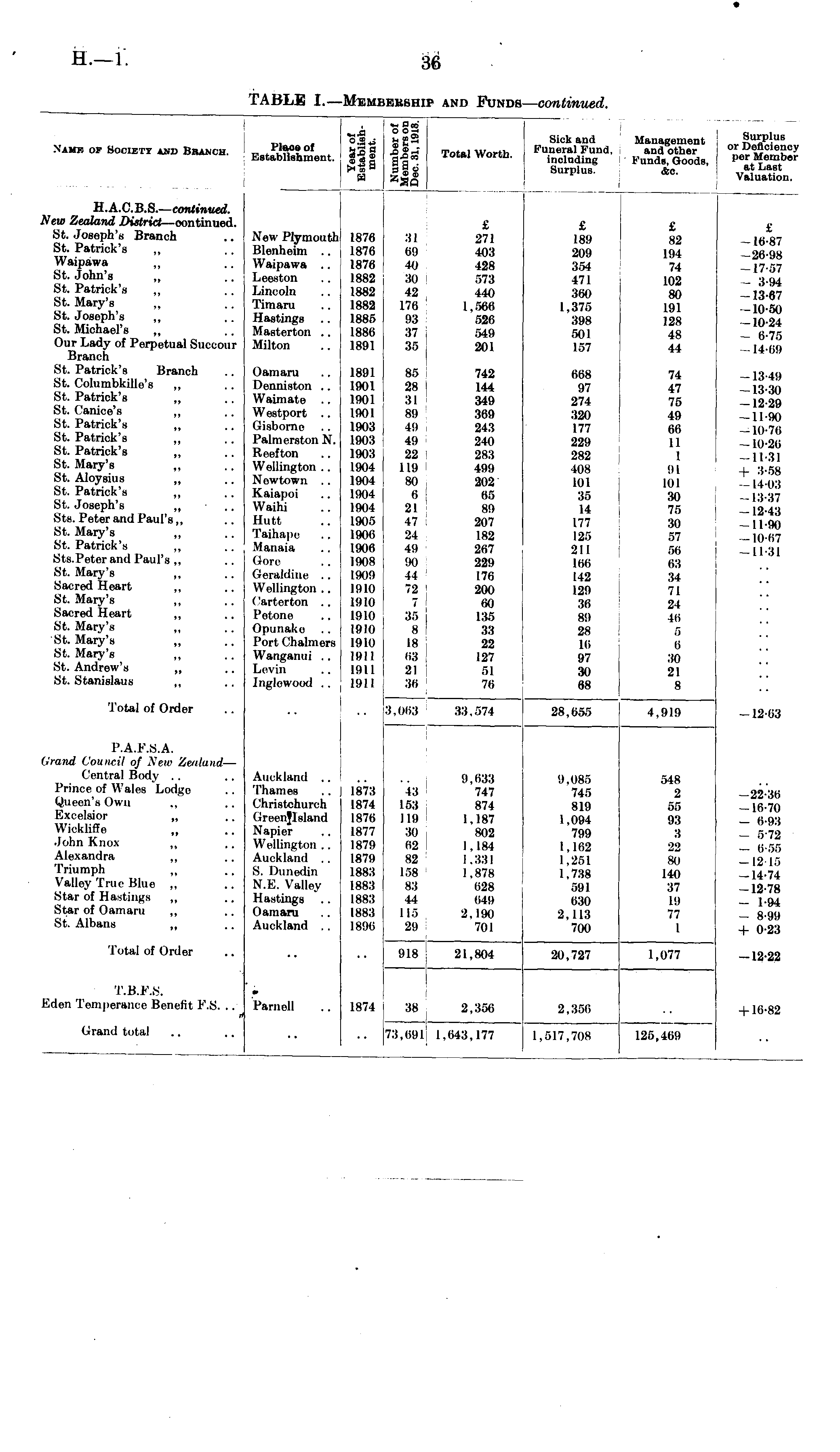Name of Society and Branch. a Place of 1,50 Establishment. J« 2 I t* » S M CM Boo °°a! ■§.§S Total Worth. sa u - Sick and Management Funeral Fund, and other including Funds, Goods, Surplus. &c. Surplus or Deficiency per Member at Last Valuation. H.A.C.B.S.— continued. New Zealand District —continued. St. Joseph's Branch St. Patrick's Waipawa ,, St. John's „ St. Patrick's St. Mary's „ St. Joseph's ,, St. Michael's „ Our Lady of Perpetual Succour Branch St. Patrick's Branch St. Columbkille's ,, St. Patrick's St. Canice's ,, St. Patrick's ,, St. Patrick's St. Patrick's St. Mary's St. Aloysius „ St. Patrick's St. Joseph's ,, Sts. Peter and Paul's „ St. Mary's „ St. Patrick's „ Sts.Peter and Paul's „ St. Mary's „ Sacred Heart ,, St. Mary's „ Sacred Heart „ St. Mary's „ St. Mary's „ St. Mary's „ St. Andrew's „ St. Stanislaus ,, New Plymouth Blenheim .. Waipawa .. Leeston Lincoln Timaru Hastings Masterton .. Milton Oamaru Denniston .. Waimate Westport .. Gisborne Palmerston N. Reefton Wellington .. Newtown .. Kaiapoi Waihi Hutt Taihape Manaia Gore Coraliline .. Wellington .. Carterton .. Petone Opunake Port Chalmers Wanganui .. Levin Inglewood .. 1876 1876 1876 1882 1882 1882 1885 1886 1891 1891 1901 1901 1901 1903 1903 1903 1904 1904 1904 1904 1905 1006 1906 I (HIS 1909 1910 1910 1910 1910 1910 1911 1911 1911 31 69 40 30 42 176 93 37 35 85 28 31 89 49 49 22 119 80 6 i 21 17 24 49 90 44 72 18 03 21 36 £ 271 403 428 573 440 1,566 520 549 201 742 144 349 309 243 240 283 499 202 05 89 207 182 207 229 176 200 60 135 33 22 127 51 70 £ 189 209 354 471 360 1.375 398 501 157 668 97 274 320 177 229 282 408 101 36 14 177 125 211 IliO 142 129 30 89 28 10 97 30 68 £ 82 194 74 102 80 191 128 48 44 74 47 75 49 66 11 1 91 101 30 75 30 57 66 63 34 71 24 40 5 ti :so 21 8 £ - 10-87 -26-98 -17-57 3-94 -13-67 -10-50 -10-24 0-75 1409 -13-49 -13-30 -12-29 11-90 -10-76 -10-26 11-31 + 3-58 -1403 13-37 1213 -11-90 10-07 -11-31 I Total of Order 3.003 33.574 28,055 4.919 -12-63 P.A.F.S.A. Grand Council nf Xcir Zealand — ('entral Body Prince of Wales Lodge Queen's Ow n „ Excelsior „ Wiekliffe John Kno.v „ Alexandra ,, Triumph „ Valley True Blue „ Star of Hastings ,, Star of Oamaru „ St. Albans „ Auckland .. Thames Christohuroh GreenJIsland Napier Wellington .. Auckland .. S. Dunedin N.E. ValleyHastings Oamaru Auckland .. 1873 1874 1876 1877 1879 1879 1883 1883 1883 1883 1890 43 I 53 119 30 02 82 158 83 44 115 29 9.033 747 874 1.187 802 1,184 1.331 I . 878 028 0(9 2. 190 701 9,085 745 819 1.094 799 1,162 1.251 1.738 591 630 2.113 700 548 2 or, 93 3 22 80 140 37 19 77 1 22-30 -16-70 - 0-93 - 5-72 0-55 -1216 -14-74 -12-78 1-94 - 8-99 + 0-23 Total of Order 918 21.804 20,727 1,077 -12-22 T.B.F.S. Eden Temperance Benefit F.S. .. ii Parnell + 16-82 1874 38 2.350 2.350 Grand total 73.091 I.043.177 1,517,708 125,409