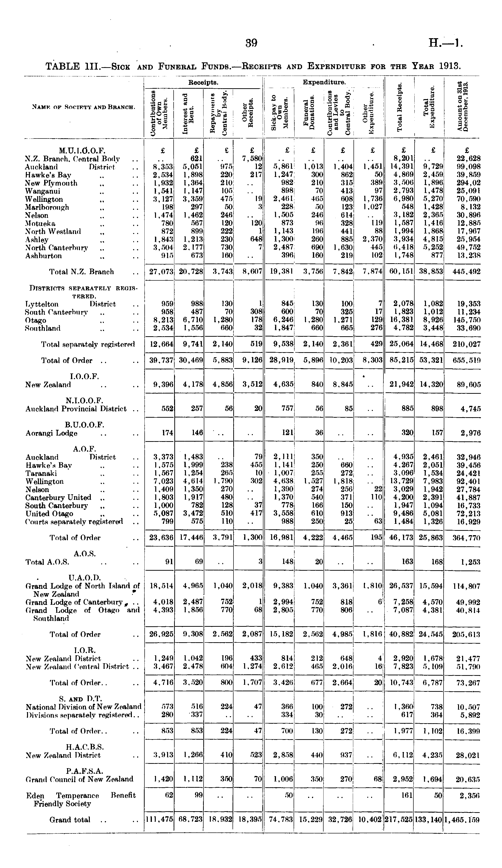 TABLE III. —Sick and Funeral Funds.—Receipts and Expenditure for the Year 1913.