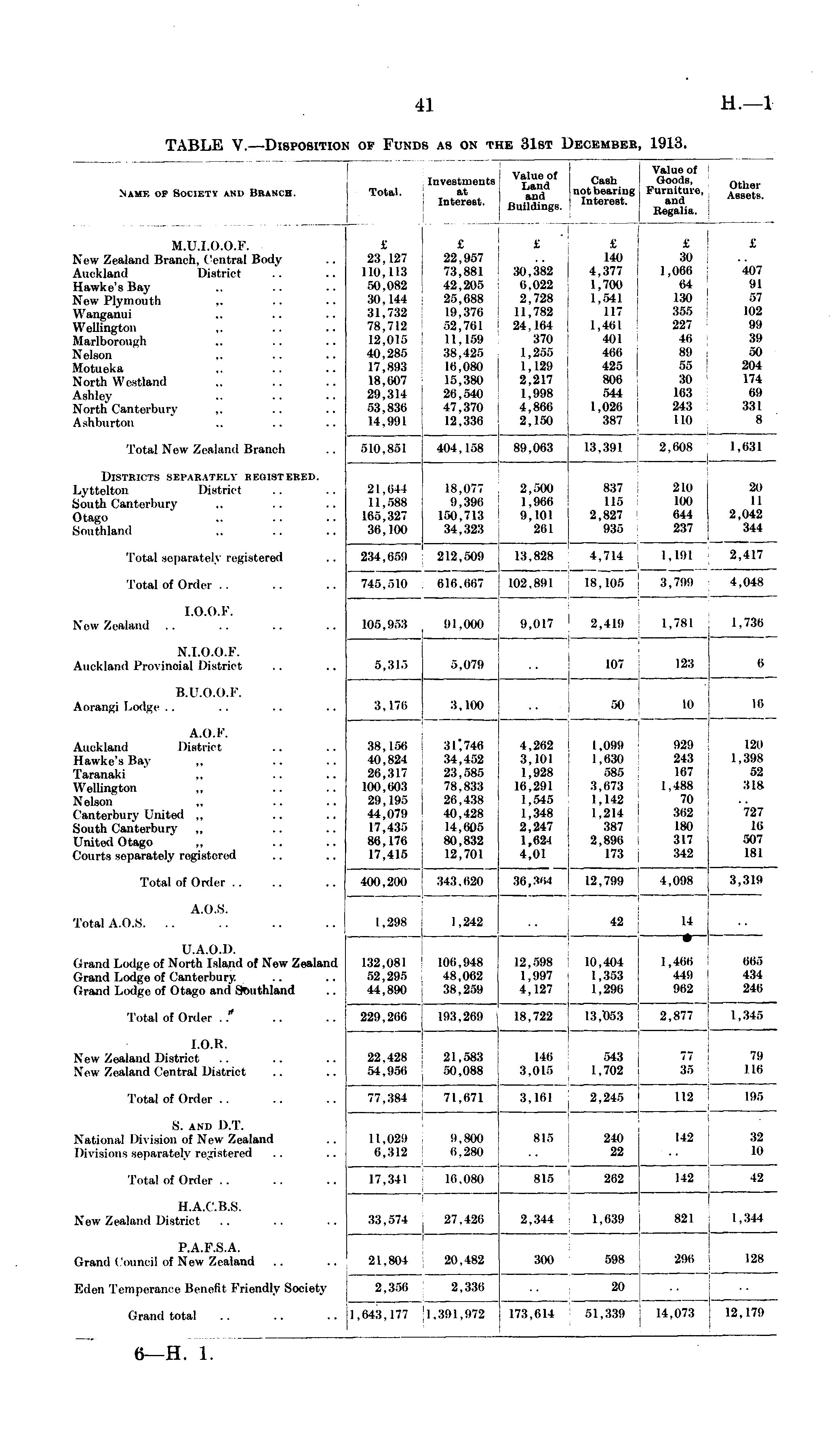 Name of Society anh Branch. Total. investments Valu.ot T . at . and Interest. Bulldin g S . Casb not bearing Interest. Value of Goods, Furniture, and Begalia. Otber Assets. M.U.I.O.O.F. New Zealand Branch. Central Body Auckland District Hawke's BayNew Plymouth Wanganui Wellington Marlborough Nelson ,. Motueka North Westlan.l Ashley North Canterbury ,. Ashburton £ 23,127 110,113 50.082 30.144 31.732 78.712 12.015 40,285 17.893 18,607 29.314 53.830 14.991 £ £ 22,957 ! 73,881 i 30,382 42,205 6.022 25,688 2,728 19,376 I 11,782 52,701 24.104 11,159 370 38,425 1,255 16,080 ! 1,129 15,380 ' 2,217 26,540 : 1.998 47.370 4,866 12.330 2,150 £ 140 4,377 1,700 1.541 117 1,401 401 400 425 806 544 1,020 387 £ 30 1.066 64 ; 130 366 227 46 89 : 55 30 103 243 110 £ 407 91 57 102 99 39 50 204 174 69 331 8 Total New Zealand Branch 510,851 510,851 404,158 89,063 404,158 89,063 13,391 2,608 1,631 Districts separately reoistered. Lyttelton District South Canterbury Otago Southland 21.044 11.588 165,327 36,100 18,077 2,800 9,390 1.900 1.50.713 9.101 34.323 201 i ! 21.044 1 I.588 165,327 36,100 18,077 9,390 1.50.713 34.323 2.5(H) 1.900 9.101 201 837 115 2,827 935 210 20 100 II 044 2,042 237 344 Total separately registered 234,659 234,659 212,509 I 13.828 ' I 212,509 13.828 4.714 1.191 2,417 Total of Order 745,510 616.607 102.891 102.891 18,105 745.510 616,667 3,799 4,048 I.O.O.F. New Zealand 105.953 105.953 91,000 9.017 91,(HH) 9.017 2,419 1,781 i 1.730 N.I.O.O.F. Auckland Provincial District 5,315 5,079 123 5,315 5.079 107 0 B.U.O.O.F. -l Aorangi Lodge 3,176 3.176 3,100 3,100 SO io It; A.O.F. Auckland District Hawke's Bay Taranaki Wellington „ Nelson Canterbury United ,, South Canterbury ,, United Otago Courts separately registered 38,156 40,824 26,317 100,603 29,195 44,079 17,435 86.176 17,415 38,156 40,824 26,317 100,603 29,195 44,079 17,435 86.176 17,415 31'. 740 4,202 34,452 3,101 23,585 1,928 78,833 16,291 26,438 1,545 40,428 1,348 14.605 2,247 80,832 1,624 12,701 4,01 31', 740 34,452 23,585 78.833 26,438 40,428 14,605 80,832 12,701 4,202 3,101 1,928 16,291 1,545 1,348 2,247 1,624 4,01 1,099 1,630 585 3.673 1,142 1.214 387 2,890 173 929 243 167 j 1,488 I 70 ' 302 180 317 342 ! 120 1,398 52 318 727 10 .507 181 Total of Order 400,200 400,200 343.620 36,364 I 343.020 36,364 12.799 4.098 3,319 A.O.S. Total A.O.S. 1.298 1.298 1,242 J . 1,242 42 14 U.A.O.D. Grand Lodge of North Island of Now Zealand Grand Lodge of Canterbury. Grand Lodge of Otago and Southland 132,081 52,295 44.8(H) 132,081 52,295 44.8(H) _i 1 106,948 12,598 48,062 1.997 38,259 4,127 100,948 18,002 38,259 12,598 1.997 4,127 10,404 1,353 1,296 1,400 449 962 666 434 240 Total of Order . * 229.200 229.200 193.269 18,722 193.269 18,722 13,053 2,877 j 1,345 I.O.R. New Zealand District New Zealand Central District 22.428 .54.950 22.428 .54.950 21,583 146 50.088 3.015 21.583 .50,088 146 3.015 .543 1,702 77 35 79 110 Total of Order .. 77,384 77.384 71,671 3,161 71,671 3,101 2,245 112 196 S. and D.T. National Division of New Zealand Divisions separately registered 11,029 0,312 11,029 0,312 9.800 815 0.280 9,800 0.280 815 240 22 112 32 10 Total of Order 17,341 17.341 16,080 815 I 10.080 815 262 142 12 H.A.C.B.S. N'ew Zealand District 33,574 27.420 2.344 821 1.344 33,574 27.420 2.344 1,639 P.A.F.S.A. Grand ('oun.il of New Zealand 21.804 _ 20.482 300 300 290 128 21.804 20.482 598 Eden Temperance Benefit Friendly Society 2,356 2.356 2,336 2.336 20 " Grand total .. . . .. 1, 1,643,177 1.391.972 ,643,177 1,391,972 173.014 173.014 51,339 14,073 12,179
