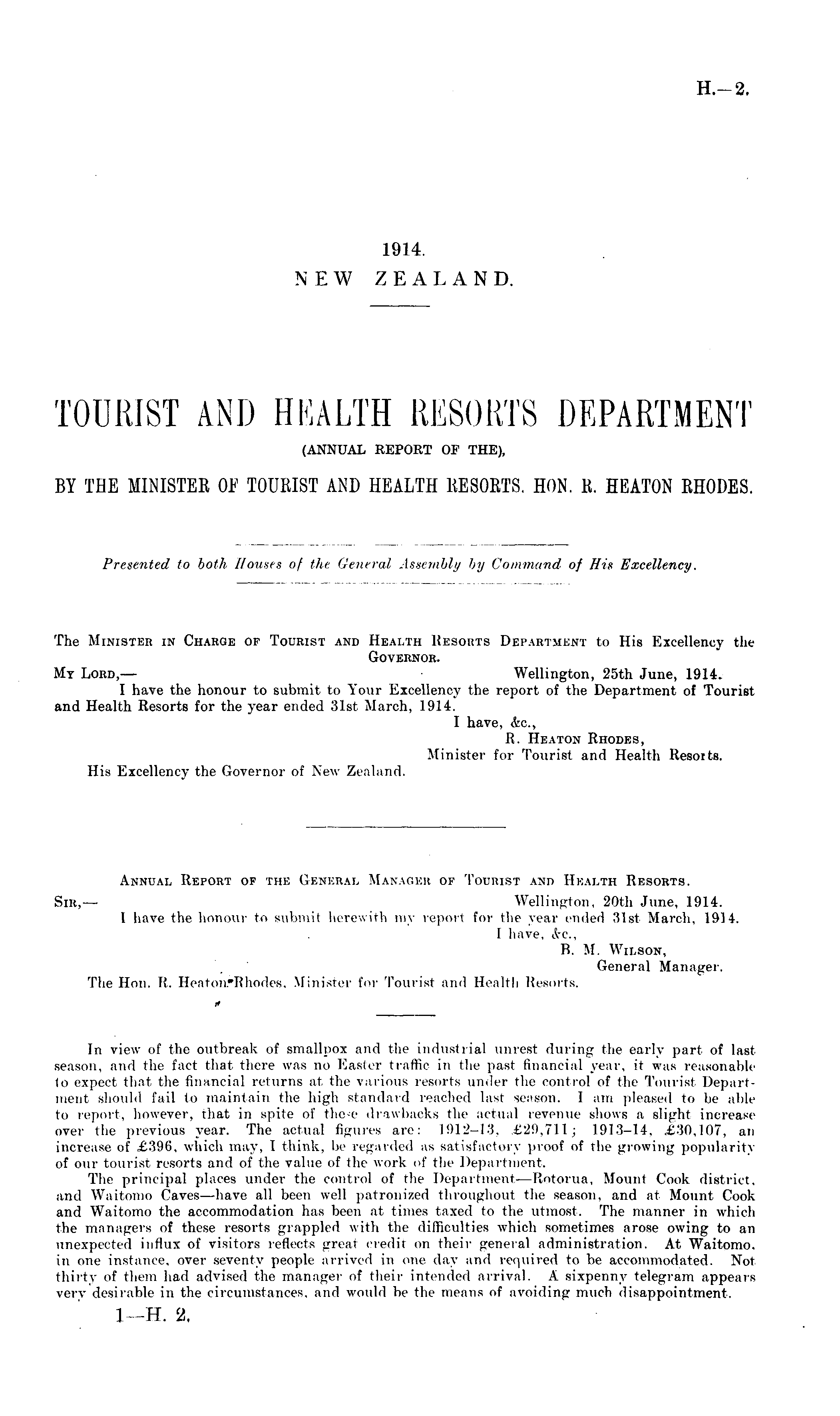 Annual Report of the General Manager of Tourist and Health Resorts. Sir,— Wellington, 20th June, 1914. I have the honour to submit herewith my report for t!io year ended -'Mst March, 1914. I have, <fee., B. M. Wilson, General Manager. The Hon. El. HeatonTßhodes, Minister for Tourist and Health Resorts. i> In view of the outbreak of smallpox and the industrial unrest during the early part of last season, and the fact that there was no Easter traffic in the pas! financial year, it was reasonable in expect that the financial returns at the various resorts under the control of the Tourist Department should fail to maintain the high standard reached last season. 1 am pleased to be able to report, however, that in spite of these drawbacks the actual revenue shows a Blight increase over the previous year. The actual figures are: 1912-13. £29,711; 1913-14. £30,107, an increase of £396, which may, I think, be regarded as satisfactory proof of the growing popularity of our tourist resorts and of the value of the work of the Department. The principal places under the control of the Department— Rotor ua, Mount Cook district, and Waitomo Caves—have all been well patronized throughout the season, and at Mount Cook and Waitomo the accommodation has been at times taxed to the utmost. The manner in which the managers of these resorts grappled with the difficulties which sometimes arose owing to an unexpected influx of visitors reflects great credit on their general administration. At Waitomo, in one instance, over seventy people arrived in one day and required to be accommodated. Not thirty of them had advised the manager of their intended arrival. A sixpenny telegram appears very desirable in the circumstances, and would be the means of avoiding much disappointment.