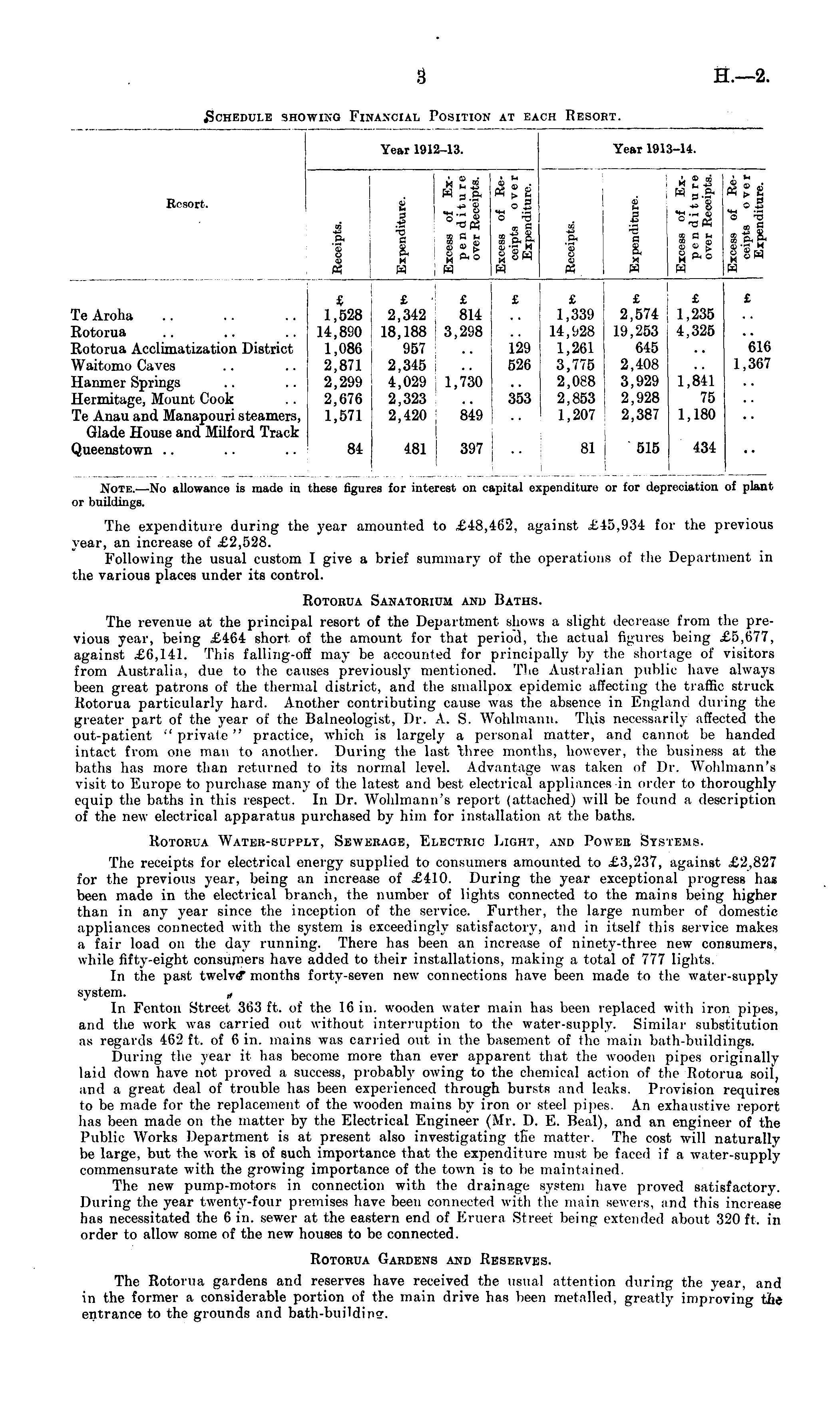 The expenditure during the year amounted to £48,462, against £45,934 for the previous year, an increase of £2,528. Following the usual custom I give a brief summary of the operations of the Department in the various places under its control. Rotorua Sanatorium and Baths. The revenue at the principal resort of the Department shows a slight decrease from the previous year, being £464 short of the amount for that period, the actual figures being £5,677, against £6,141. This falling-off may be accounted for principally by the shortage of visitors from Australia, due to the causes previously mentioned. The Australian public have always been great patrons of the thermal district, and the smallpox epidemic affecting the traffic struck Rotorua particularly hard. Another contributing cause was the absence in England during the greater part of the year of the Balneologist, Dr. A. S. Wohlmann. This necessarily affected the out-patient " private " practice, which is largely a personal matter, and cannot be handed intact from one man to another. During the last three months, however, the business at the bathe has more than returned to its normal level. Advantage was taken of Dr. Wohlmann's visit to Europe to purchase many of the latest and best electrical appliances in order to thoroughly equip the baths in this respect. In Dr. Wohlmann's report (attached) will be found a description of the new electrical apparatus purchased by him for installation at the baths. Rotorua Water-supply, Sewkrage, Electric Light, and Poweb Systems. The receipts for electrical energy supplied to consumers amounted to £.'s,'J"{7, against £2,827 for the previous year, being an increase of £410. During the year exceptional progress has been made in the electrical branch, the number of lights connected to the mains being higher than in any year since the inception of the service. Further, the large number of domestic appliances connected with the system is exceedingly satisfactory, and in itself this service makes a fair load on the day running. There has been an increase of ninety-three new consumers, while fifty-eight consumers have added to their installations, making a total of 777 lights. In the past twelve months forty-seven new connections have been made to the water-supply system. rf In Fenton Street 363 ft. of the 16 in. wooden water main has been replaced with iron pipes, and the work was carried out without interruption to the water-supply. Similar substitution as regards 462 ft. of 6 in. mains was carried out in the basement of the main bath-buildings. During the year it has become more than ever apparent that the wooden pipes originally laid down have not proved a success, probably owing to the chemical action of the Rotorua soil", and a great deal of trouble has been experienced through bursts and leaks. Provision requires to be made for the replacement of the wooden mains by iron or steel pipes. An exhaustive report has been made on the matter by the Electrical Engineer (Mr. D. E. Beal), and an engineer of the Public Works Department is at present also investigating the matter. The cost will naturally be large, but the work is of such importance that the expenditure must be faced if a water-supply commensurate with the growing importance of the town is to lie maintained. The new pump-motors in connection with the drainage system have proved satisfactory. During the year twenty-four premises have been connected with the main sewers, and this increase has necessitated the 6 in. sewer at the eastern end of Eruera Street being extended about 320 ft. in order to allow some of the new houses to be connected. Rotorua Gardens and Reserves. The Rotorua gardens and reserves have received the usual attention during the year, and in the former a considerable portion of the main drive has been metalled, greatly improving the entrance to the grounds and bath-buildine.