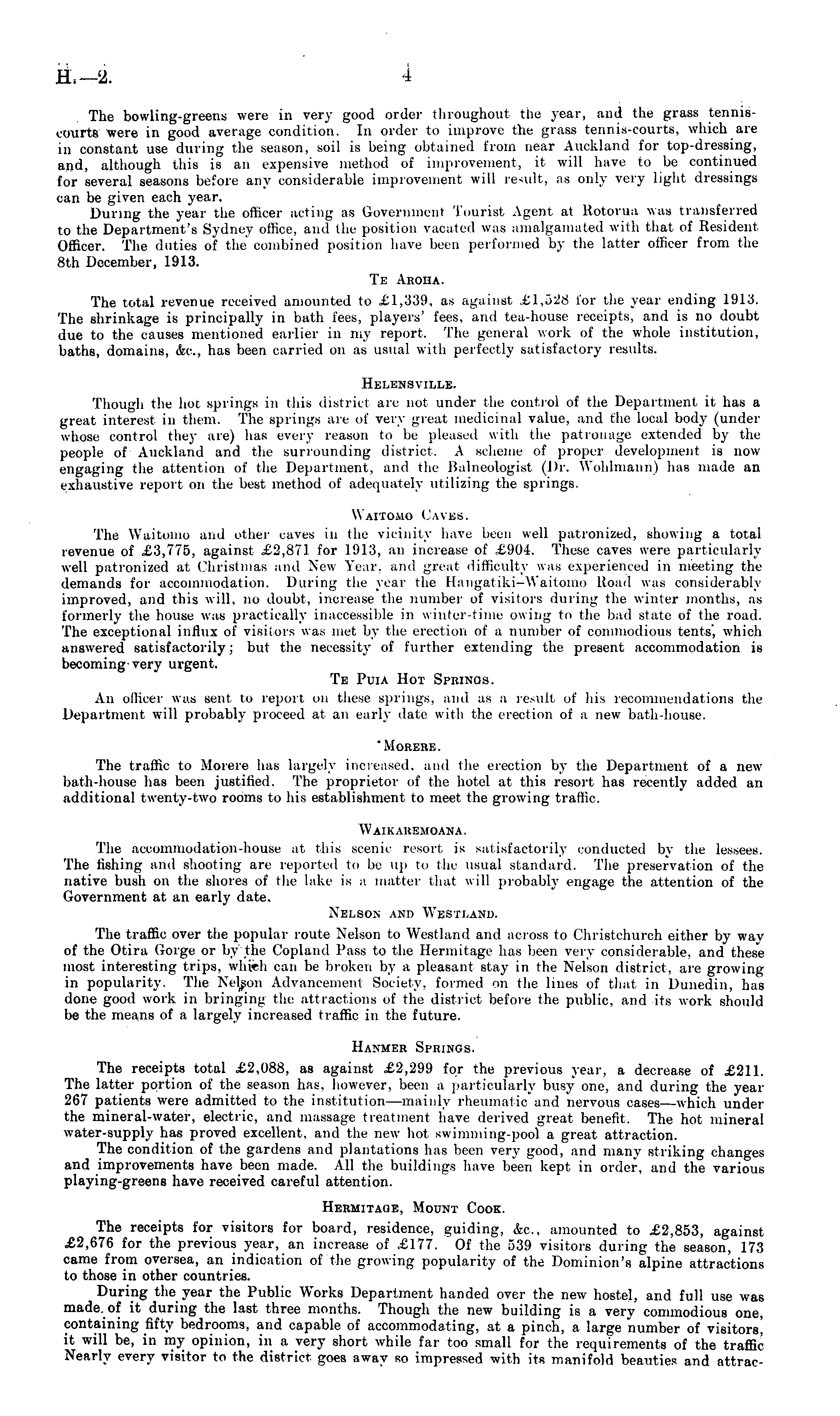 The bowling-greens were in very good order throughout the year, and the grass tenniscourts were in good average condition. In order to improve the grass tennis-courts, which are in constant use during the season, soil is being obtained from near Auckland for top-dressing, and, although this is an expensive method of improvement, it will have to be continued for several seasons before any considerable improvement will result, as only very light dressings can be given each year. During the year the officer acting as Government Tourist Agent at Rotorua was transferred to the Department's Sydney office, and the position vacated was amalgamated with that of Resident Officer. The duties of the combined position have been performed by (he latter officer from the Bth December, 1913. Te Aroha. The total revenue received amounted to £1,339, as against £1,.j1'8 lor the year ending 1913. The shrinkage is principally in bath fees, players' fees, and tea-house receipts, and is no doubt due to the causes mentioned earlier in my report. The general work of the whole institution, baths, domains, &c, has been carried mi as usual with perfectly satisfactory results. Helensville. Though the hot springs in this district are not under the control of the Department it has a great interest in them. The springs are of very μ-rcat medicinal value, and fhe local body (under whose control they are) has every reason to be pleased with the patronage extended by the people of Auckland and the surrounding district. A scheme of proper development is now engaging the attention of the Department, and the Balneologist (Dr. Wbhlmann) has made an exhaustive report on the best method of adequately utilizing the springs. Waitomo (.'avks. The Waitomo and other caves in the vicinity have been well patronized, showing a total revenue of £3,775, against £2,871 for 1913, an increase of £904. These caves were particularly well patronized at Christinas and New Year, am! greal difficulty was experienced in meeting the demands for accommodation. During the year the Bangatiki—Waitomo Road was considerably improved, and this will, no doubt, increase fche number of visitors during the winter months, as formerly the house was practically inaccessible in winter-time owing t:> the had state of the road. The exceptional influx of visitors was met by the erection of a number of commodious tents', which answered satisfactorily; but the necessity of further extending the present accommodation is becoming very urgent. Te Puia Hot Sprinos. An officer was sent to report on these springs, and as a result of his recommendations the Department will probably proceed at an early date with the erection of a new bath-house. 'Morere. The traffic to Morere has largely increased, and the erection by the Department of a new bath-house has been justified. The proprietor of the hotel at this resort has recently added an additional twenty-two rooms to his establishment to meet the growing traffic. Waikaremoana. The accommodation-house at this scenic resort is satisfactorily conducted by the lessees. The fishing and shooting are reported to be up to the usual standard. The preservation of the native bush on the shores of the lake is a matter that will probably engage the attention of the Government at an early date. Nelson and Westland. The traffic over the popular route Nelson to Westland and across to Christchurch either by way of the Otira Gorge or by the Copland I , ass to the Hermitage has been very considerable, and these most interesting tripe, whi«rh can be broken by a pleasant stay in the Nelson district, are growing in popularity. The Nelson Advancement Society, Formed on the lines of thai in Dunedin, has done good work in bringing the attractions of the district before the public, ami its work should be the means of a largely increased traffic in the future. Hanmer Springs. The receipts total £2,088, as against £2,299 for the previous year, a decrease of £211. The latter portion of the season has, however, been a particularly busy one, and during the year 267 patients were admitted to the institution —mainly rheumatic and nervous cases—which under the mineral-water, electric, and massage treatment have derived great benefit. The hot mineral water-supply has proved excellent, and the new hot swimming-pool a great attraction. The condition of the gardens and plantations has been very good, and many striking changes and improvements have been made. All the buildings have been kept in order, and the various playing-greens have received careful attention. Hermitage, Mount Cook. The receipts for visitors for board, residence, guiding, <fee, amounted to £2,853, against £2,676 for the previous year, an increase of .£177. Of the 539 visitors during the season, 173 came from oversea, an indication of the growing popularity of the Dominion's alpine attractions to those in other countries. During the year the Public Works Department handed over the new hostel, and full use was made of it during the last three months. Though the new building is a very commodious one, containing fifty bedrooms, and capable of accommodating, at a pinch, a large number of it will be, in my opinion, in a very short while far too small for the requirements of the traffic Nearly every visitor to the district goes away so impressed with its manifold beauties and attrac-