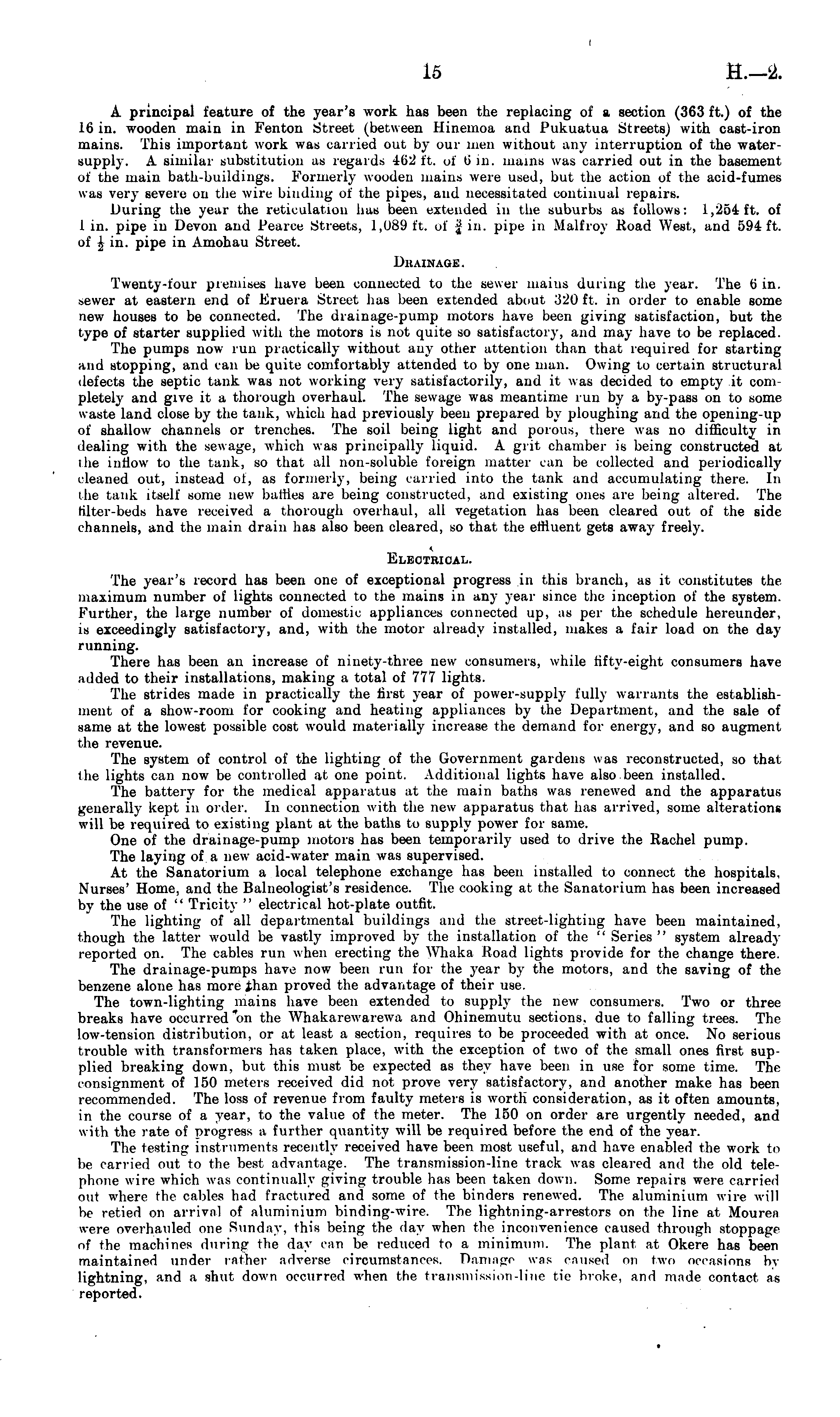 A principal feature of the year's work has been the replacing of a, section (363 ft.) of the 16 in. wooden main in Fenton Street (between Hinemoa and i'ukuatua Streets) with cast-iron mains. This important work was carried out by our men without any interruption of the watersupply. A similar substitution as regards 402 ft. of 0 in. mams was carried out in the basement of the main bath-buildings. Formerly wooden mains were used, but the action of the acid-fumes was very severe on the wire binding of the pipes, and necessitated continual repairs. During the year the reticulation has been extended in the suburbs as follows: 1,254 ft. of 1 in. pipe in Devon and Pearce Streets, 1,089 ft. of 2 in. pipe in Malfroy Road West, and 594 ft. of £ in. pipe in Amohau Street. Drainage. Twenty-four premises have been connected to the sewer mains during the year. The 6 in. sewer at eastern end of Kruera Street has been extended about 320 ft. in order to enable some new houses to be connected. The drainage-pump motors have been giving satisfaction, but the type of starter supplied with the motors is not quite so satisfactory, and may have to be replaced. The pumps now run practically without any other attention than that required for starting and stopping, and can be quite comfortably attended to by one man. Owing to certain structural defects the septic tank was not working very satisfactorily, and it was decided to empty it completely and give it a thorough overhaul. The sewage was meantime run by a by-pass on to some waste land close by the tank, which had previously been prepared by ploughing and the opening-up of shallow channels or trenches. The soil being light and porous, there was no difficulty in dealing with the sewage, which was principally liquid. A grit chamber is being constructed at ihe inllow to the tank, so that all non-soluble foreign matter can be collected and periodically cleaned out, instead oi, as formerly, being carried into the tank and accumulating there. In the tank itself some new baffles are being constructed, and existing ones are being altered. The tilter-beds have received a thorough overhaul, all vegetation has been cleared out of the side channels, and the main drain has also been cleared, so that the effluent gets away freely. Electrical. The year's record has been one of exceptional progress in this branch, as it constitutes the maximum number of lights connected to the mains in any year since the inception of the system, further, the large number of domestic appliances connected up, as per the schedule hereunder, is exceedingl)' satisfactory, and, with the motor already installed, makes a fair load on the day running. There has been an increase of ninety-three new consumers, while fifty-eight consumers have added to their installations, making a total of 777 lights. The strides made in practically the first year of power-supply fully warrants the establishment of a show-room for cooking and heating appliances by the Department, and the sale of same at the lowest possible cost would materially increase the demand for energy, and so augment the revenue. The system of control of the lighting of the Government gardens was reconstructed, so that the lights can now be controlled at one point. Additional lights have also been installed. The battery for the medical apparatus at the main baths was renewed and the apparatus generally kept in order. In connection with the new apparatus that has arrived, some alterations will be required to existing plant at the baths to supply power for same. One of the drainage-pump motors has been temporarily used to drive the Rachel pump. The laying of a new acid-water main was supervised. At the Sanatorium a local telephone exchange lias been installed to connect the hospitals. Nurses' Home, and the Balneologist's residence. The cooking at the Sanatorium has been increased by the use of " Tricity " electrical hot-plate outfit. The lighting of all departmental buildings and the street-lighting have been maintained, though the latter would be vastly improved by the installation of the " Series " system already reported on. The cables run when erecting the Whaka Road lights provide for the change there. The drainage-pumps have now been run for the year by the motors, and the saving of the benzene alone has more Jhan pi-oved the advantage of their use. The town-lighting mains have been extended to supply the new consumers. Two or three breaks have occurred on the Whakarewarewa and Ohinemutu sections, due to falling trees. The low-tension distribution, or at least a section, requires to be proceeded with at once. No serious trouble with transformers has taken place, with the exception of two of the small ones first supplied breaking down, but this must bo expected as they have been in use for some time. The consignment of 150 meters received did not prove very satisfactory, and another make has been recommended. The loss of revenue from faulty meters is worth consideration, as it often amounts, in the course of a year, to the value of the meter. The 150 on order are urgently needed, and with the rate of progress a further quantity will be required before the end of the year. The testing instruments recently received have been most useful, and have enabled the work to In- carried oui to the besi advantage. The transmission-line track was cleared and the old telephone wire which was continually giving trouble lias been taken down. Some repairs were carried mit where the cables had fractured and some of the binders renewed. The aluminium wire will be retied on arrival of aluminium binding-wire. The lightning-arrestors on the line at Mourea were overhauled one Sunday, this being the day when the inconvenience caused through stoppagp of the machines during the day can be reduced to a minimum. The plant at Okere has been maintained under rather adverse circumstances. Damage was caused on two occasions by lightning, and a shut down occurred when the, t
