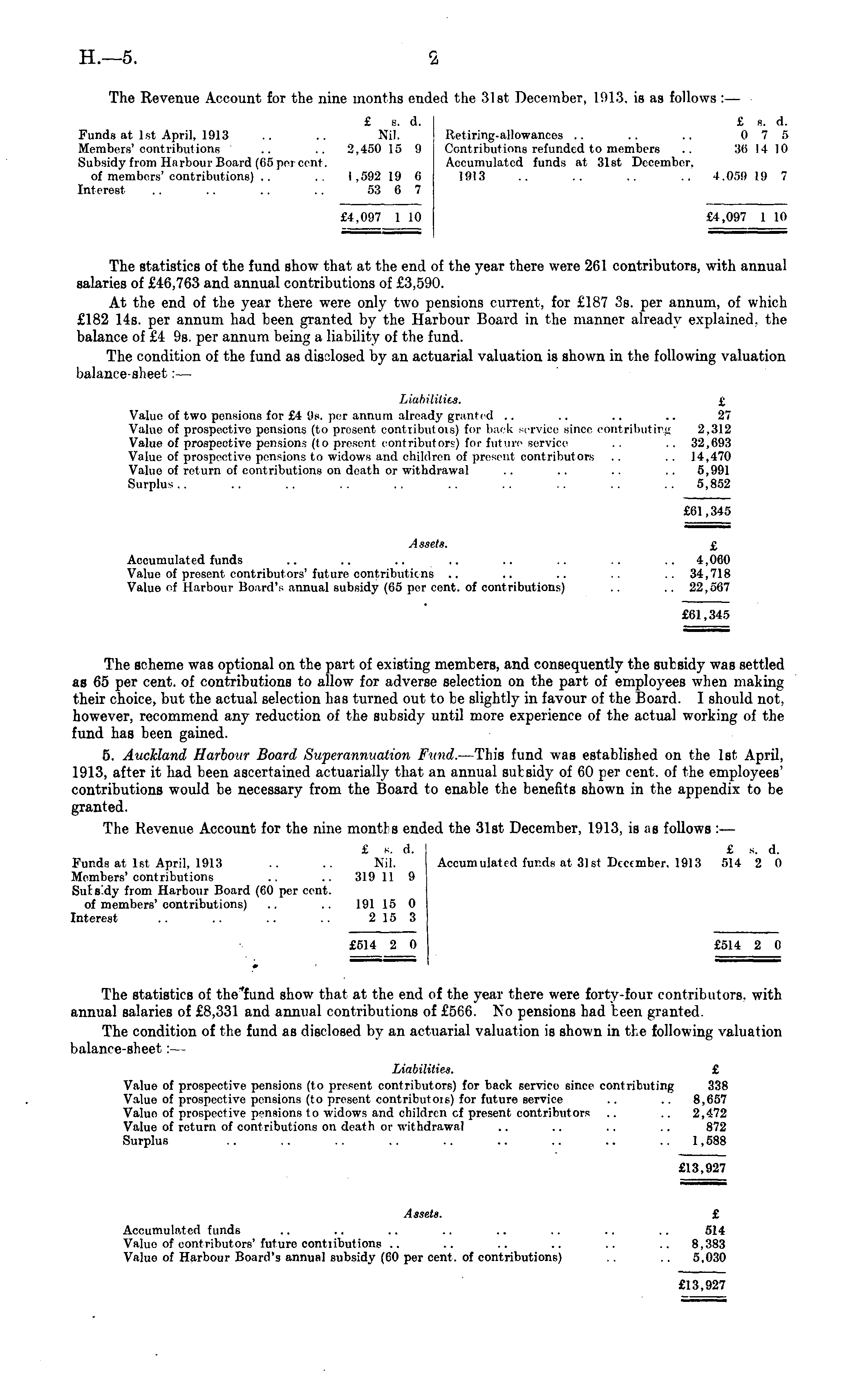 The Revenue Account for the nine months ended the 31st December, 1913, is as follows :— £ s. d. £ s. d. Funds at Ist April, 1913 .. .. Nil. Retiring-allowances .. .. .. 0 7 5 Members'contributions .. .. 2,450 15 9 Contributions refunded to members .. 36 14 10 Subsidy from Harbour Board (65 pei cent. Accumulated funds at 31st December. of members'contributions) .. .. 1,592 19 (i 1913 .. .. .. .. 4.051119 7 Interest . . . . . . . . 53 6 7 £4,097 1 10 £4,097 1 10 The statistics of the fund show that at the end of the year there were 261 contributors, with annual salaries of £46,763 and annual contributions of £3,590. At the end of the year there were only two pensions current, for £187 3s. per annum, of which £182 14s. per annum had been granted by the Harbour Board in the manner already explained, the balance of £4 9s. per annum being a liability of the fund. The condition of the fund as disclosed by an actuarial valuation is shown in the following valuation balance-sheet:— Liabilities. £ Value of two pensions for £4 9s. per annum already granti d .. .. .. .. 27 Value of prospective pensions (to present eontributois) for back service since contributing 2,312 Value of prospective pensions (to present contributors) for future service .. .. 32,093 Value of prospective pensions to widows and children of present contributors . . . . 14,470 Value of return of contributions on death or withdrawal .. .. .. .. 5,991 Surplus.. .. .. .. .. .. .. .. .. .. 5,852 £61,345 Assets. £ Accumulated funds .. .. .. .. .. .. .. .. 4,060 Value of present contributors'future contributions .. .. .. .. .. 34,718 Value of Harbour Board's annual subsidy (65 per cent, of contributions) .. .. 22,567 £61,345 The scheme was optional on the part of existing members, and consequently the subsidy was settled as 65 per cent, of contributions to allow for adverse selection on the part of employees when making their choice, but the actual selection has turned out to be slightly in favour of the Board. I should not, however, recommend any reduction of the subsidy until more experience of the actual working of the fund has been gained. 5. Auckland Harbour Board Superannuation Fund. —This fund was established on the Ist April, 1913, after it had been ascertained actuarially that an annual subsidy of 60 per cent, of the employees' contributions would be necessary from the Board to enable the benefits shown in the appendix to be granted. The Revenue Account for the nine montls ended the 31st December, 1913, is as follows :— £ s. d. £ s. d. Funds at Ist April, 1913 .. .. Nil. Accumulated funds at 81st December, 1913 514 2 0 Members'contributions .. .. 319 11 9 Suls'dy from Harbour Board (60 per cent. of members'contributions) .. .. 191 15 0 Interest .. .. .. .. 2 15 3 £514 2 0 £514 2 0 The statistics of the'fund show that at the end of the year there were forty-four contributors, with annual salaries of £8,331 and annual contributions of £566. No pensions had been granted. The condition of the fund as disclosed by an actuarial valuation is shown in the following valuation lialance-sheet : Liabilities. £ Value of prospective pensions (to present contributors) for back service since contributing 338 Value of prospective pensions (to present eontributois) for future service .. .. 8,657 Value of prospective pensions to widows and children cf present contributors .. .. 2,472 Value of return of contributions on death or withdrawal .. .. .. .. 872 Surplus .. .. .. .. .. .. .. .. ..1,588 £13,927 Assets. £ Accumulated funds .. .. .. .. .. .. .. .. 514 Value of contributors'future contiibutions .. .. .. .. .. .. 8,383 Value of Harbour Board's annual subsidy (60 per cent, of contributions) .. .. 5,030 £13,927