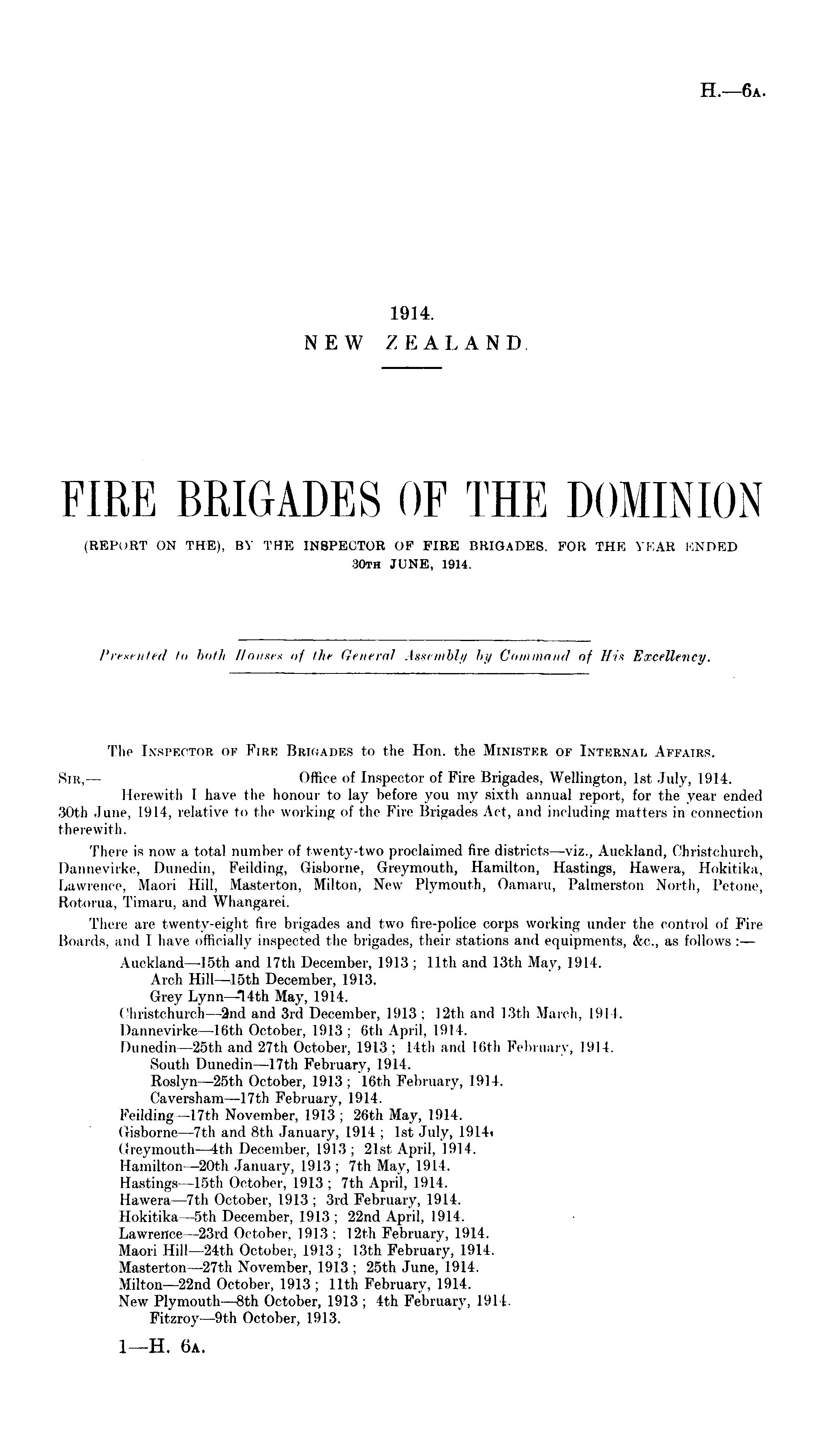 The Inspector ok Fire Brigades to the Hon. the Minister of Internal Affairs. Sir,— Office of Inspector of Fire Brigades, Wellington, Ist July, 1914. Herewith I have the honour to lay before you my sixth annual report, for the year ended 30th June. 1914, relative to the working of the Fire Brigades Act, and including matters in connection therewii h. There is now a total number of twenty-two proclaimed fire districts —viz., Auckland, Christ-church, Dannevirke, Dunedin, Feilding, Gisborne, Greymouth, Hamilton, Hastings, Hawera, Hokitika. Lawrence, Maori Hill, Maeterton, Milton, New Plymouth, Oamaru, Palmerston North, Petone, Rotorua, Timaru, and Whangarei. There are twenty-eight fire brigades and two fire-police corps working under the control of Fire Boards, and I have officially inspected the brigades, their stations and equipments, &c, as follows : — Auckland—lsth and 17th December, 1913 ; 11th and 13th May, 1914. Arch Hill—lsth December, 1913. Grey Lynn— T 4th May, 1914. Cliristchurch—2nd and 3rd December, 1913 ; 12th and 13th March, 1914. Dannevirke—l6th October, 1913 ; 6th April, 191 1. Dunedin—2sth and 27th October, 1913 ; 14th and 16th February, 191). South Dunedin—l7th February, 1914. Roslyn—2sth October, 1913 ; 16th February, l'.H I. Caversham—l7th February, 1914. Feilding—l7th November, 1913 ; 26th May, 1914. Gisborne—7th and Bth January, 1914 ; Ist July, 1914 i Greymouth —4th December, 1913 ; 21st April, 1914. Hamilton—2oth January, 1913 ; 7th May, 1914. Hastings—lsth October, 1913 ; 7th April, 1914. Hawera—7th October, 1913 ; 3rd February, 1914. Hokitika—sth December, 1913 ; 22nd April, 1914. Lawrence—23rd October. 1913 ; 12th February, 1914. Maori Hill—24th October, 1913 ; 13th February, 1914. Masterton—27th November, 1913 ; 25th June, 1914. Milton—22nd October, 1913 ; 11th February, 1914. New Plymouth—Bth October, 1913 ; 4th February, 1914. Fitzroy—9th October, 1913.