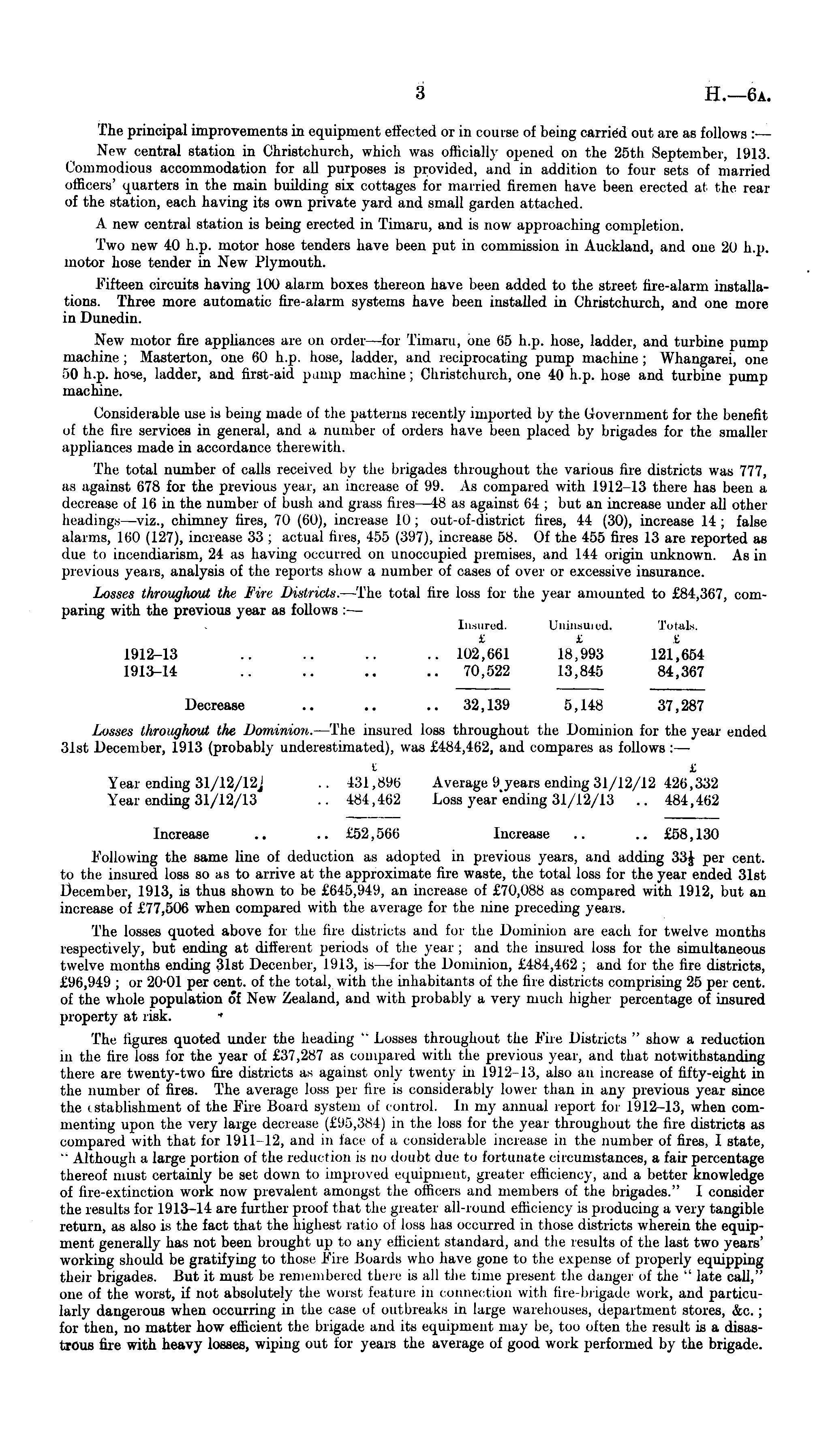 The principal improvements in equipment effected or in course of being carried out are as follows :• — New central station in Christchurch, which was officially opened on the 25th September, 1913. Commodious accommodation for all purposes is provided, and in addition to four sets of married officers' quarters in the main building six cottages for married firemen have been erected at the rear of the station, each having its own private yard and small garden attached. A new central station is being erected in Timaru, and is now approaching completion. Two new 40 h.p. motor hose tenders have been put in commission in Auckland, and one 20 h.p. motor hose tender in New Plymouth. Fifteen circuits having 100 alarm boxes thereon have been added to the street fire-alarm installations. Three more automatic fire-alarm systems have been installed in Christchurch, and one more in Dunedin. New motor fire appliances are on order—for Timaru, one 65 h.p. hose, ladder, and turbine pump machine ; Masterton, one 60 h.p. hose, ladder, and reciprocating pump machine ; Whangarei, one 50 h.p. hose, ladder, and first-aid pump machine; Christchurch, one 40 h.p. hose and turbine pump machine. Considerable use is being made of the patterns recently imported by the Government for the benefit of the fire services in general, and a number of orders have been placed by brigades for the smaller appliances made in accordance therewith. The total number of calls received by the brigades throughout the various fire districts was 777, as against 678 for the previous year, an increase of 99. As compared with 1912-13 there has been a decrease of 16 in the number of bush and grass fires —i Bas against 64 ; but an increase under all other headings—viz., chimney fires, 70 (60), increase L 0; out-of-district fires, 44 (30), increase 14; false alarms, 160 (127), increase 33 ; actual fires, 455 (397), increase 58. Of the 455 fires 13 are reported as due to incendiarism, 24 as having occurred on unoccupied premises, and 144 origin unknown. As in previous years, analysis of the reports show a number of cases of over or excessive insurance. Losses throughout the Fire Districts. —The total fire loss for the year amounted to £84,367, comparing with the previous year as follows : — Insured. Uninsured. Totals. t £ £ 1912-13 .. .. .. .. 102,661 18,993 121,654 1913-14 .. .. .. .. 70,522 13,845 84,367 Decrease .. .. .. 32,139 5,148 37,287 Losses throughout the Dominion. —The insured loss throughout the Dominion for the year ended 31st December, 1913 (probably underestimated), was £484,462, and compares as follows :— £ £ Year ending 31/12/12J .. 431,896 Average 9 years ending 31/12/12 426,332 Year ending 31/12/13 .. 484,462 Loss year'ending 31/12/13 .. 484,462 Increase .. .. £52,566 Increase .. .. £58,130 Following the same line of deduction as adopted in previous years, and adding 33£ per cent, to the insured loss so as to arrive at the approximate fire waste, the total loss for the year ended 31st December, 1913, is thus shown to be £645,949, an increase of £70,088 as compared with 1912, but an increase of £77,506 when compared with the average for the nine preceding years. The losses quoted above for the fire districts and for the Dominion are each for twelve months respectively, but ending at different periods nl the year; and the insured loss for the simultaneous twelve months ending 31st Decenber, 1913, is -for the Dominion, £484,462 ; and for the fire districts, £96,949 ; or 20-01 per cent, of the total, with the inhabitants of the fire districts comprising 25 per cent, of the whole population of New Zealand, and with probably a very much higher percentage of insured property at risk. ' The figures quoted under the heading "' Losses throughout the Fire Districts " show a reduction in the fire loss for the year of £37,287 as compared with the previous year, and that notwithstanding there are twenty-two fire districts as against only twenty in 1912 13, also an increase of fifty-eight in the number of fires. The average loss per fire is considerably lower than in any previous year since the (stablishment of the Fire Board system of control. In my annual report for 1912-13, when commenting upon the very large decrease (£95,384) in the loss for the year throughout the fire districts as compared with that for 1911-12, and in face of a considerable increase in the number of fires, 1 state, '" Although a large portion of the reduction is no doubt due to fortunate circumstances, a fair percentage thereof must certainly be set down to improved equipment, greater efficiency, and a better knowledge of lire-extinction work now prevalent amongst the officers and members of the brigades." 1 consider the results for 1913-14 are further proof that the greater all-round efficiency is producing a very tangible return, as also is the fact that the highest ratio ol loss has occurred in those districts wherein the equipment generally has not been brought up to any efficient standard, and the results of the last two years' working should be gratifying to those Fire Boards who have gone to the expense of properly equipping their brigades. But it must be remembered there is all the time present the danger of the " late call," one of the worst, if not absolutely the worst Feature m connection with fire-brigade work, and particularly dangerous when occurring in the case of outbreaks in large warehouses, department stores, &c. ; for then, no matter how efficient the brigade and its equipment may be, too often the result is a disastrous fire with heavy losses, wiping out for years the average of good work performed by the brigade.